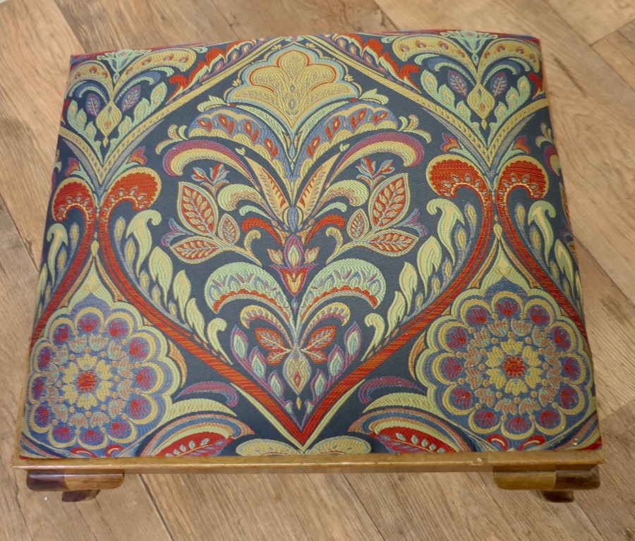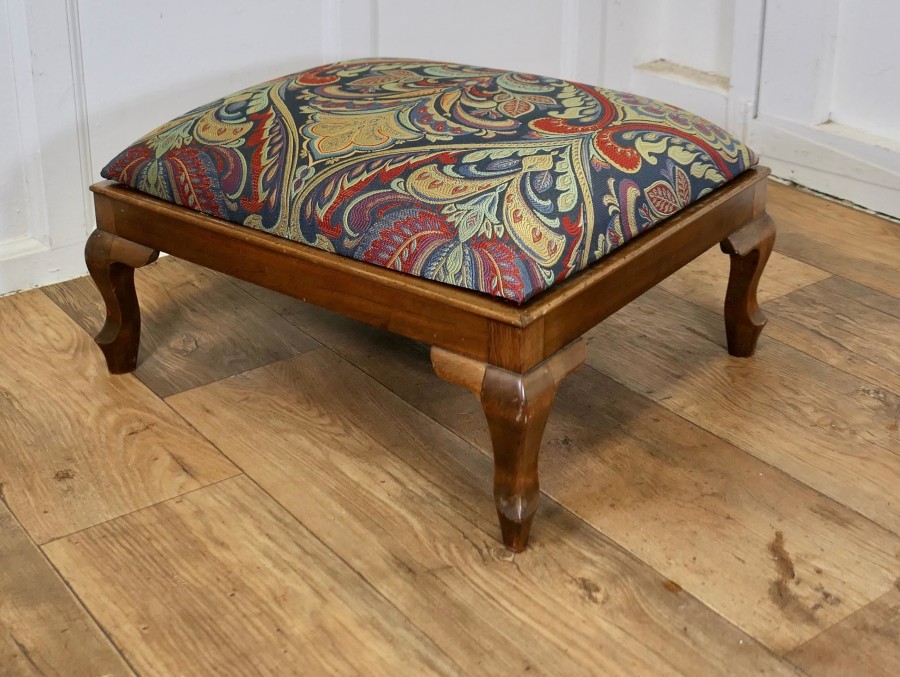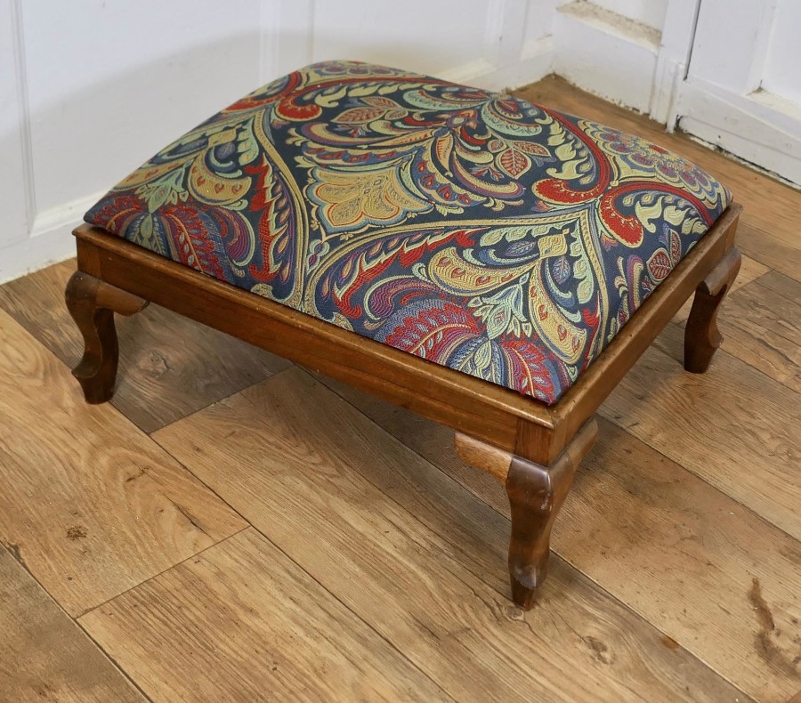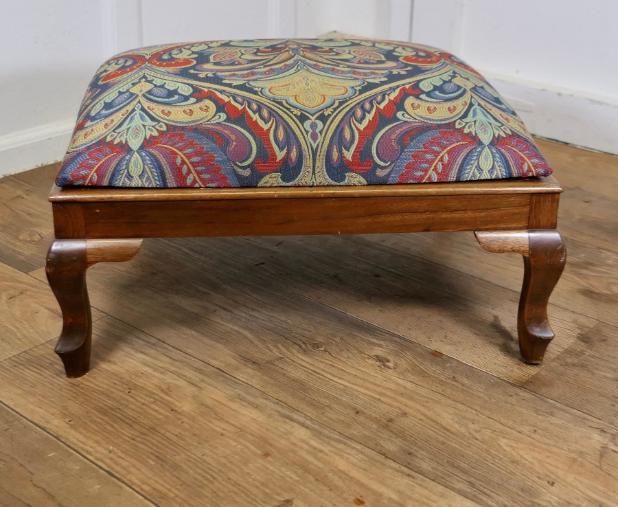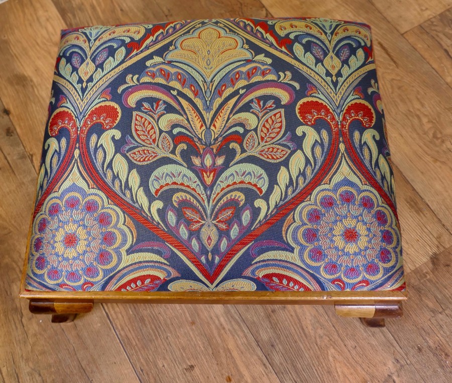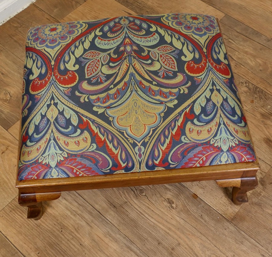 Victorian Art Nouveau Upholstered Foot Stool A Lovely piece, this Victorian stool is made inWalnut, it stands on chunky cabriole legs and has been upholstered in an extra thick Heavyweight Jacquard Fabric, a superb Art nouveau design, Jewel coloured and the design is known as Chastleton House The stool, is in good condition, it is 12” high, 22” long and 19” wide SC201 Manufacture Date : 1880 Materials : Walnut
