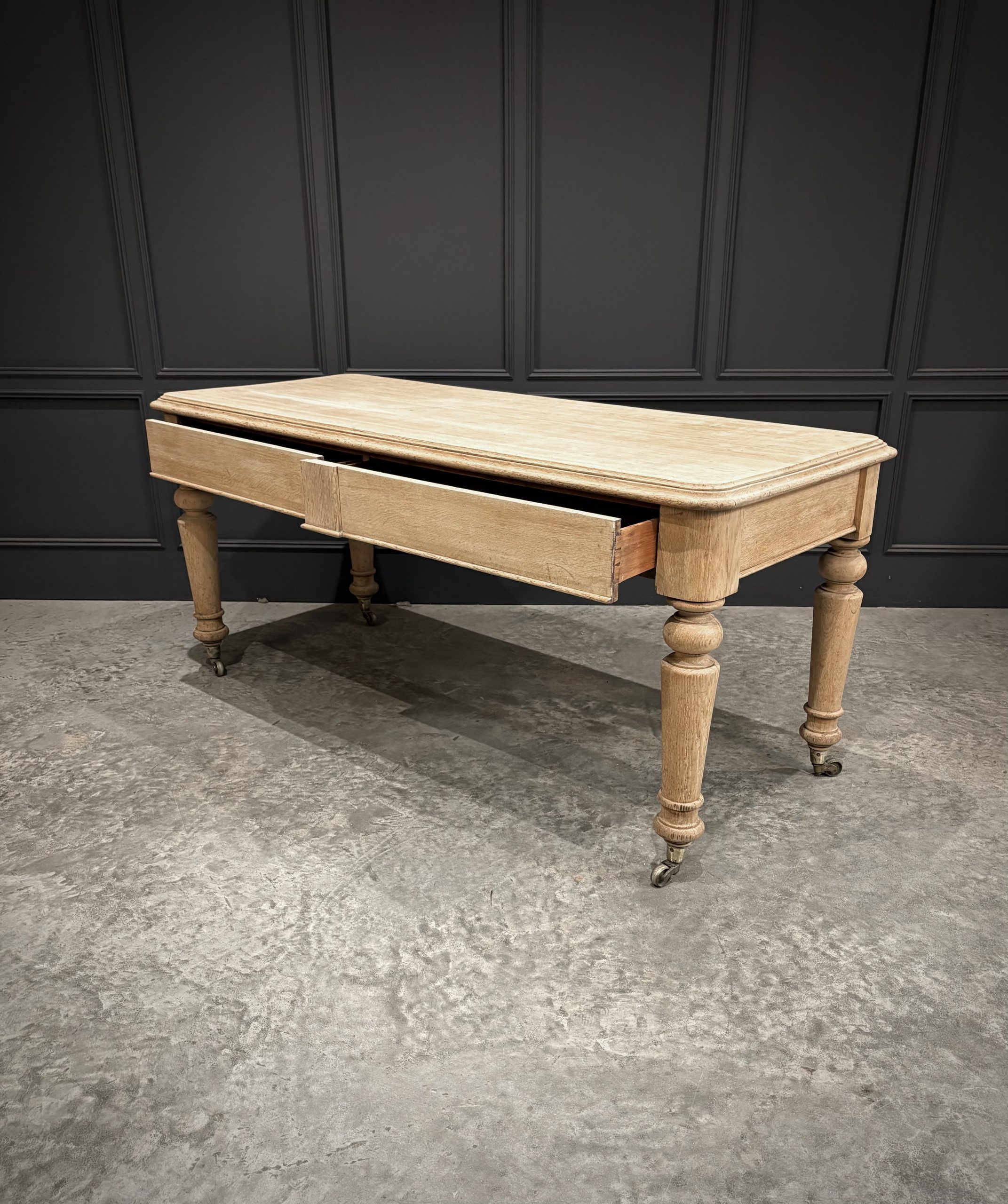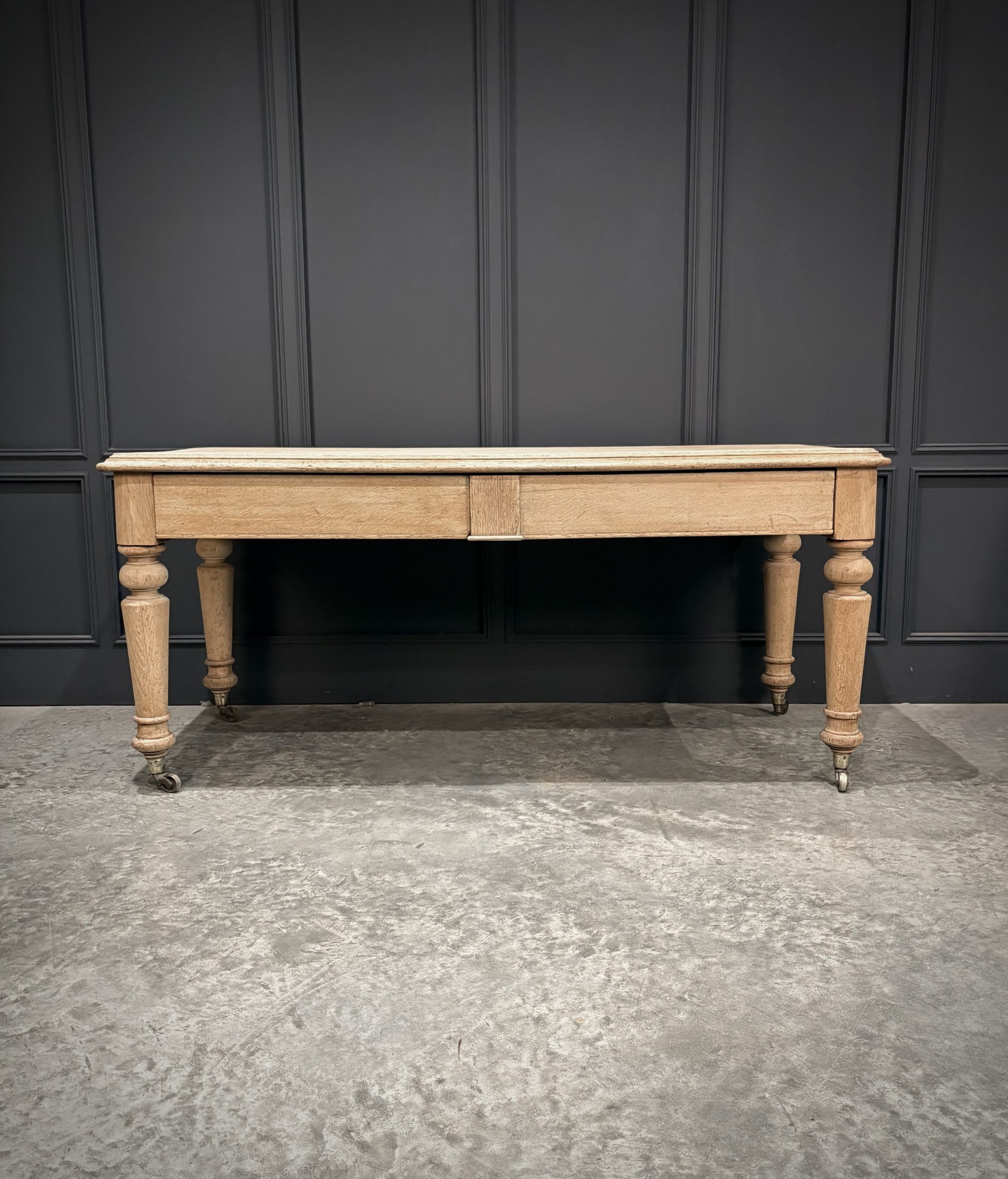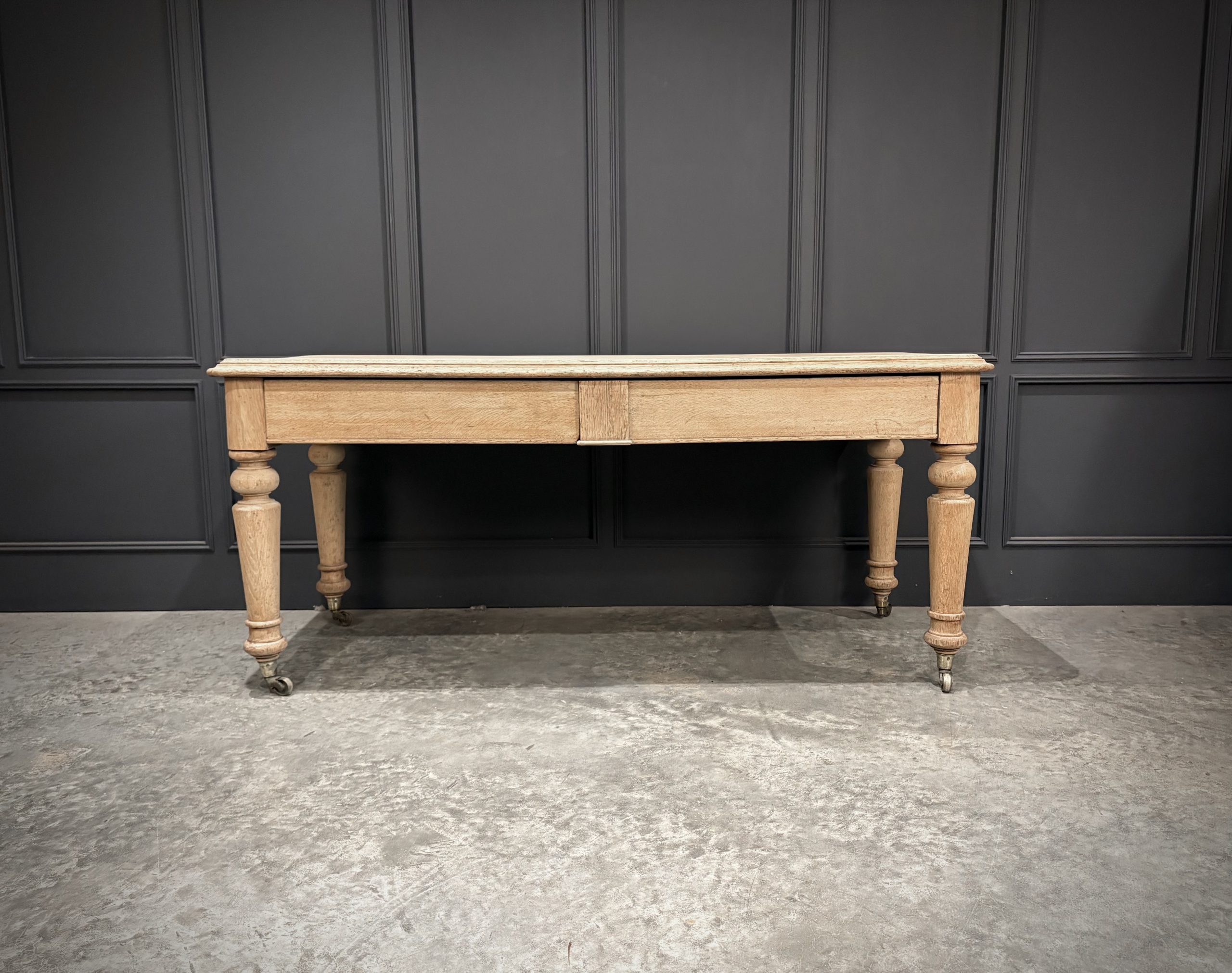 The table features two drawers to the front, ideal for storage, each with simple understated fronts. It stands on elegantly turned legs, raised on casters, allowing for easy movement.