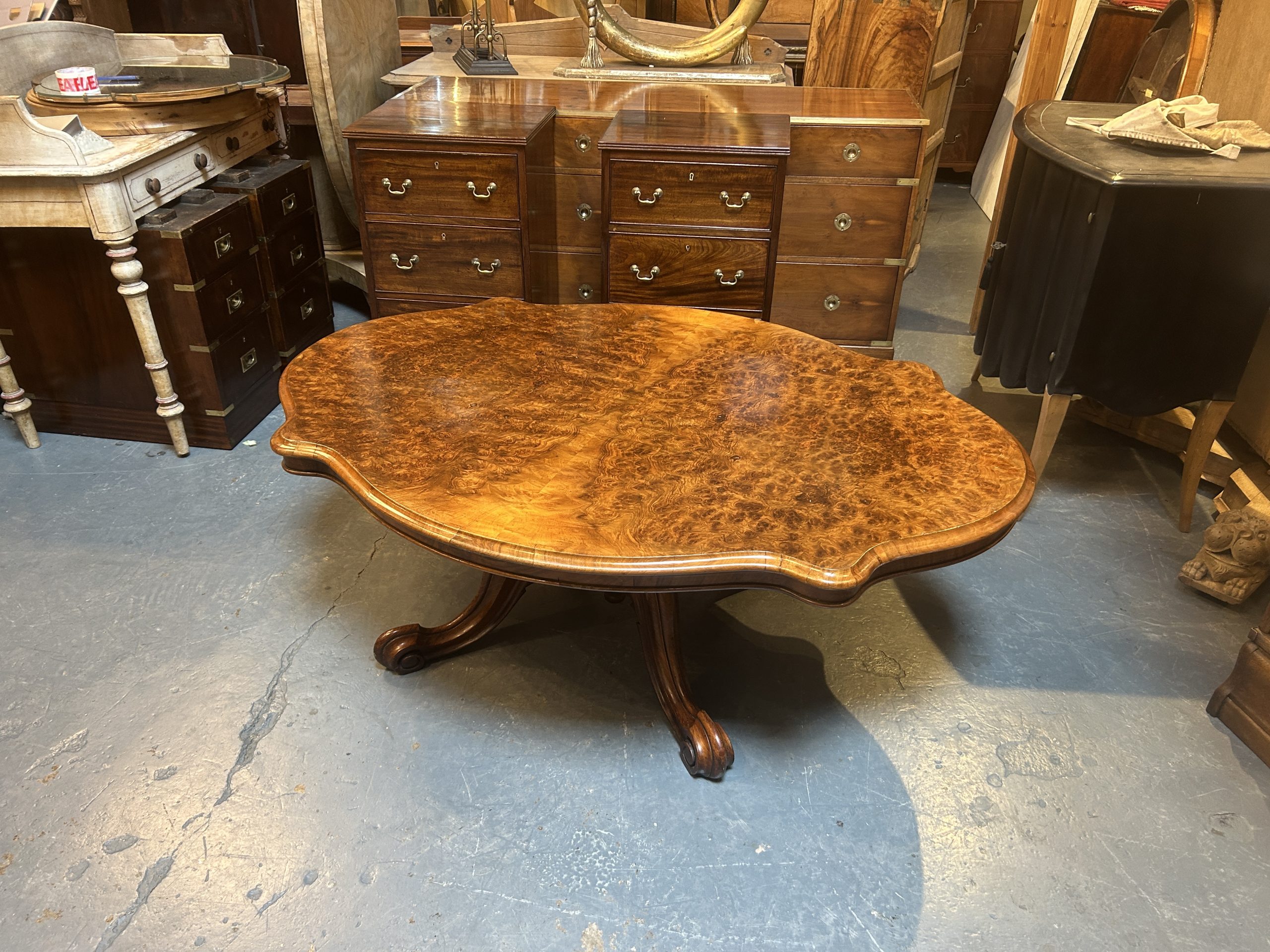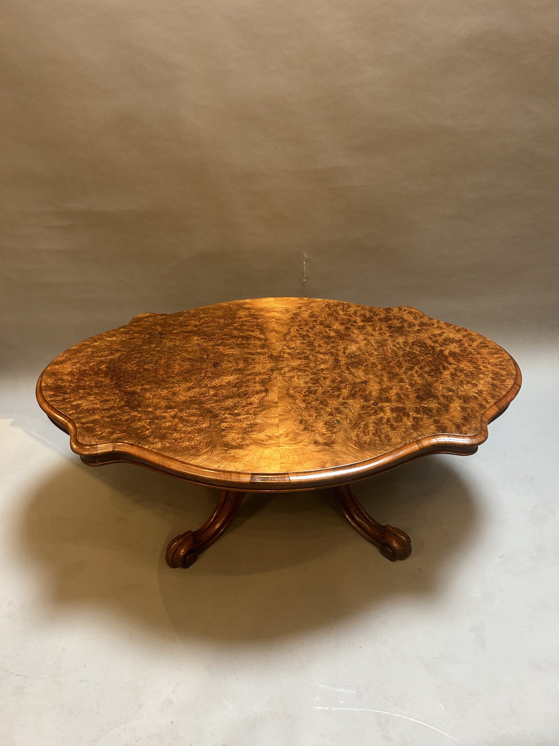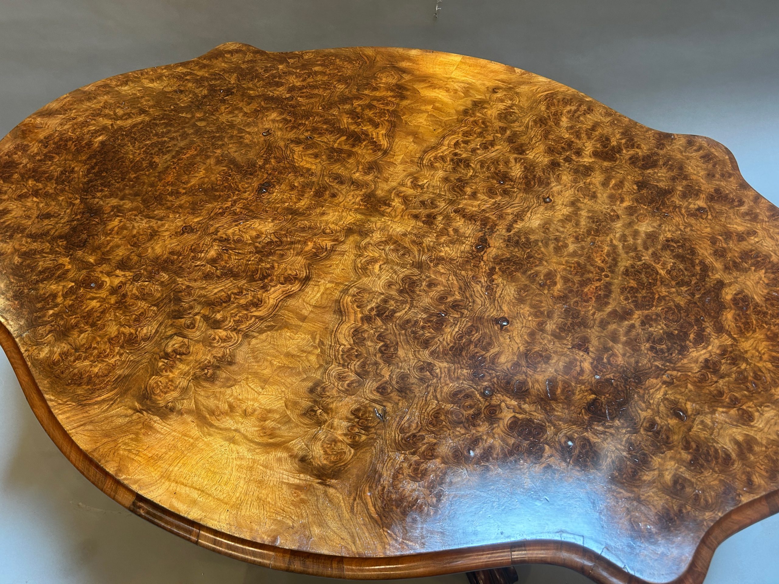 victorian burr walnut of exceptional good figure & colour, the cartouche shaped top raised on quadruple carved walnut base of quadruple scrolling legs.
