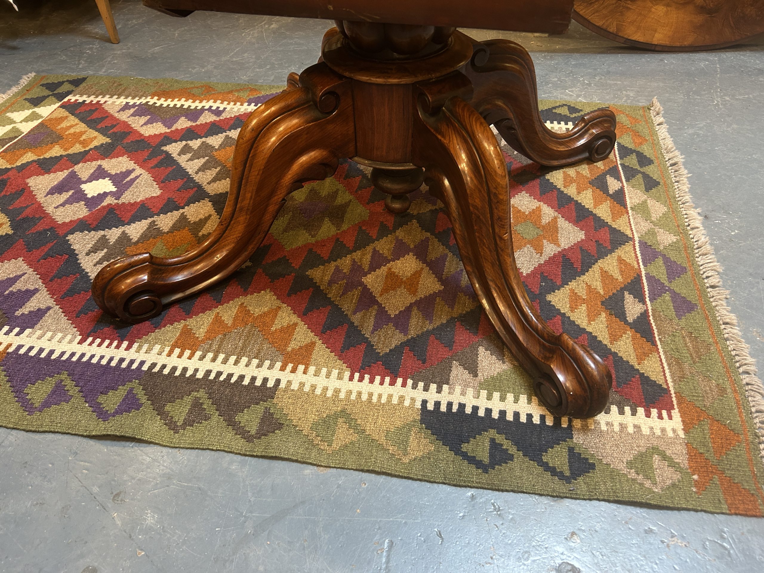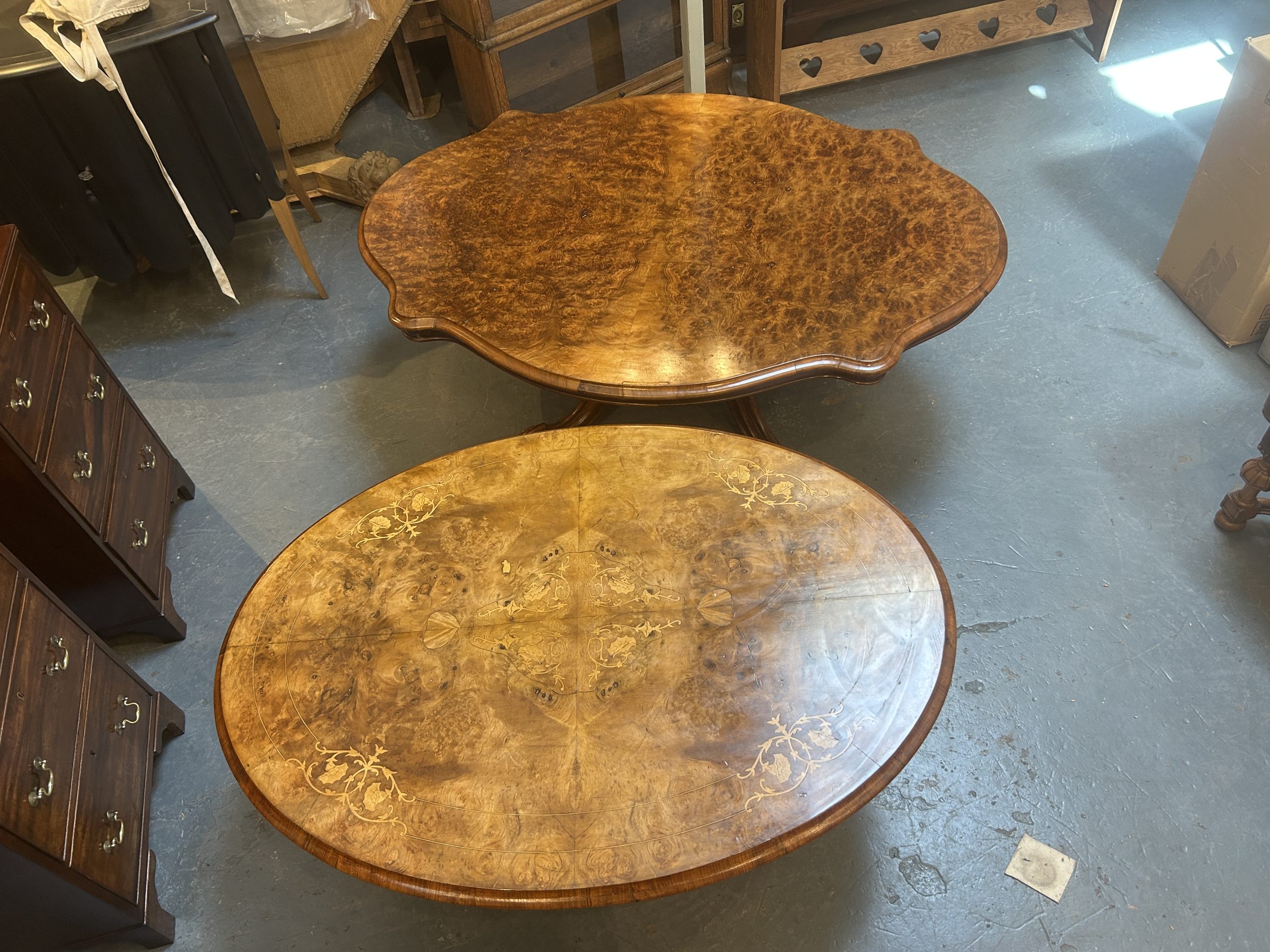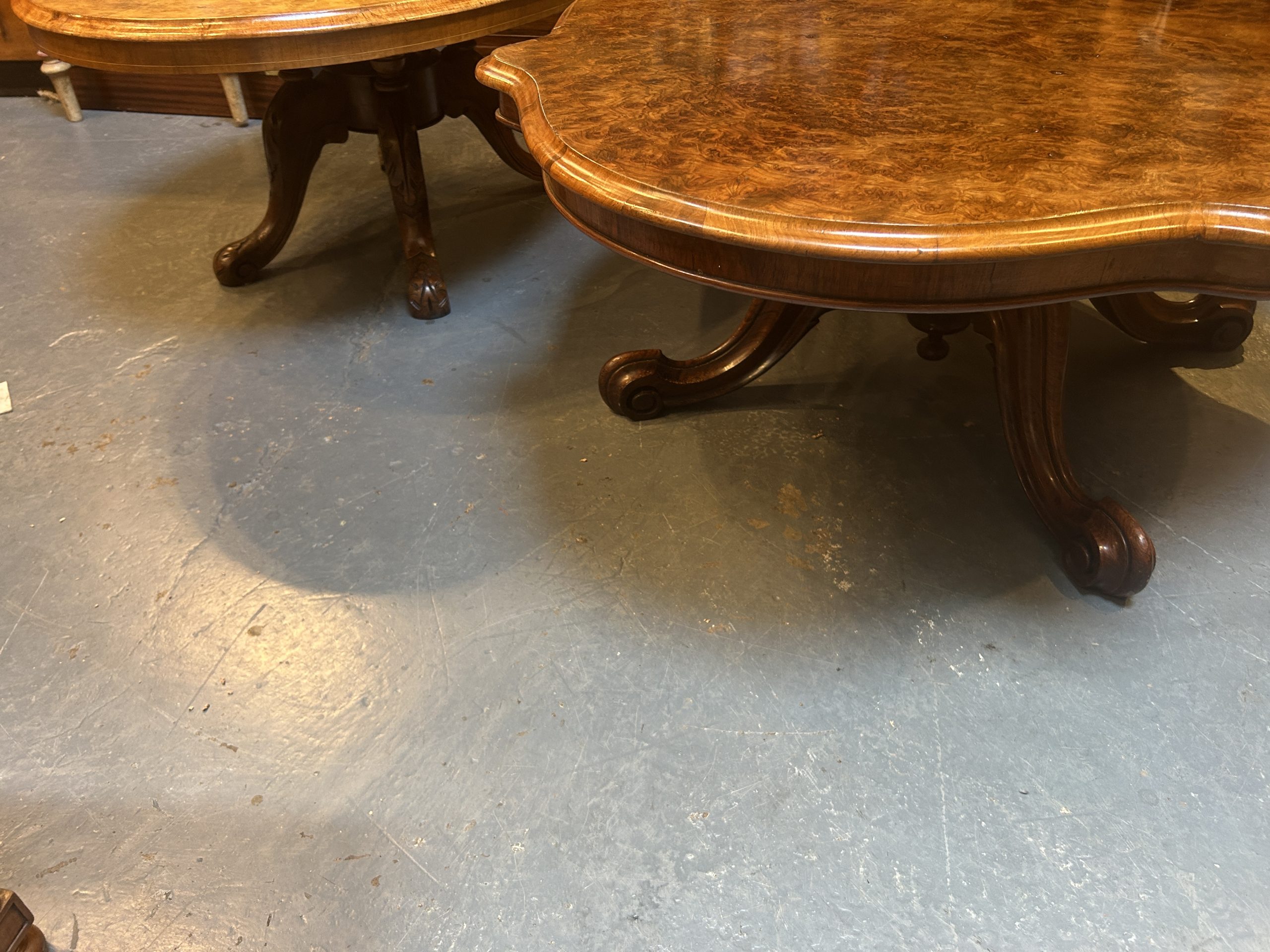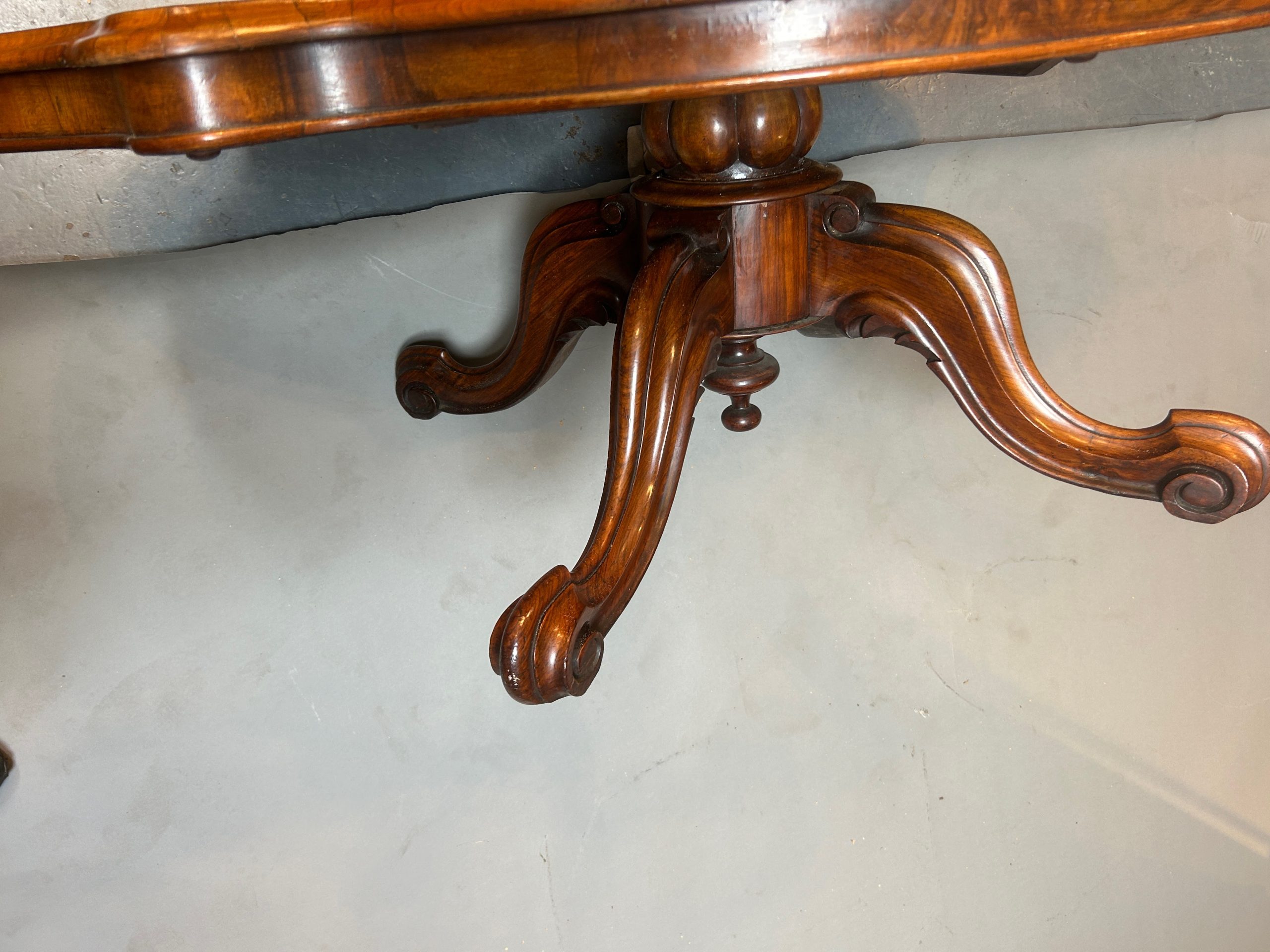 victorian burr walnut of exceptional good figure & colour, the cartouche shaped top raised on quadruple carved walnut base of quadruple scrolling legs.