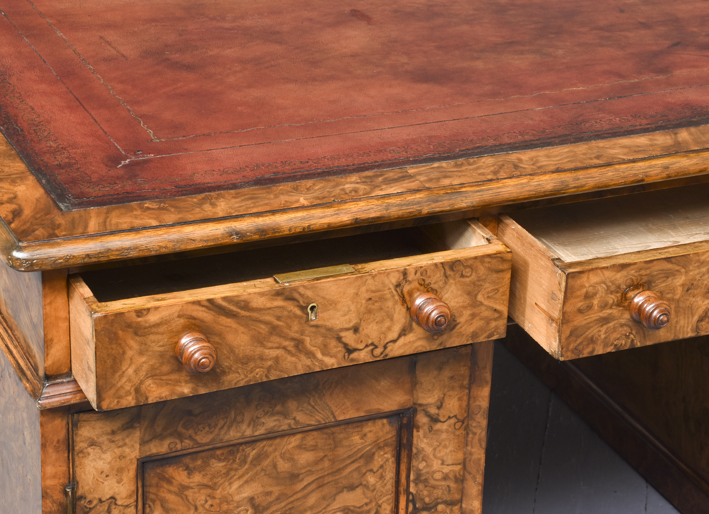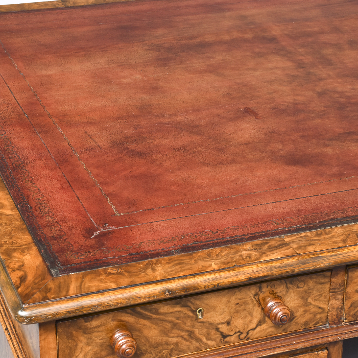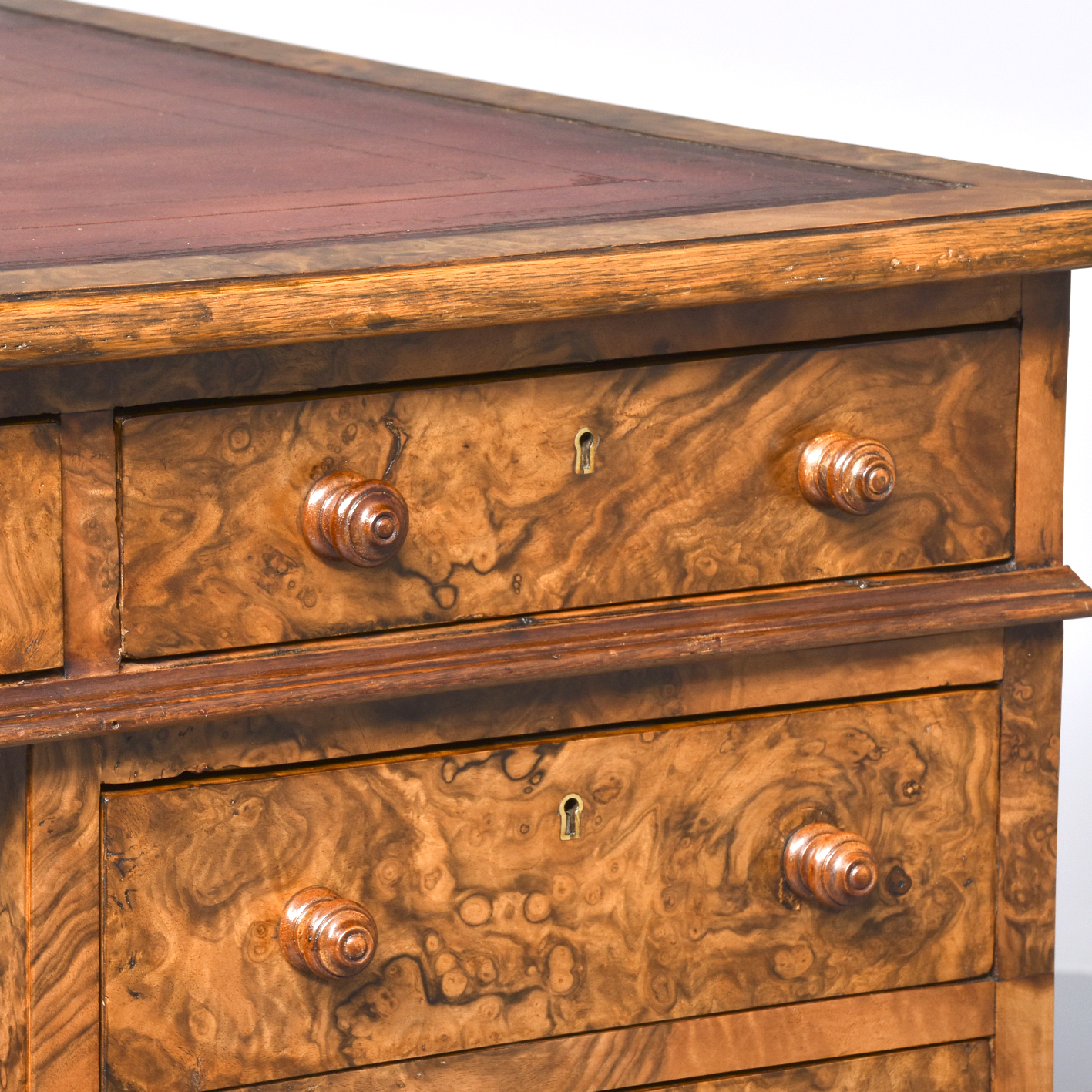 Circa 1860 with restorations. Mid Victorian burr walnut partners desk. The top with figured walnut banding with a red gilt-tooled real hide writing surface. The front with three frieze drawers with fine turned knobs, supported on banks of four graduated drawers over enclosed plinth bases. The reverse with three frieze drawers over two shelved cupboards.