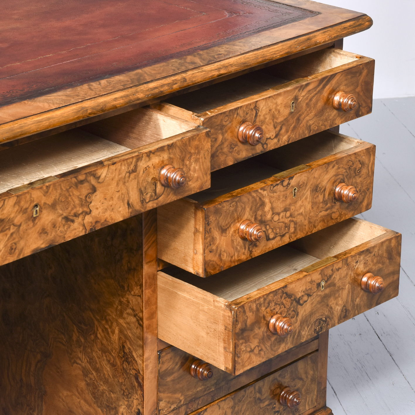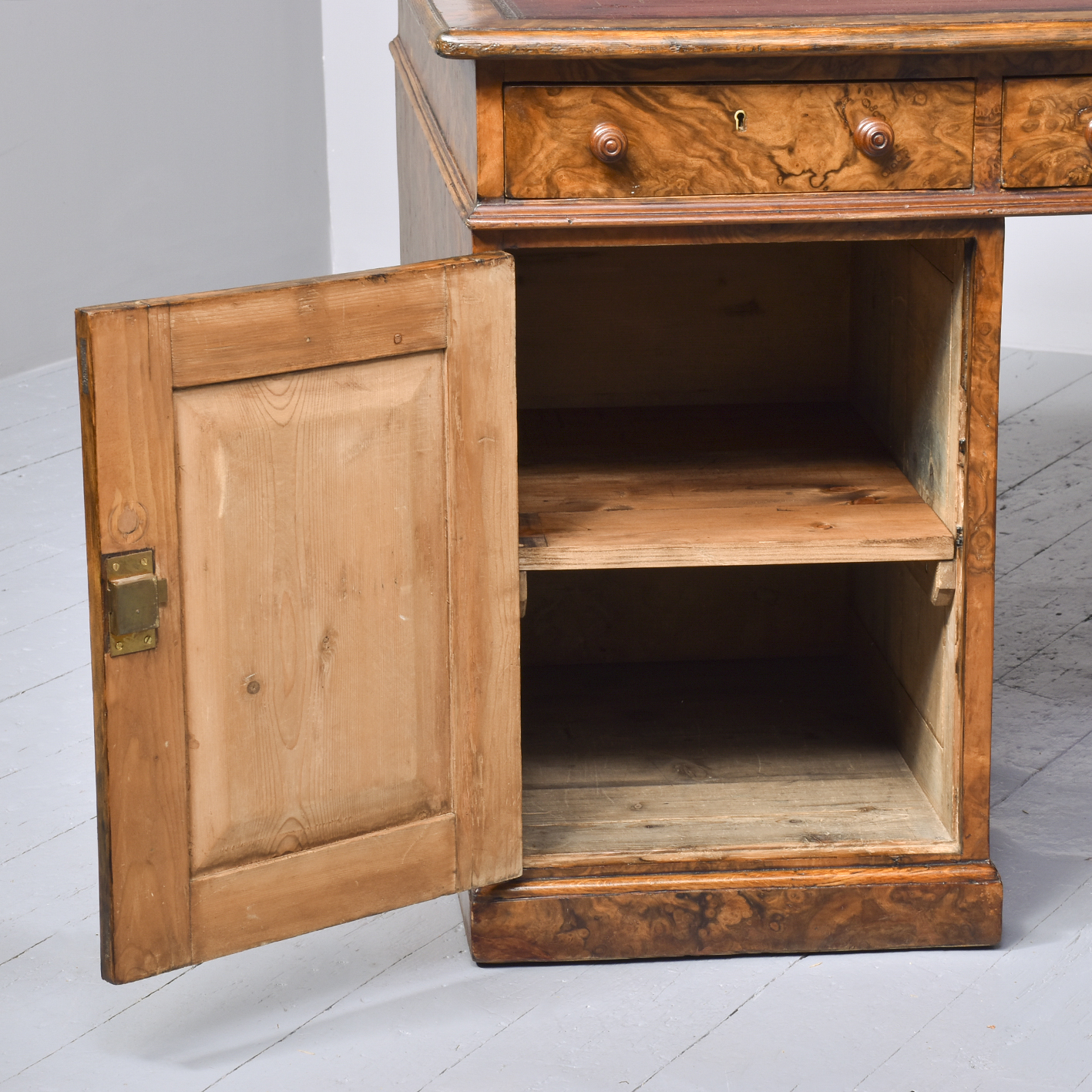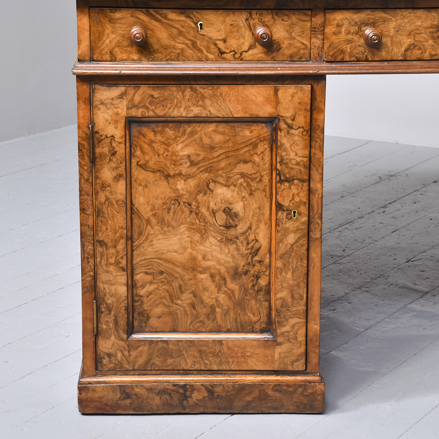 Circa 1860 with restorations. Mid Victorian burr walnut partners desk. The top with figured walnut banding with a red gilt-tooled real hide writing surface. The front with three frieze drawers with fine turned knobs, supported on banks of four graduated drawers over enclosed plinth bases. The reverse with three frieze drawers over two shelved cupboards.