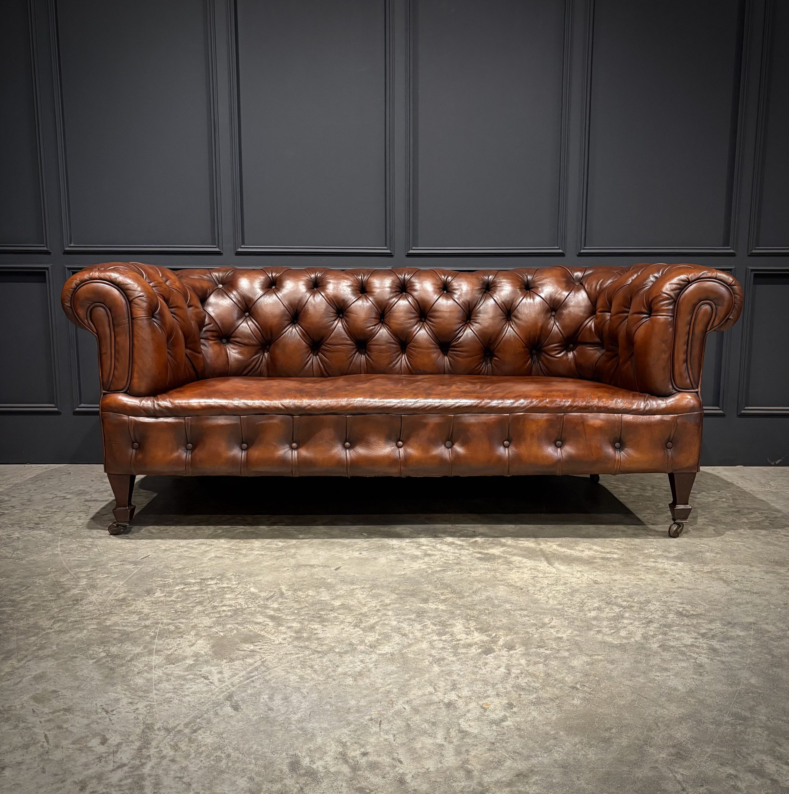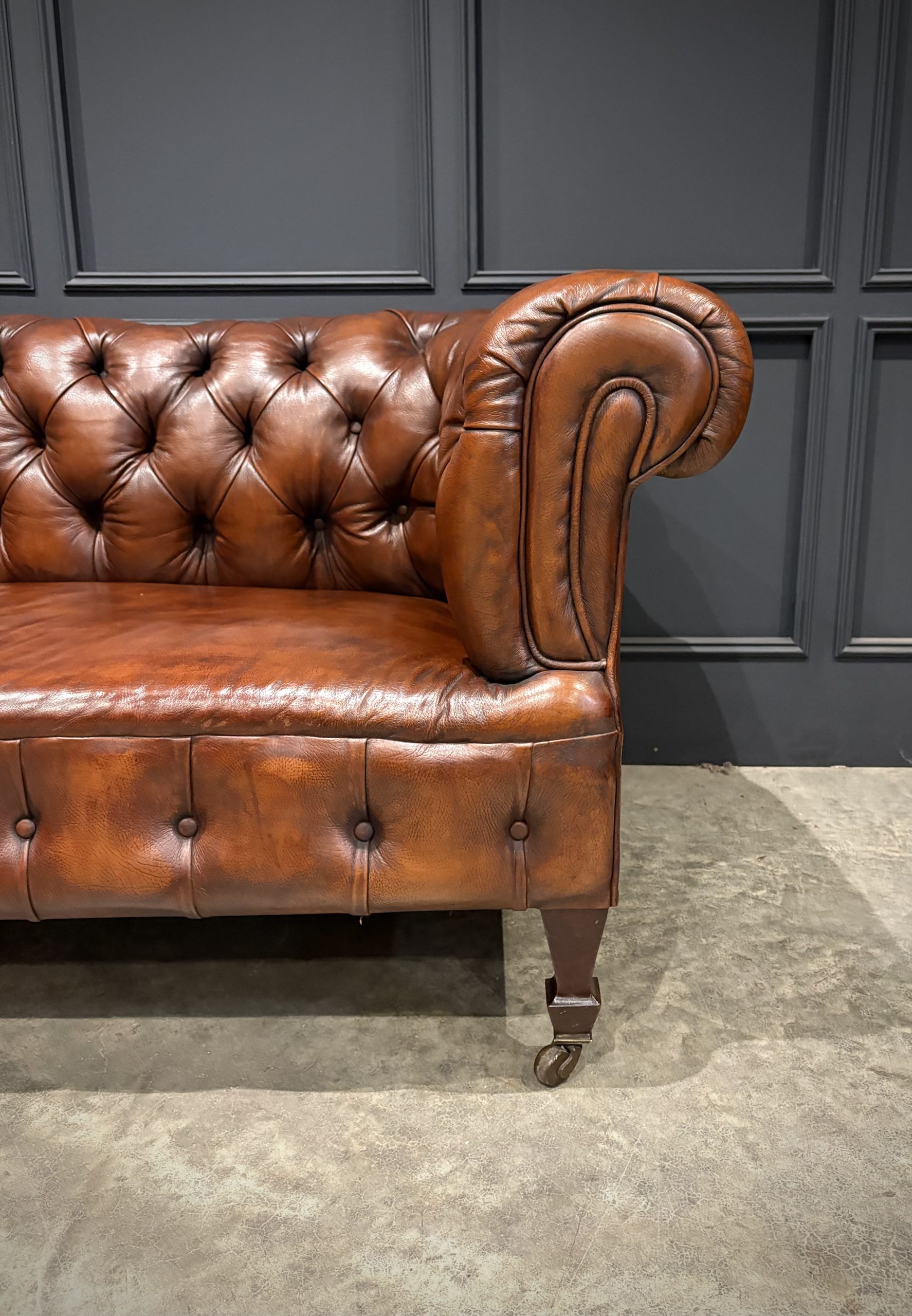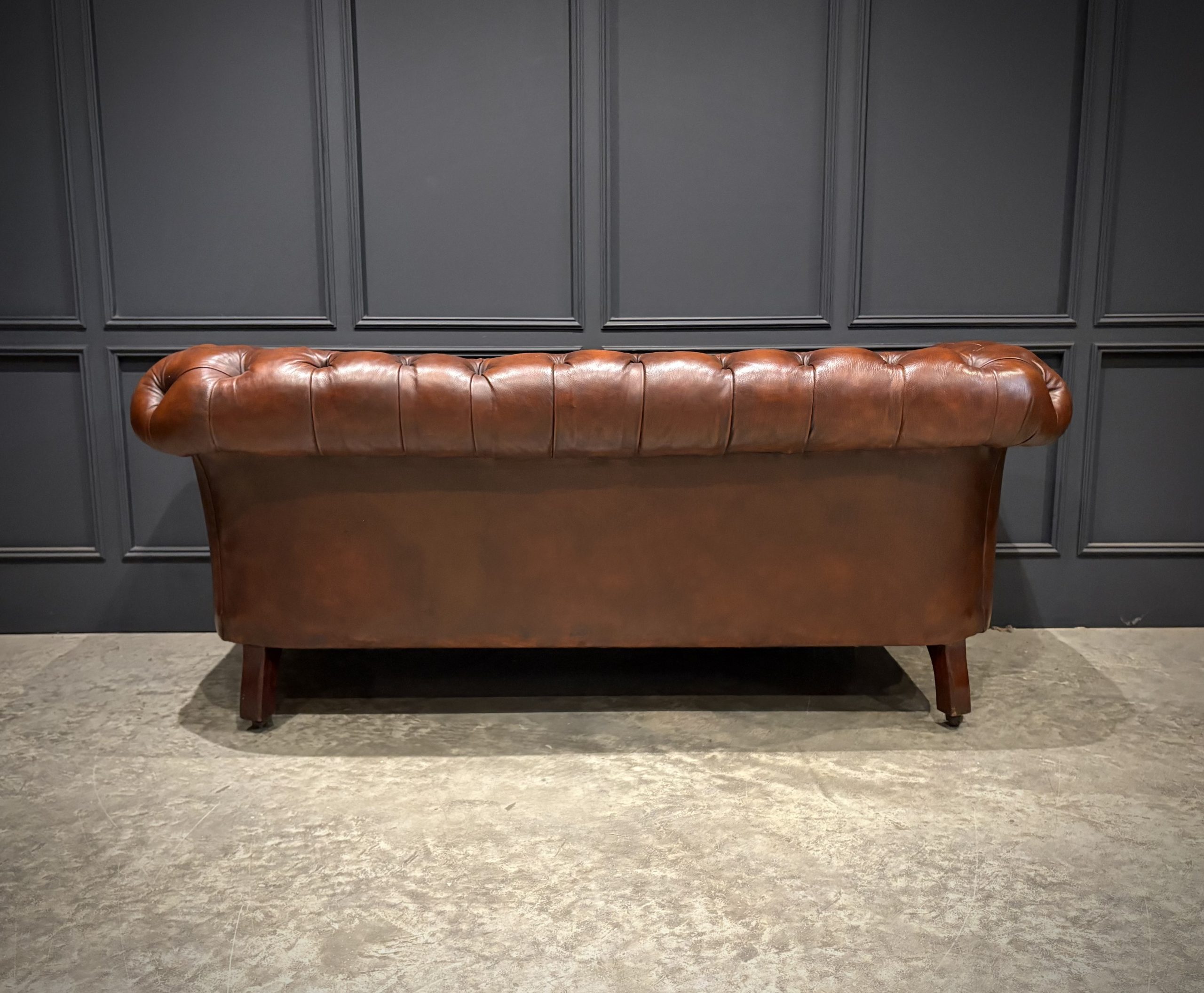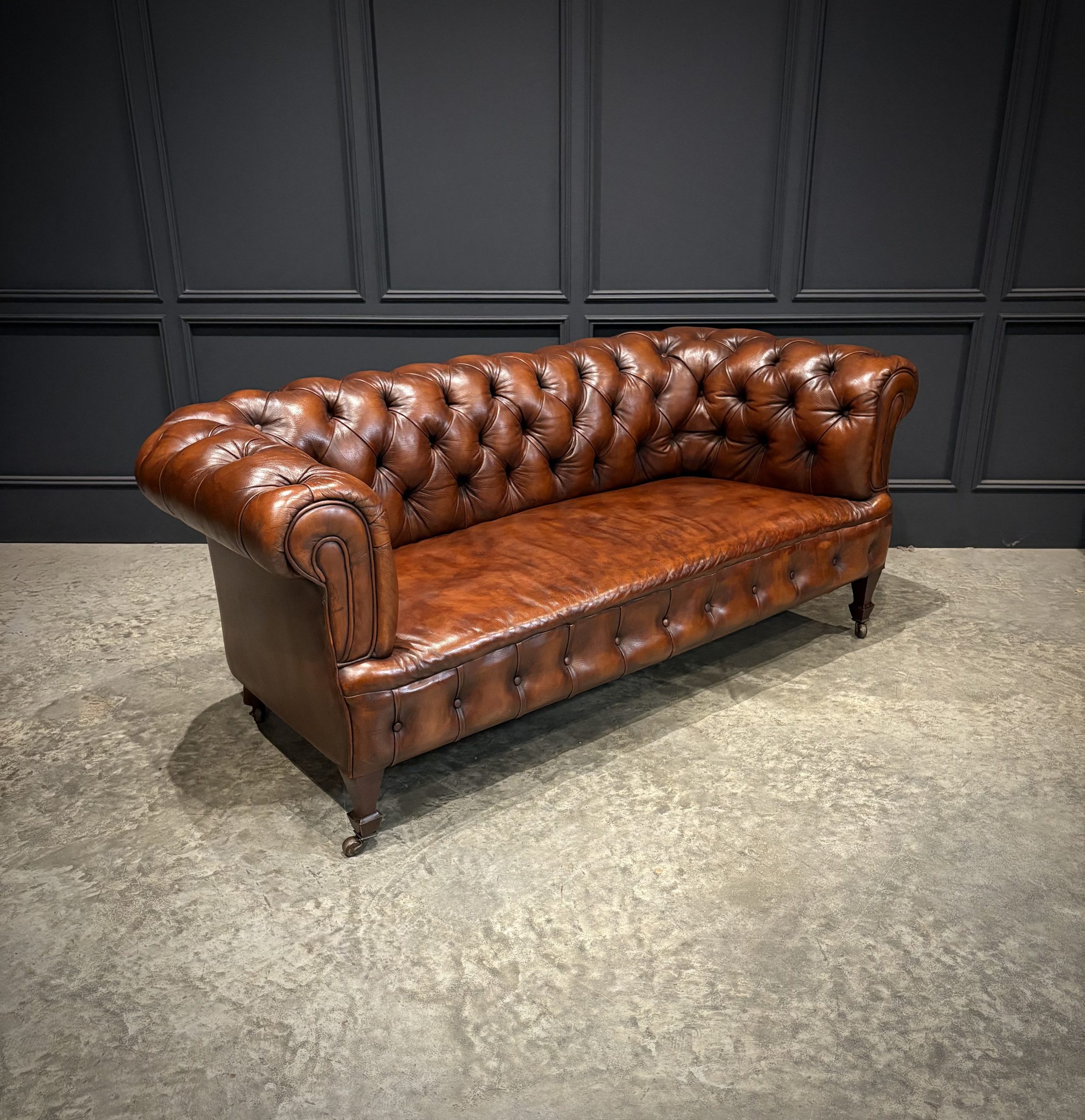 A fine example of a genuine Victorian buttoned Chesterfield sofa, beautifully refurbished and upholstered in hand-dyed tobacco brown leather.
