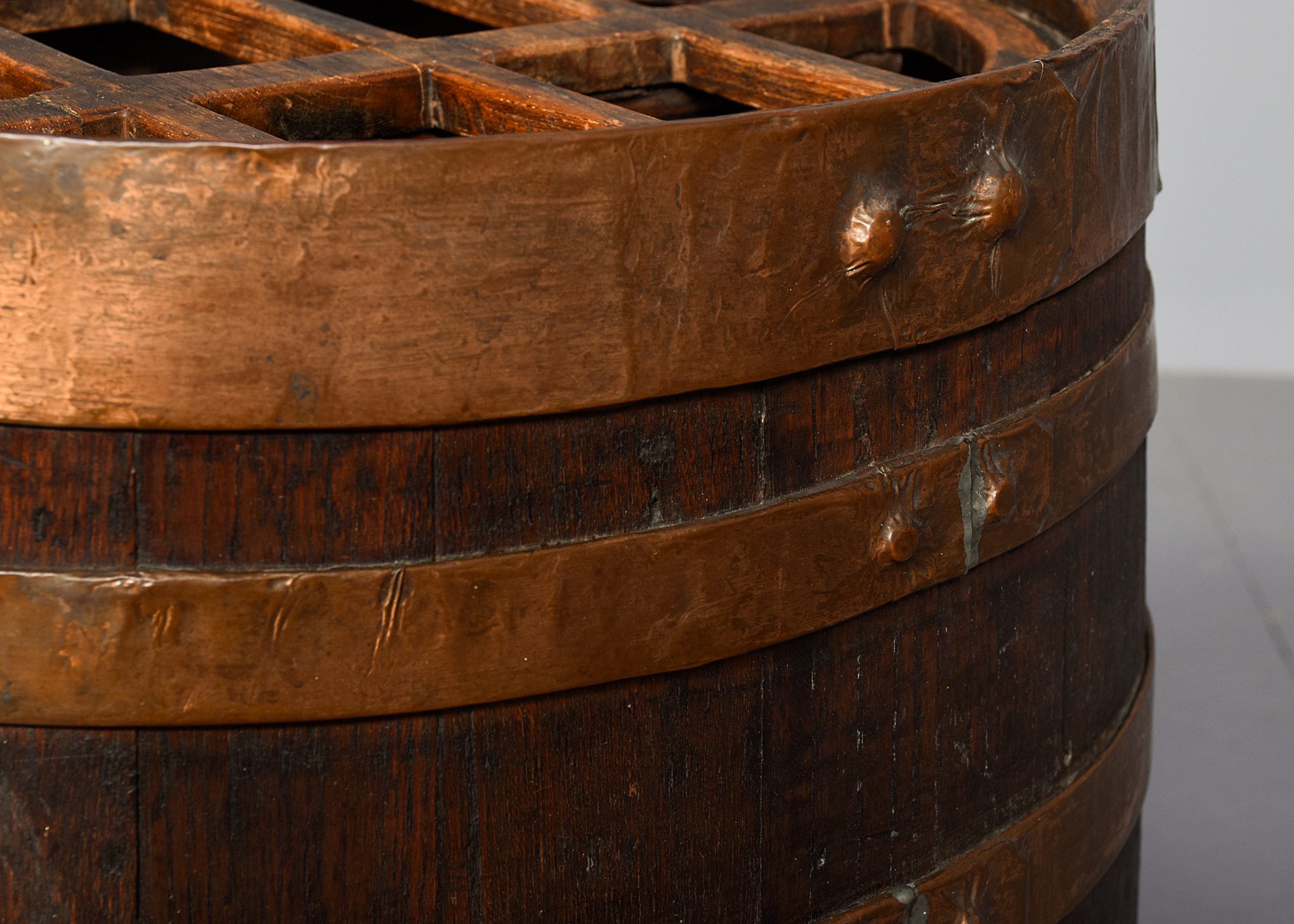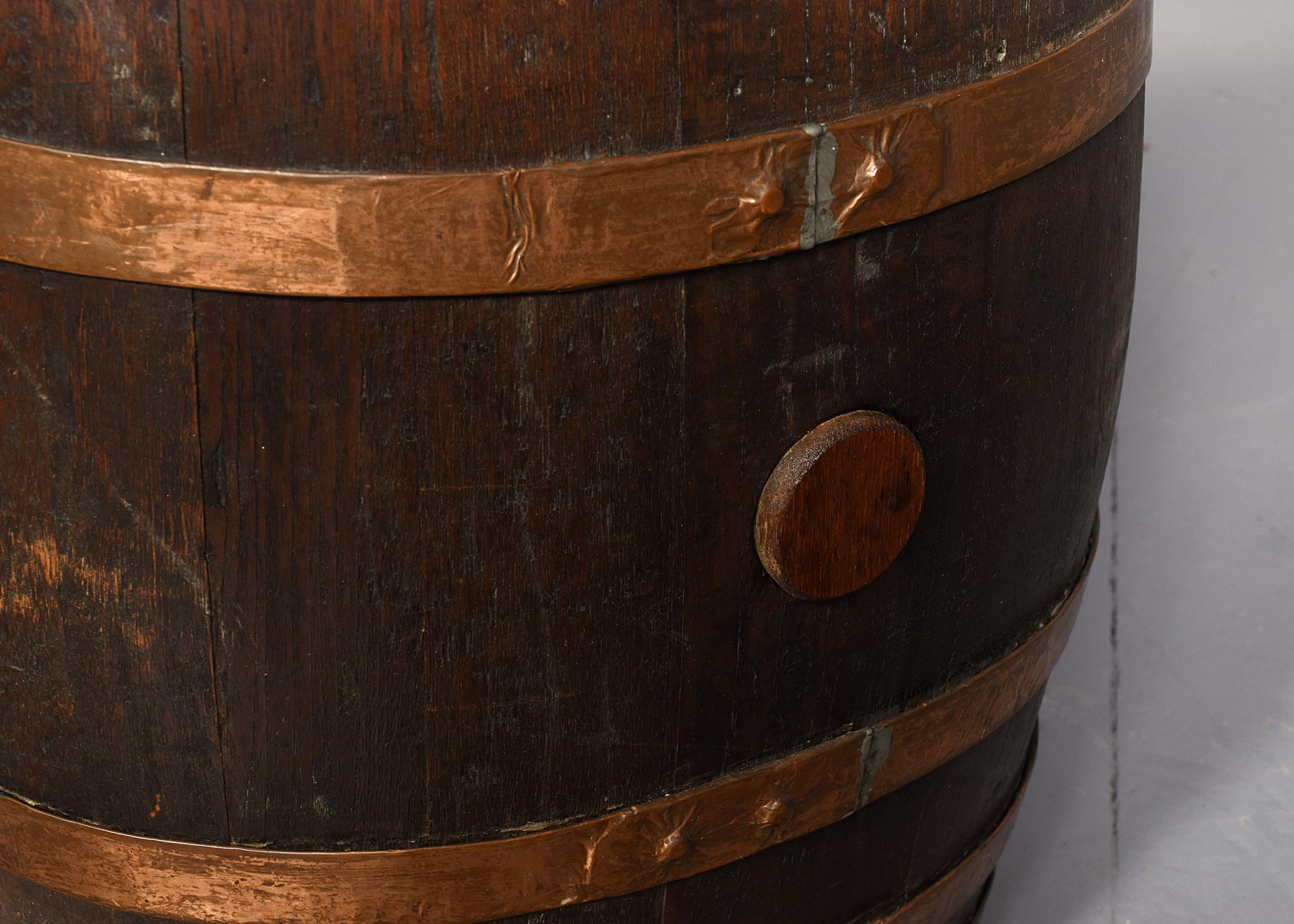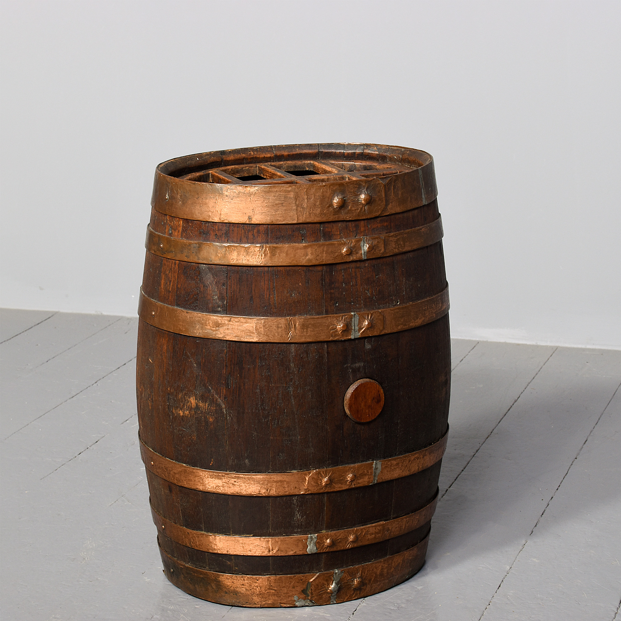 Circa 1870. Antique copper-bound oak sherry cask stick stand. The oval, staved-oak barrel with six heavy copper bandings and a later fitment for umbrellas/walking sticks.