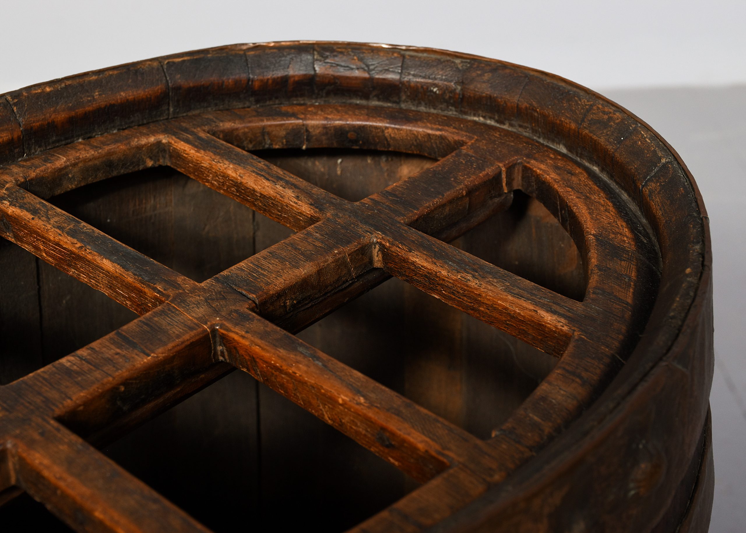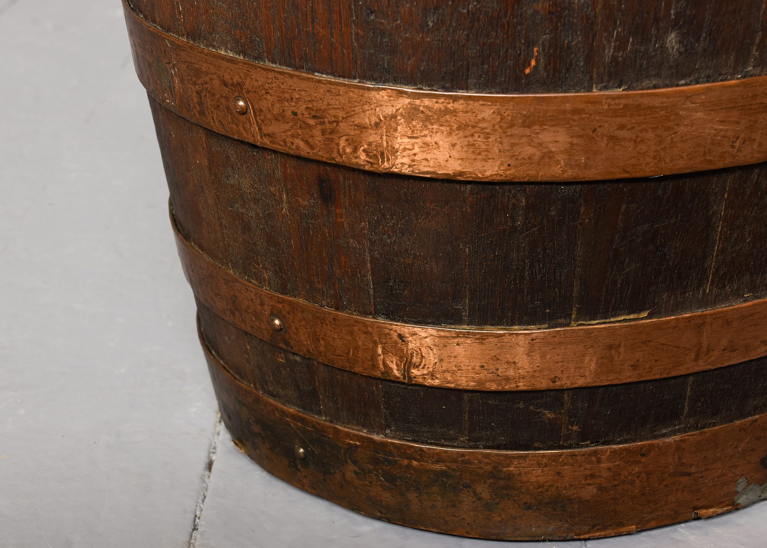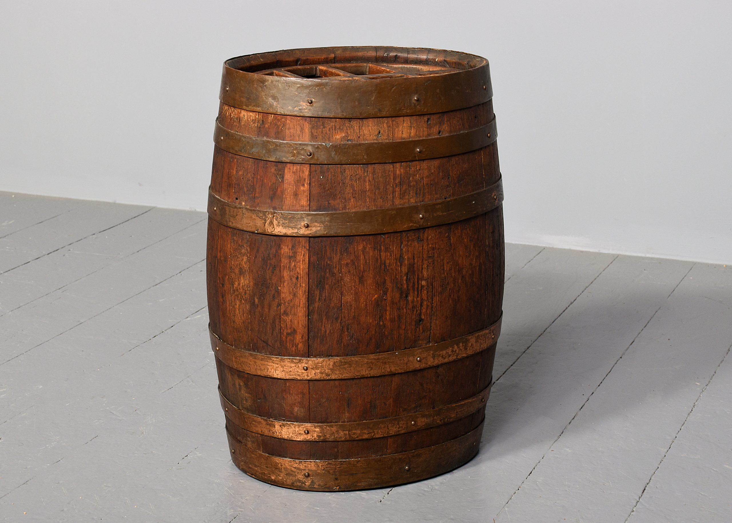 Circa 1870. Antique copper-bound oak sherry cask stick stand. The oval, staved-oak barrel with six heavy copper bandings and a later fitment for umbrellas/walking sticks.