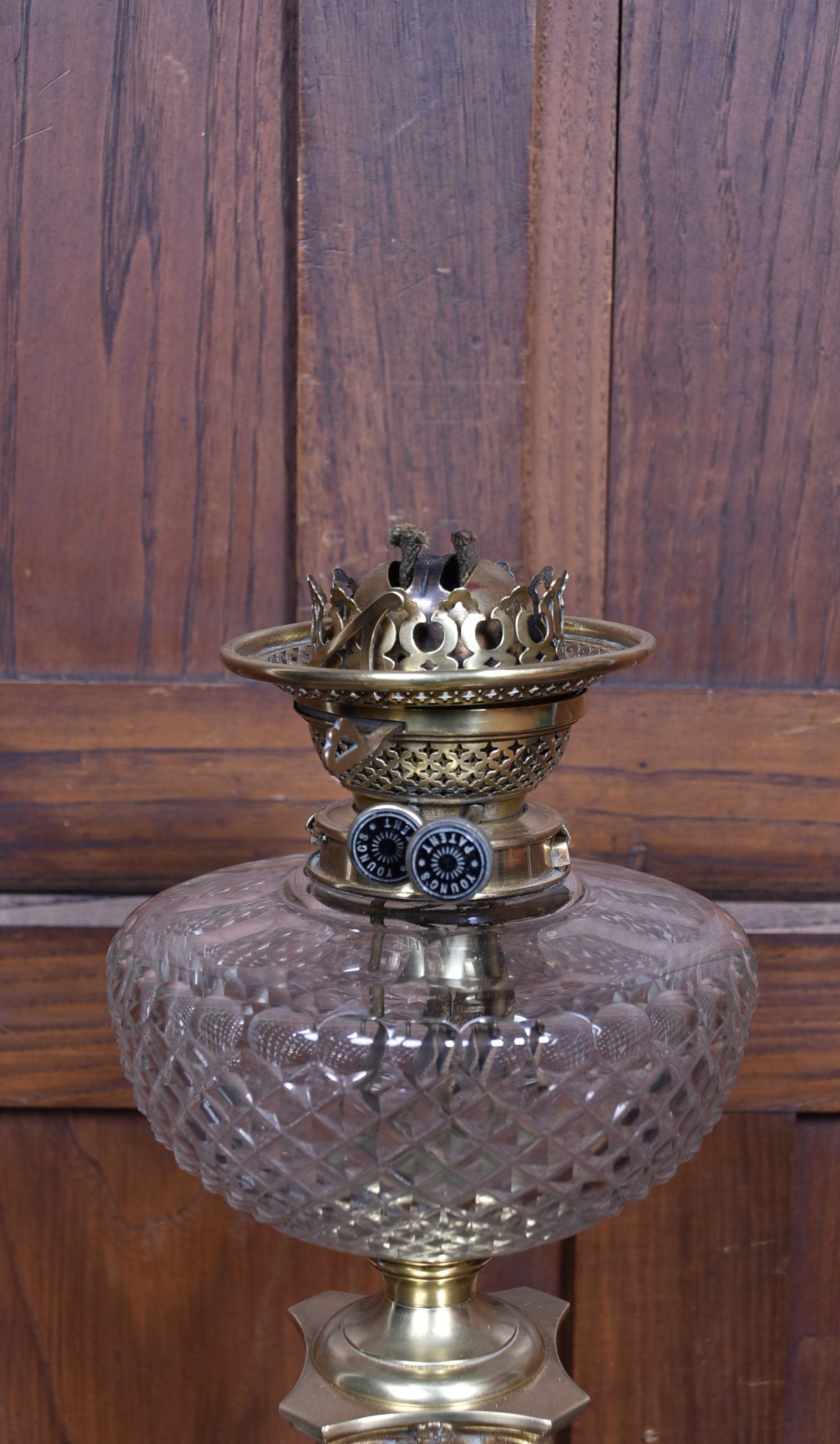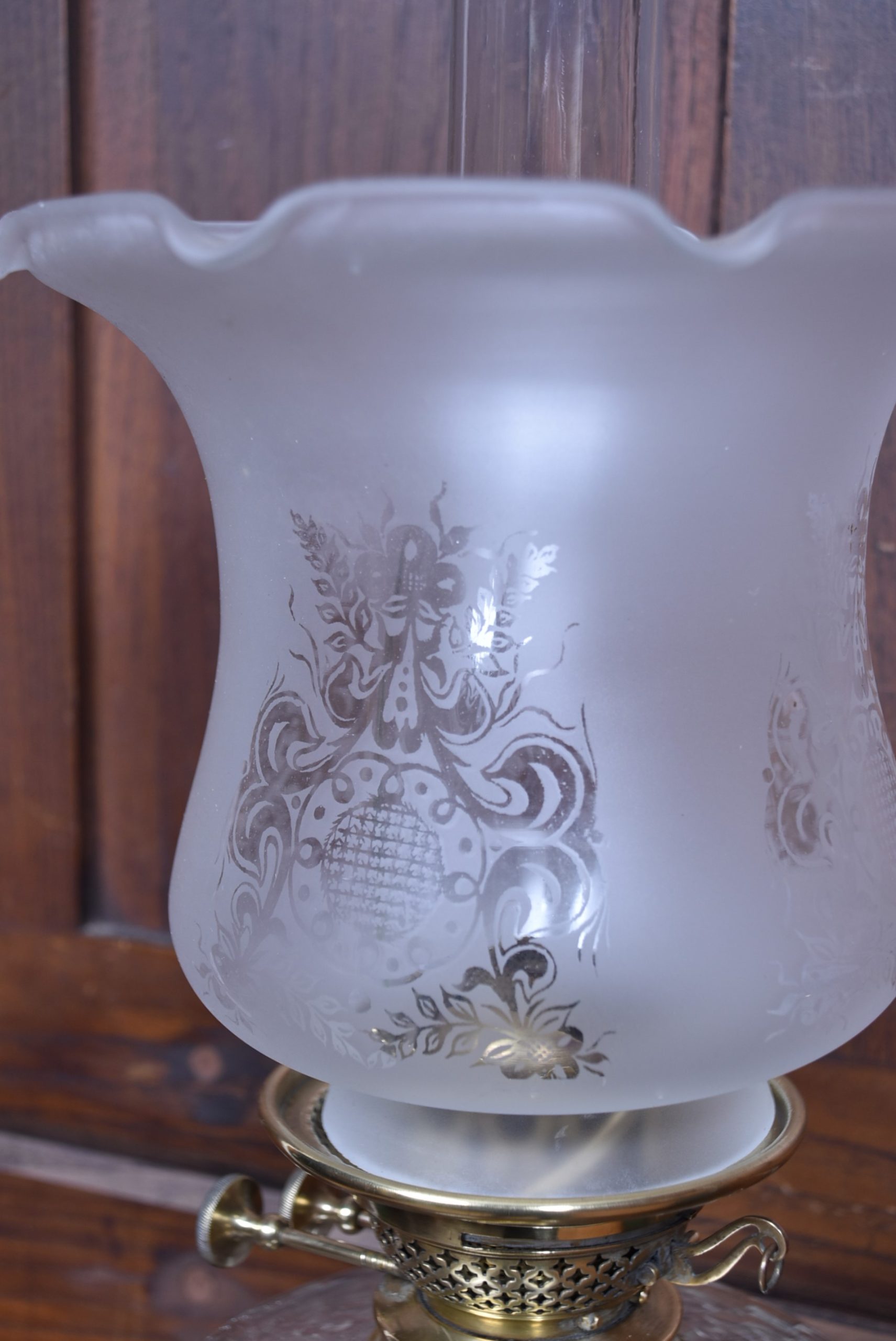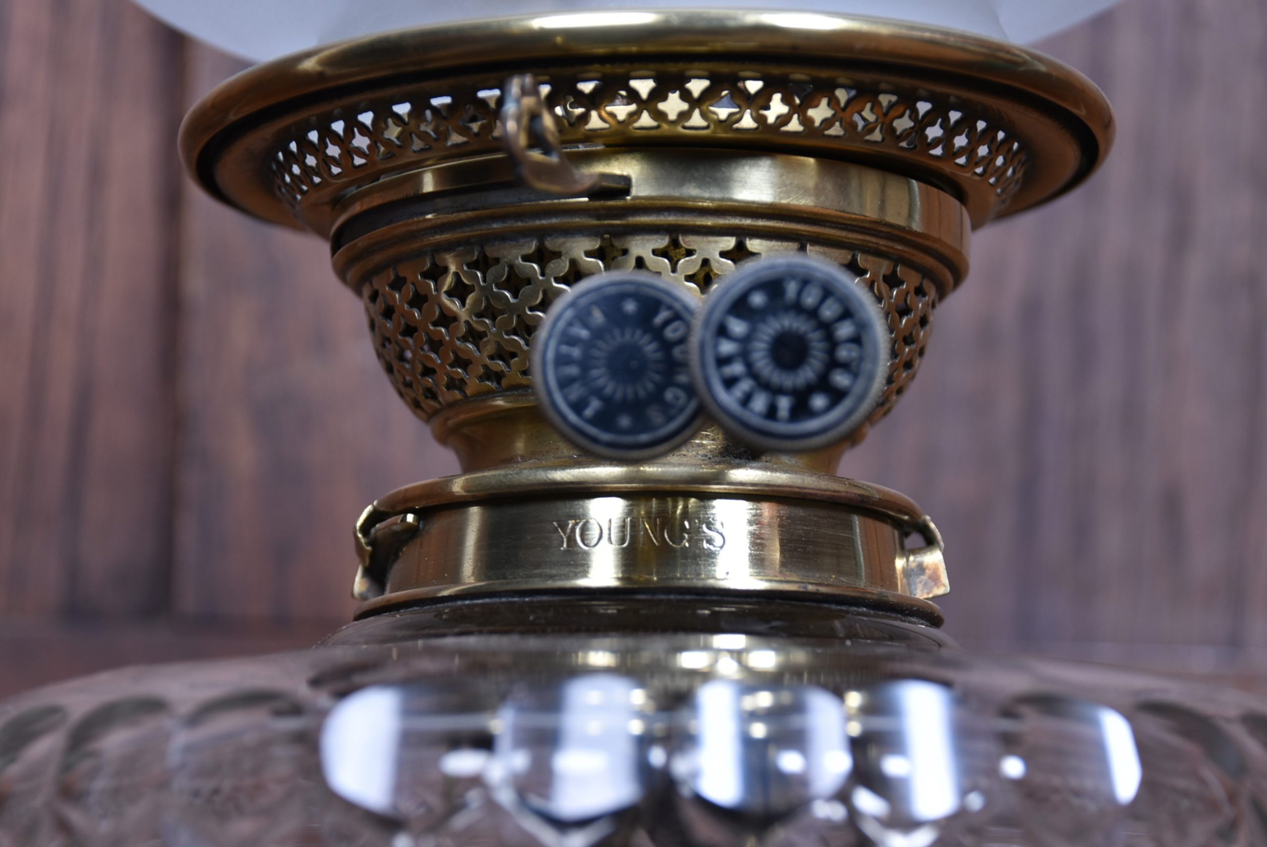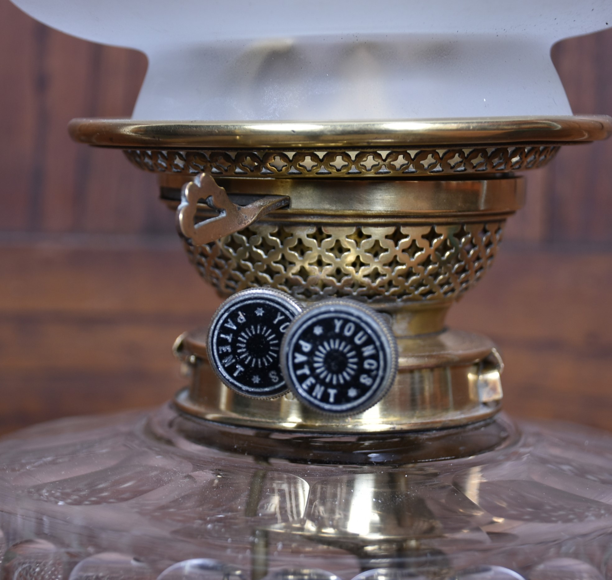 A fine Victorian oil/paraffin lamp distinguished by twin adjusters stamped “Young’s Special” , a mark of quality and provenance. Its embossed frosted glass tulip shade lends a gentle elegance, paired with a clear funnel and crystal reservoir, both in excellent condition. A single crystal column rises gracefully from a stepped brass base, completing the composition with classical poise. Fully functional and beautifully preserved, this lamp embodies the craftsmanship of 19th-century design. It offers both atmospheric illumination and timeless character , a perfect accent for traditional or eclectic interiors alike.