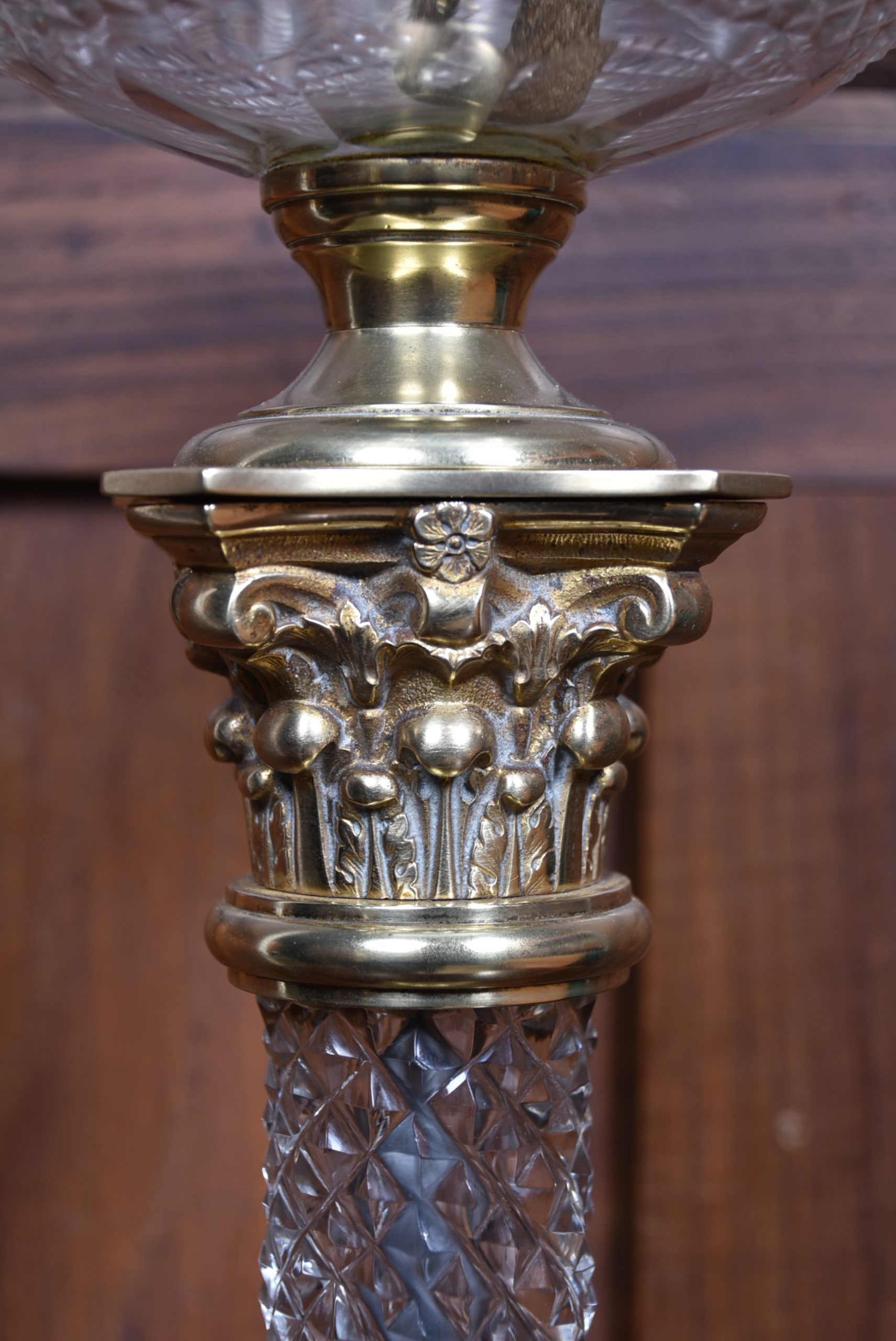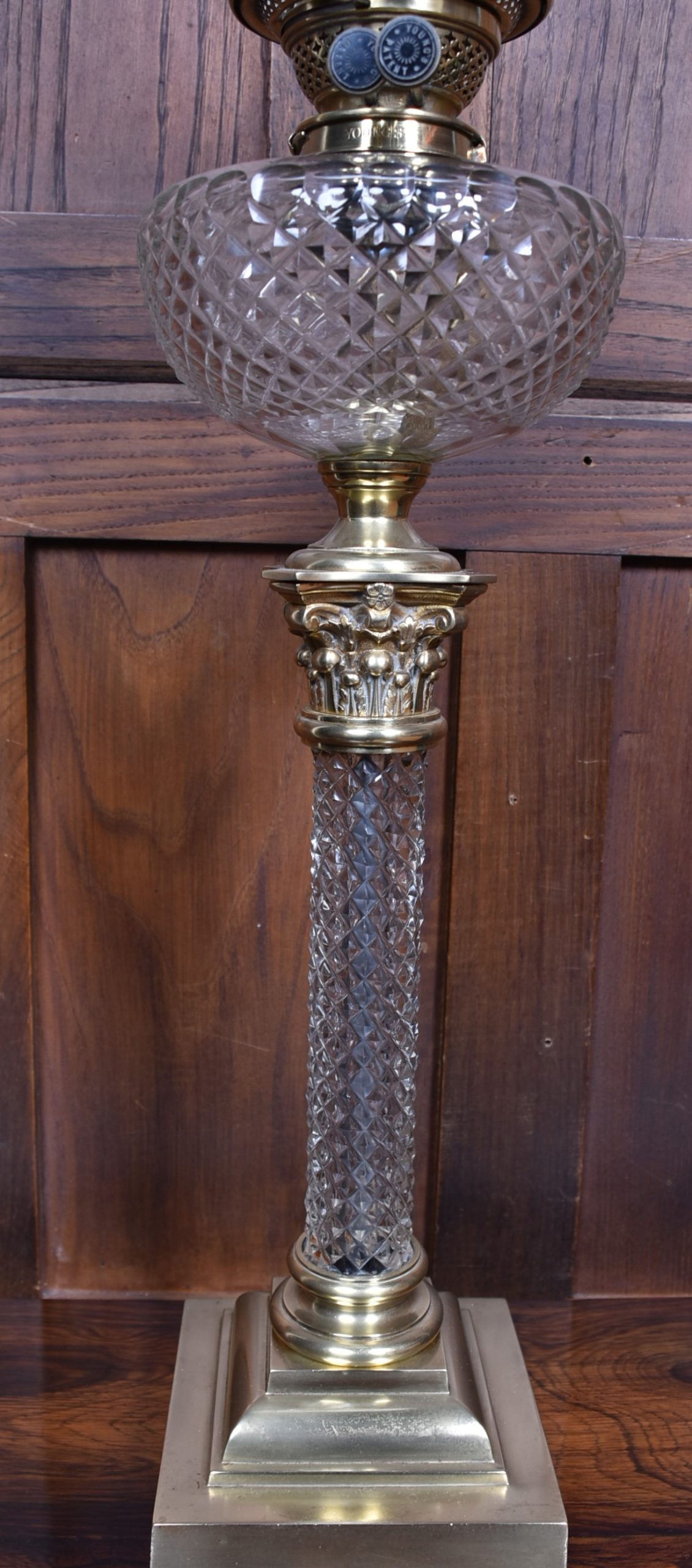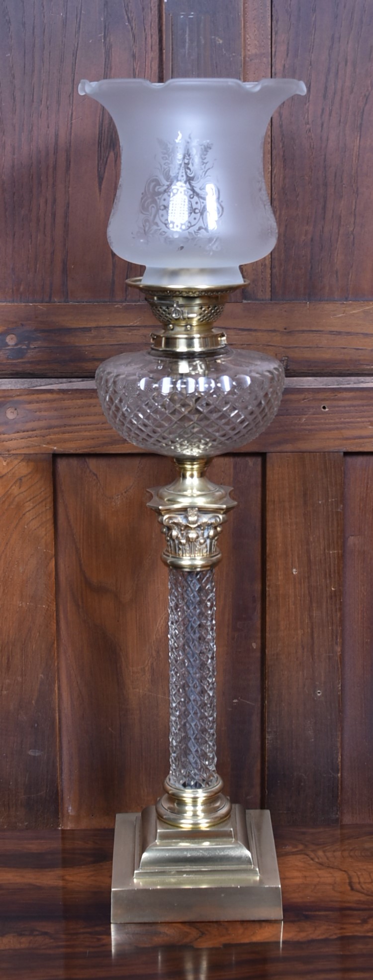 A fine Victorian oil/paraffin lamp distinguished by twin adjusters stamped “Young’s Special” , a mark of quality and provenance. Its embossed frosted glass tulip shade lends a gentle elegance, paired with a clear funnel and crystal reservoir, both in excellent condition. A single crystal column rises gracefully from a stepped brass base, completing the composition with classical poise. Fully functional and beautifully preserved, this lamp embodies the craftsmanship of 19th-century design. It offers both atmospheric illumination and timeless character , a perfect accent for traditional or eclectic interiors alike.