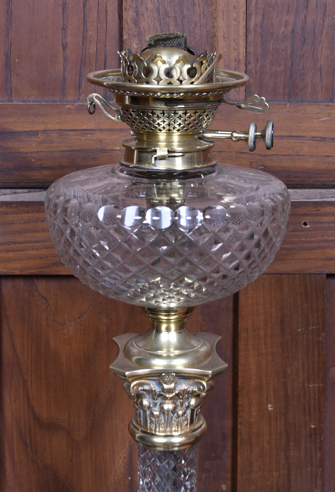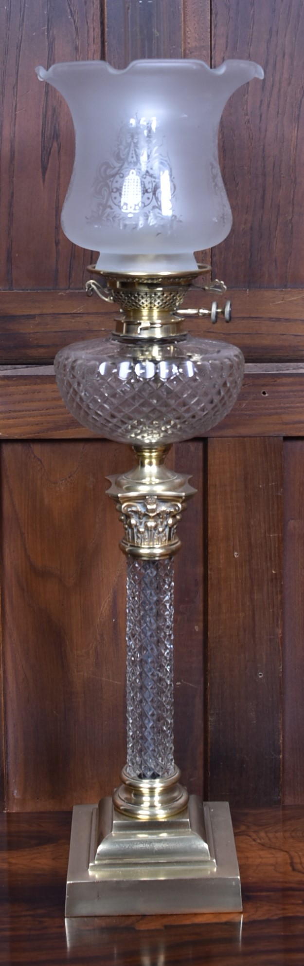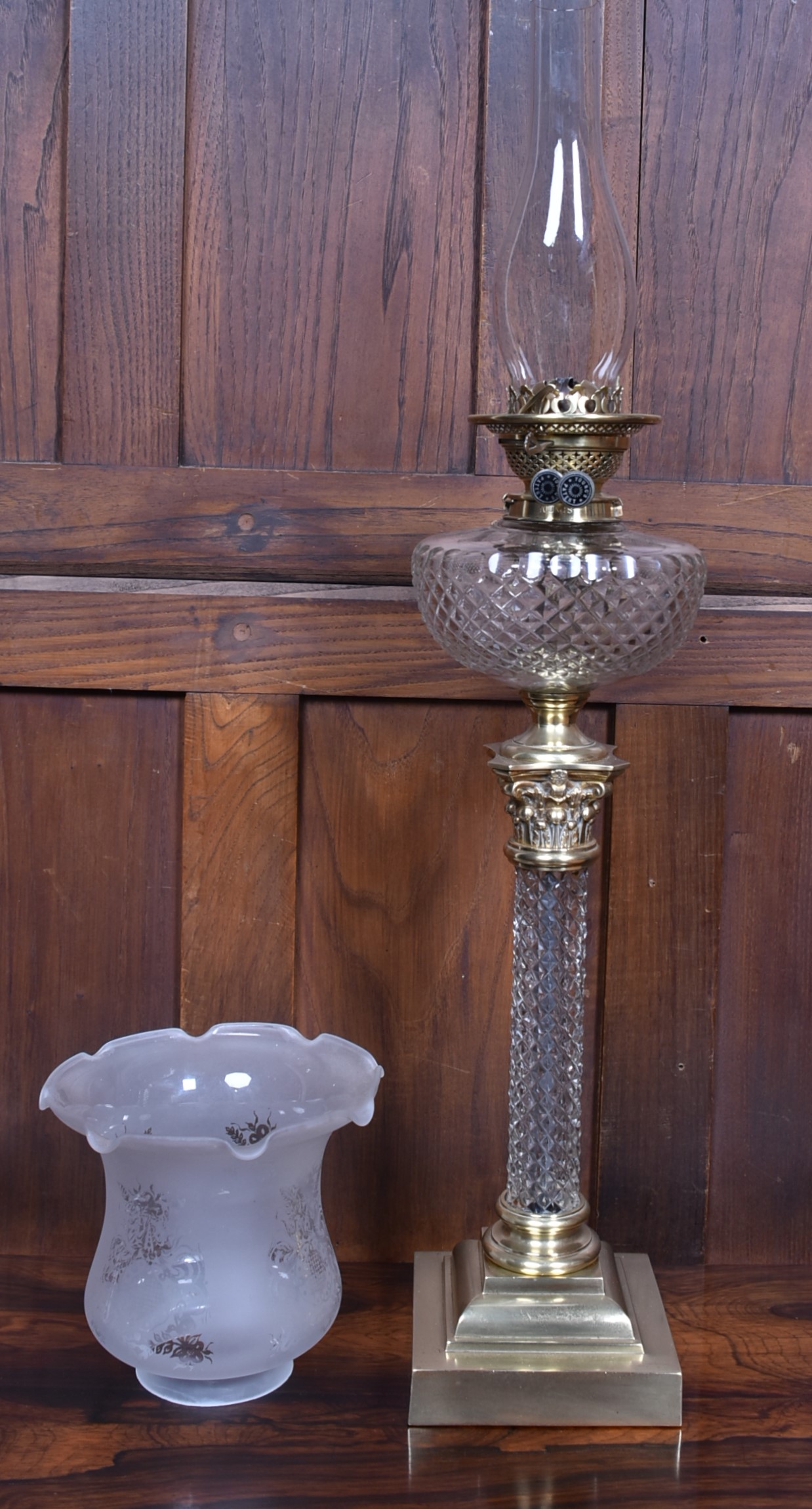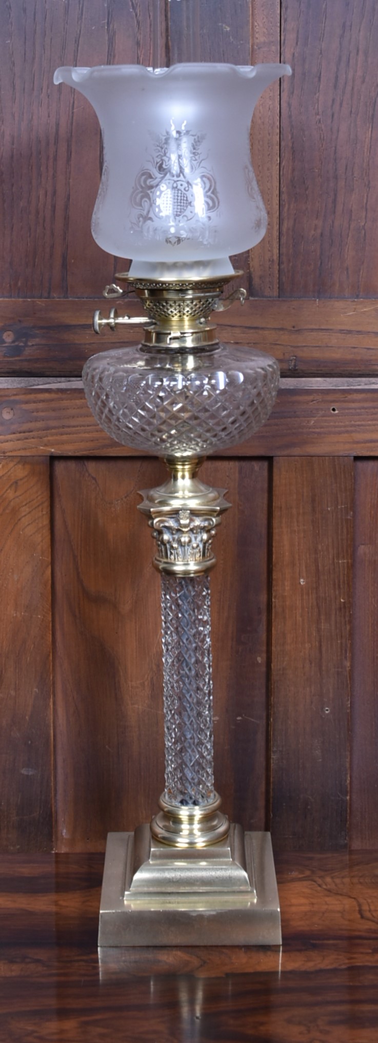 A fine Victorian oil/paraffin lamp distinguished by twin adjusters stamped “Young’s Special” , a mark of quality and provenance. Its embossed frosted glass tulip shade lends a gentle elegance, paired with a clear funnel and crystal reservoir, both in excellent condition. A single crystal column rises gracefully from a stepped brass base, completing the composition with classical poise. Fully functional and beautifully preserved, this lamp embodies the craftsmanship of 19th-century design. It offers both atmospheric illumination and timeless character , a perfect accent for traditional or eclectic interiors alike.