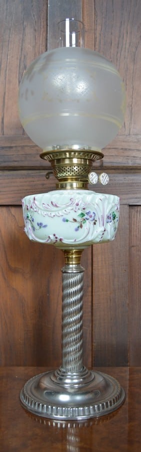 Superb Victorian oil / paraffin lamp with twin adjusters marked “DUPLEX”. This lamp has a frosted globe shade with etched floral detail, clear funnel and light green reservoir decorated with foliage. Raised on a single white metal ally support with circular base. This is still fully functional and in great condition and will light up any room.