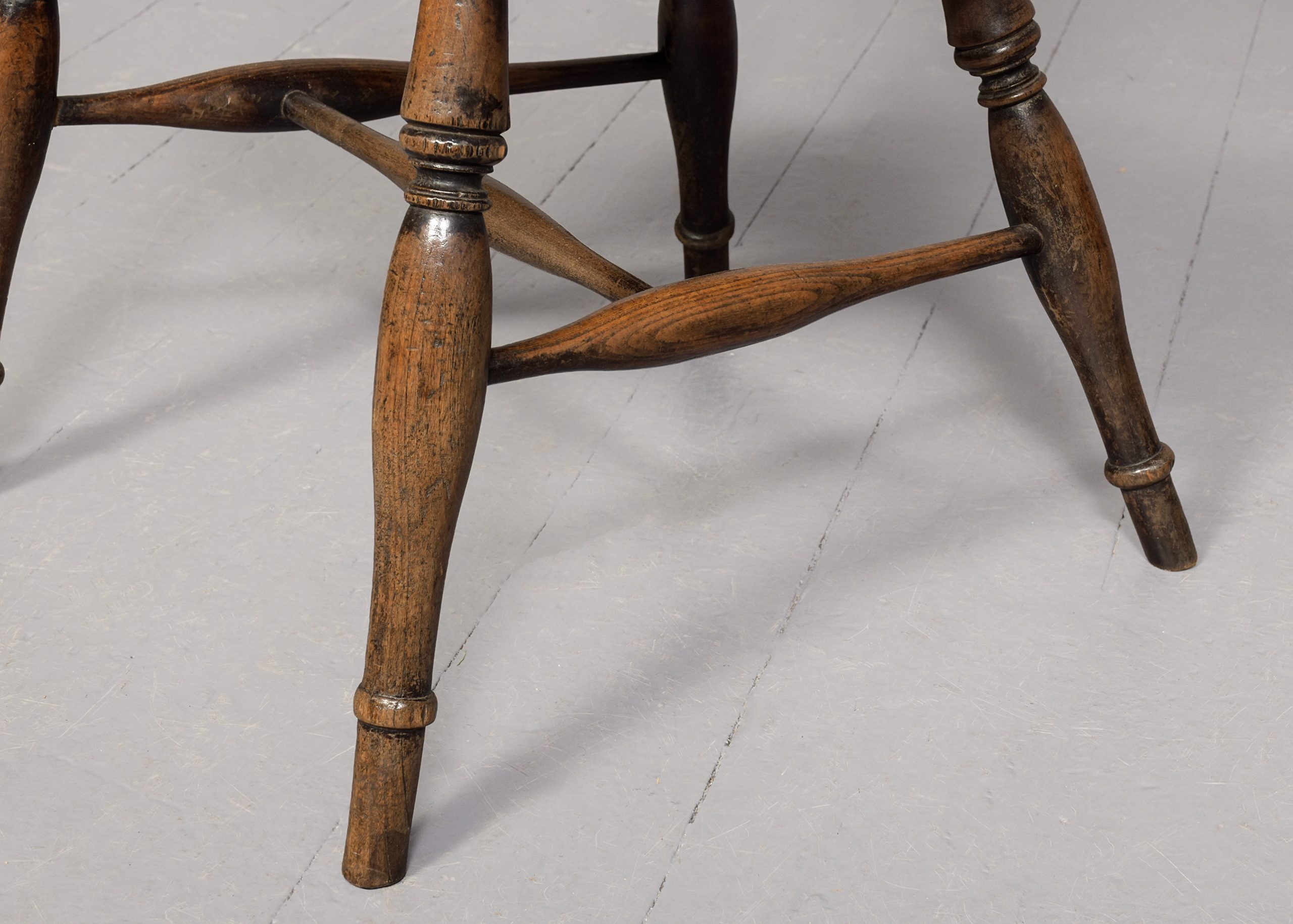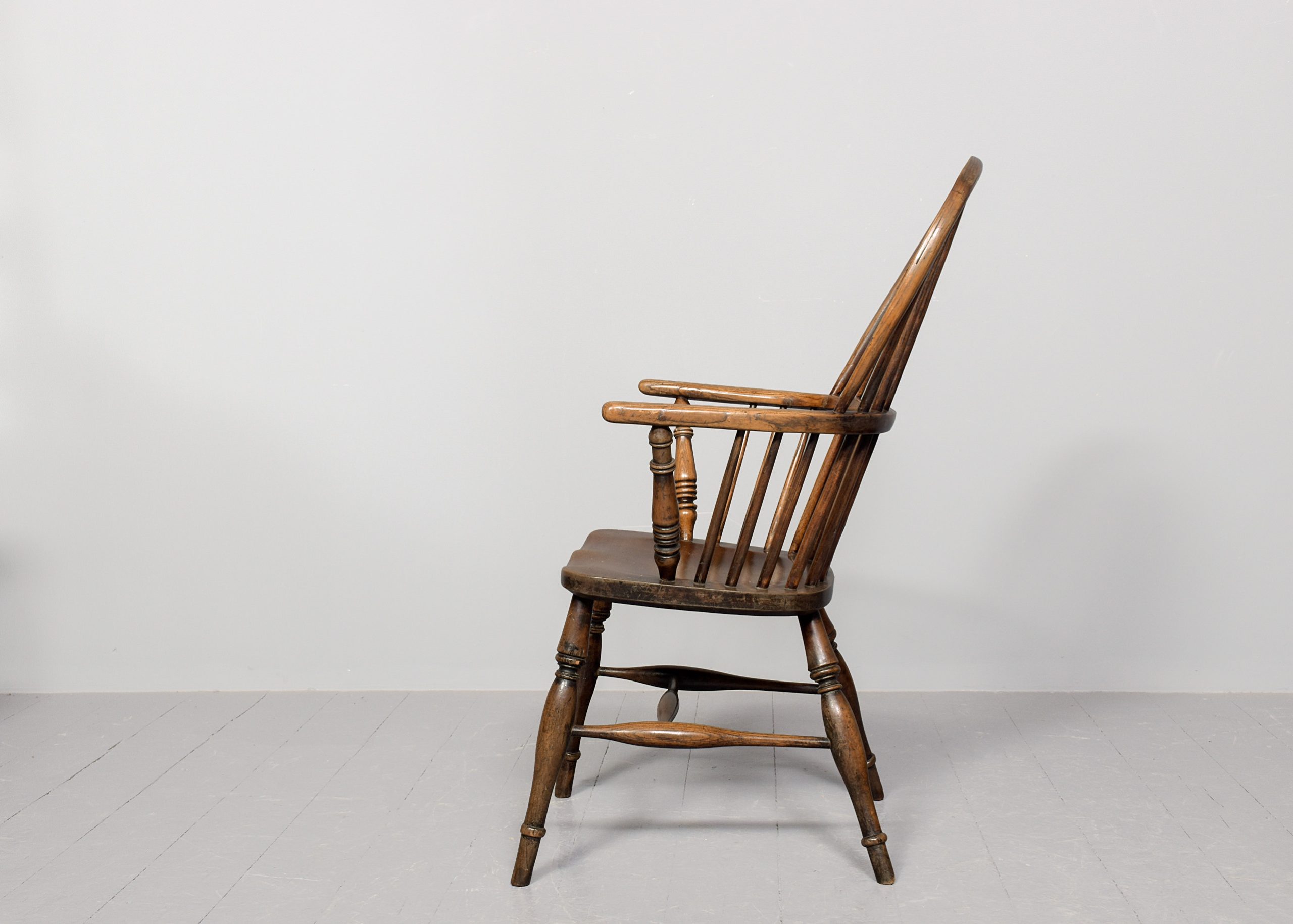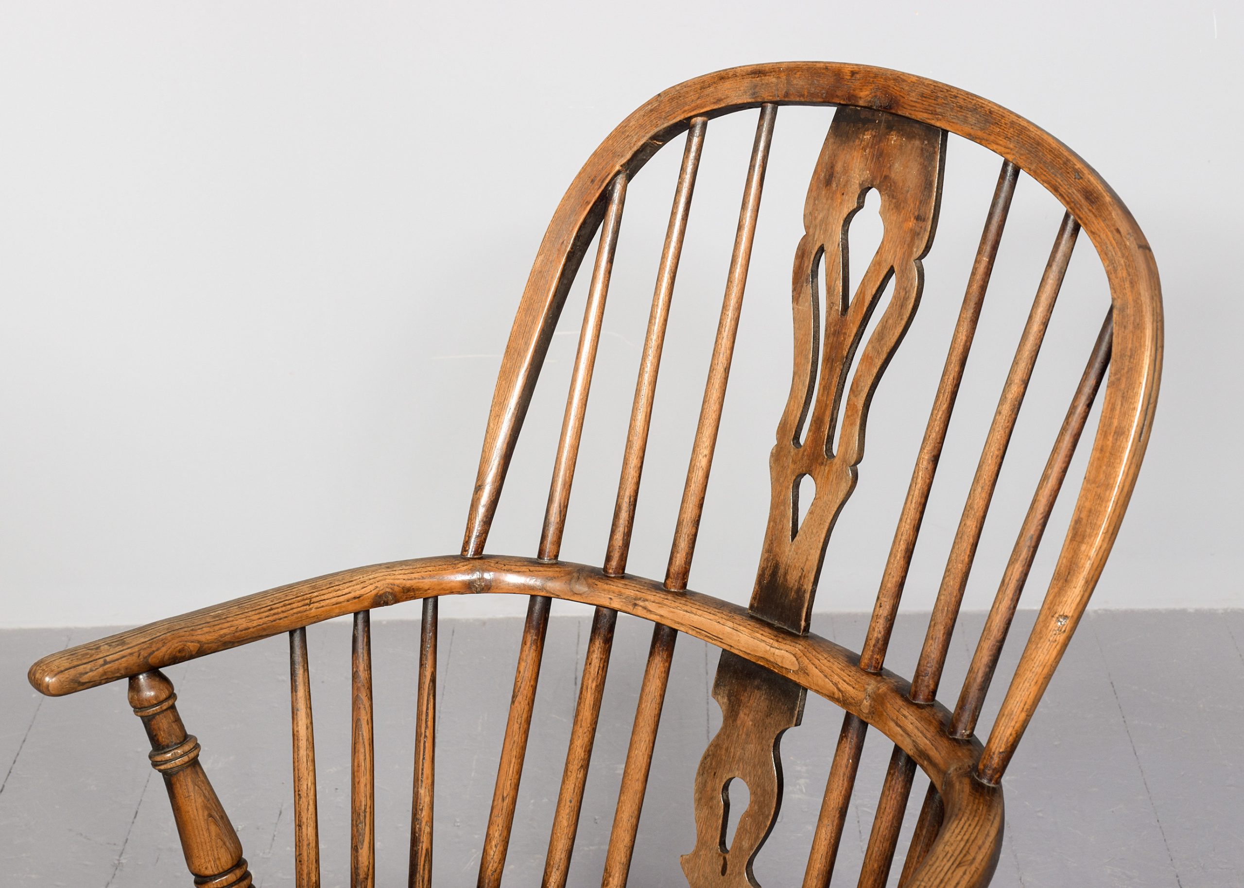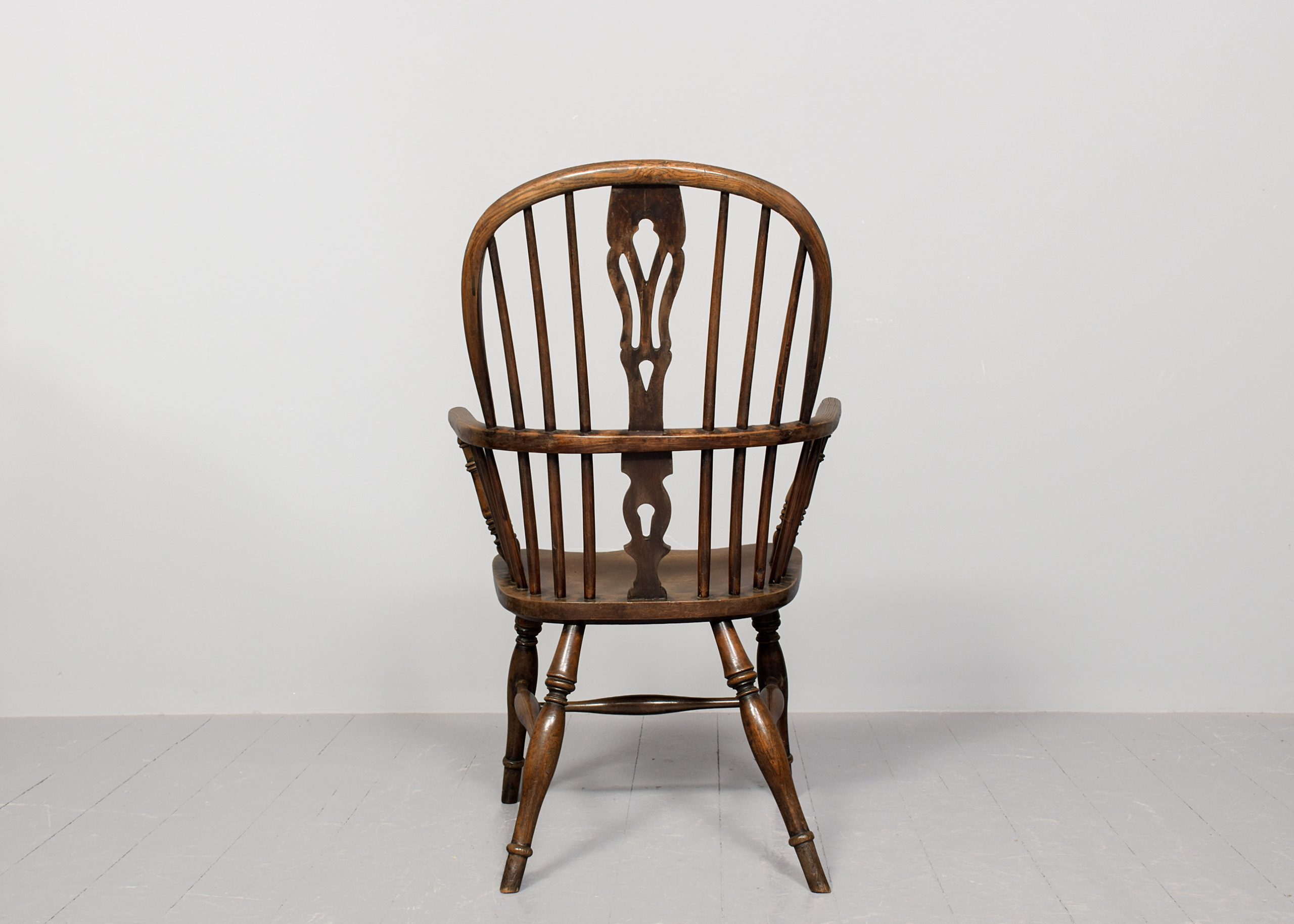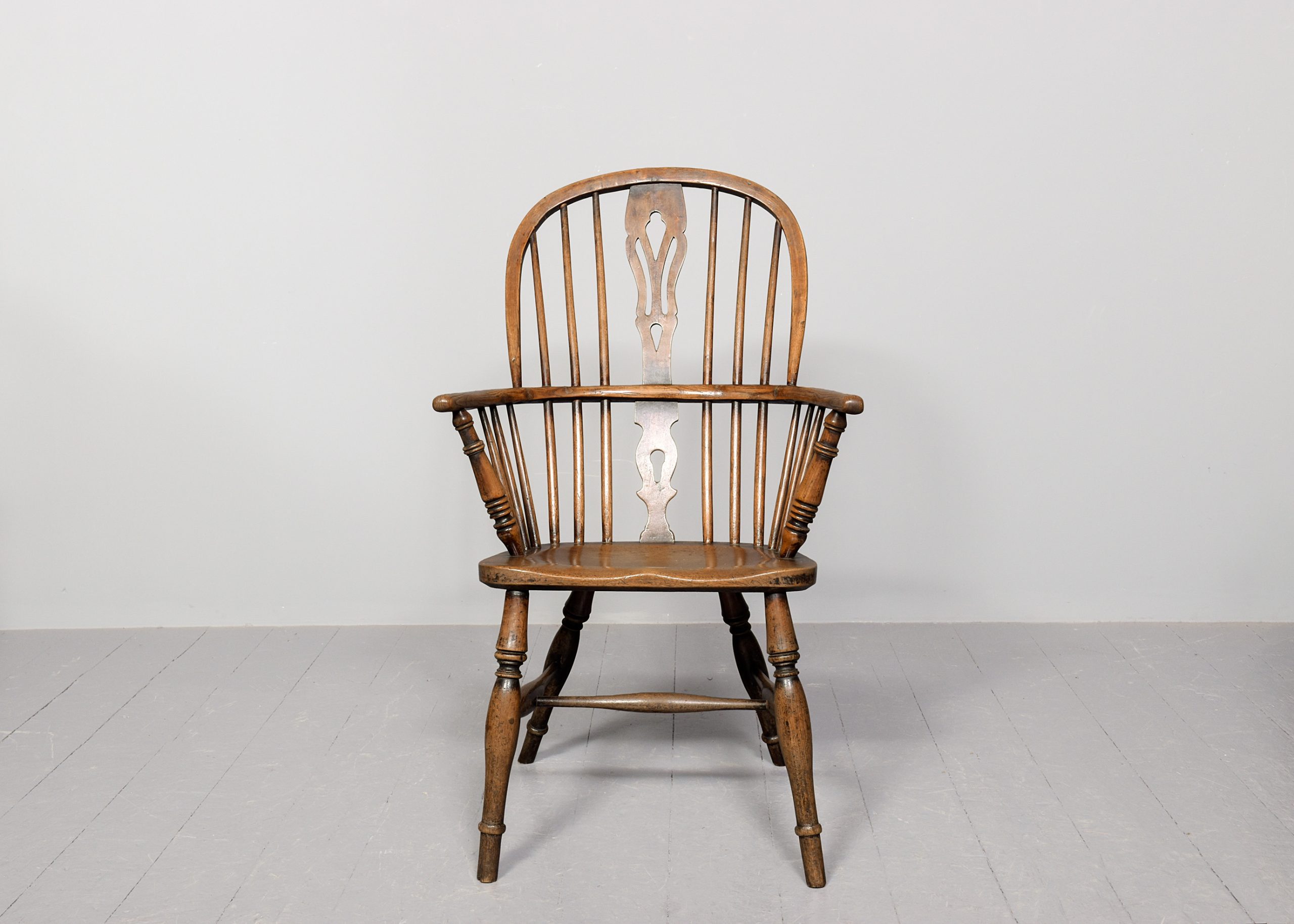 Circa 1870. Victorian elm and beech Windsor chair, the combed back chair supported by spindles and a pierced splat, the horseshoe-shaped centre forming the arms, supported on turned uprights, the solid scooped and shaped seat supporting all of the spindles and the splat, resting on four turned and splayed legs, braced by conforming turned stretchers.