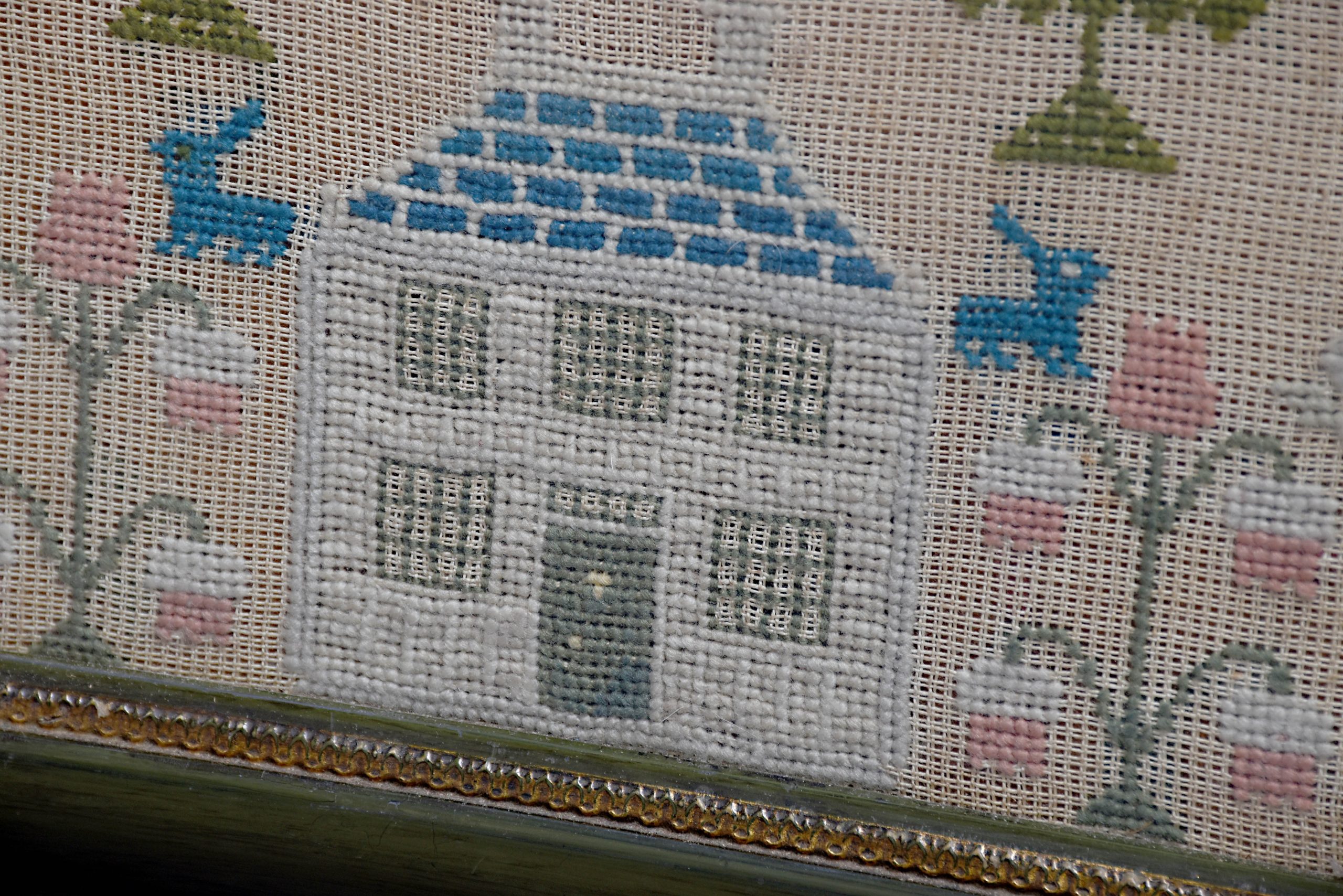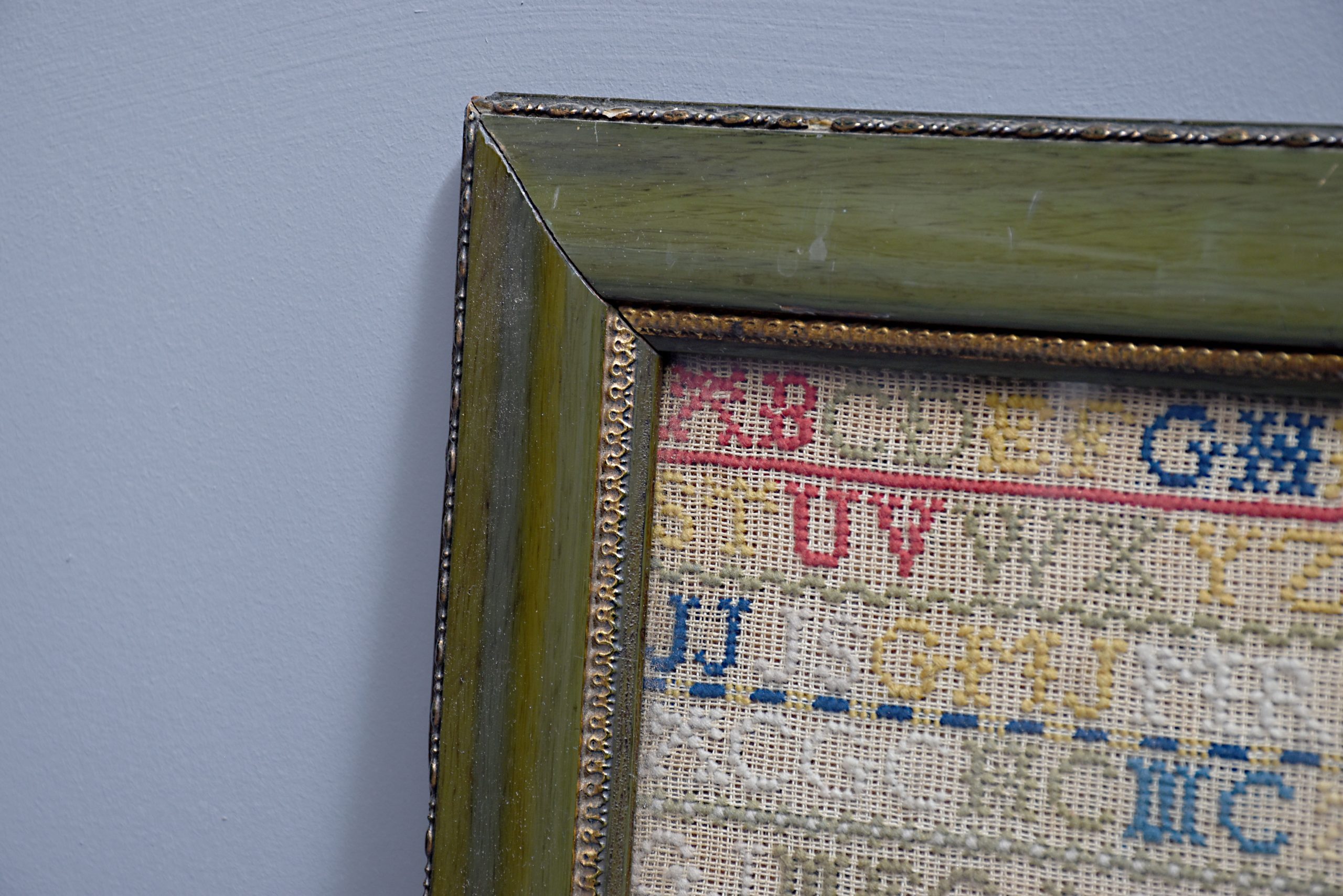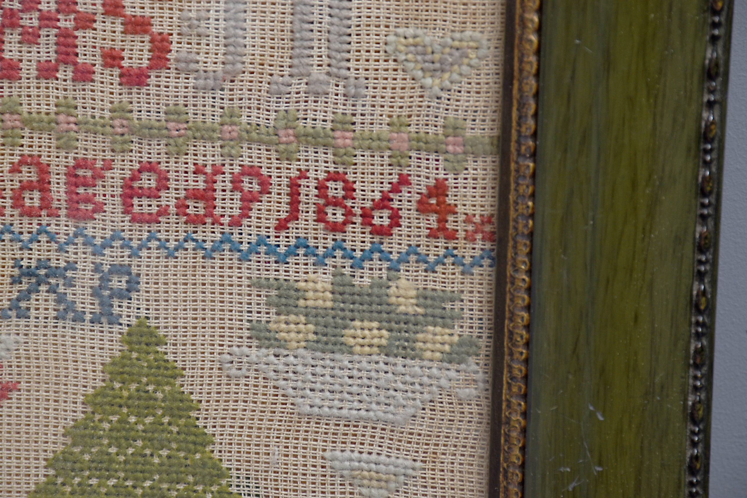 Victorian framed wool-work embroidered sampler with good colours, with multi-coloured trees, plants and a house and the usual alphabet signed “Margaret Jolly Aged 9, 1864”. Within a green moulded frame with gilt decorations.