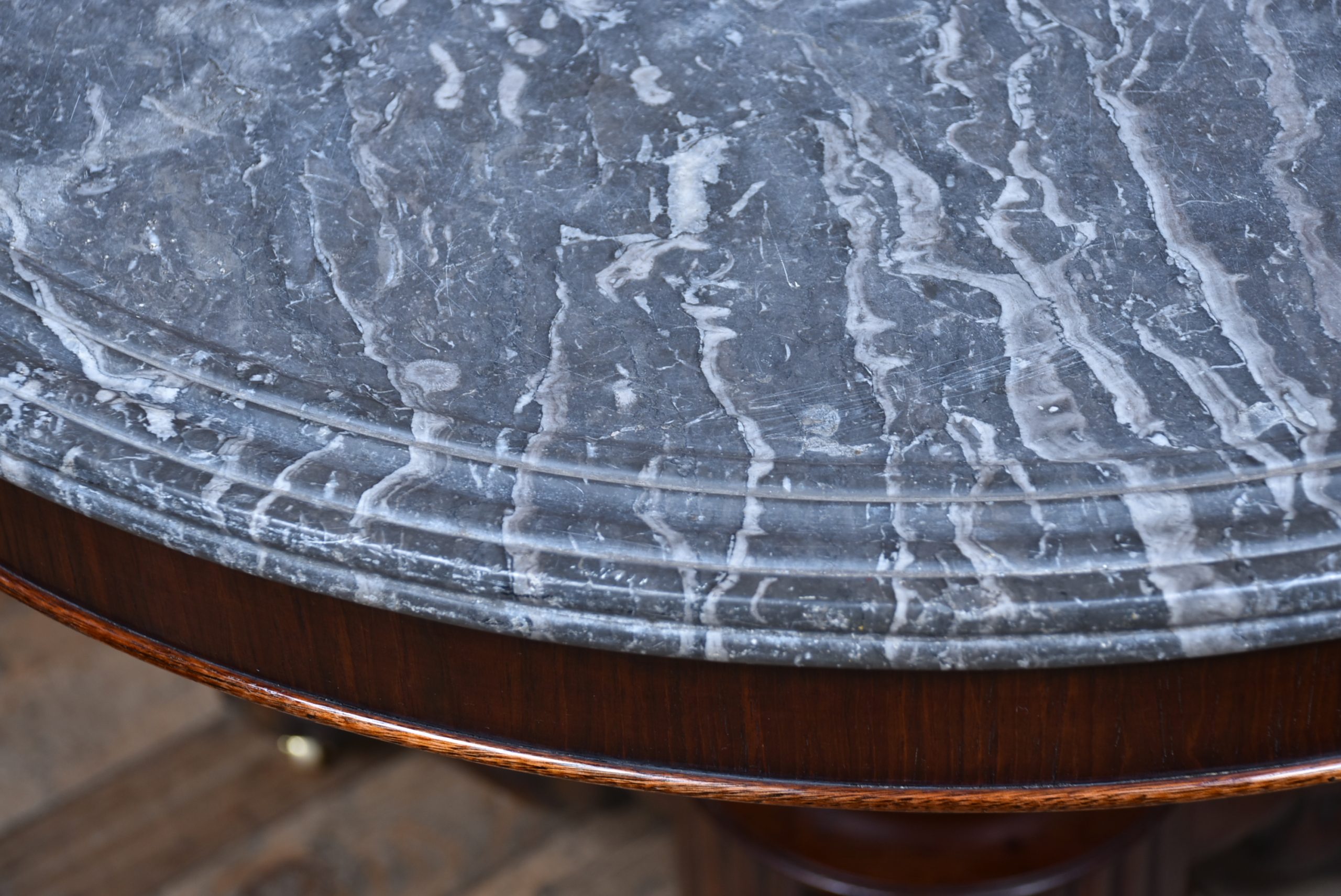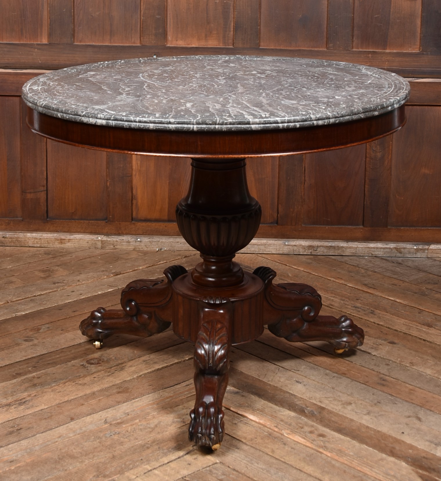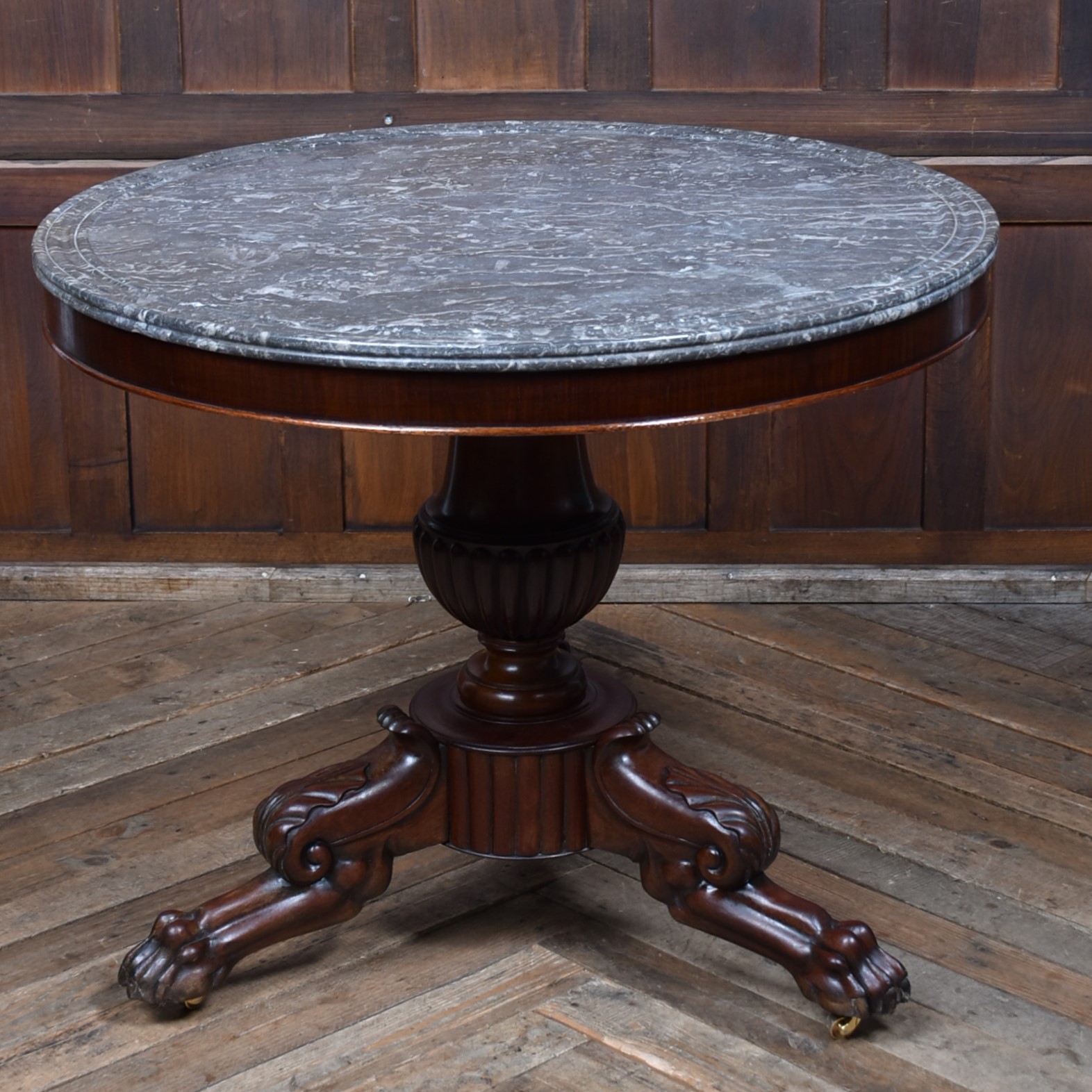 An exceptional French gueridon from the 19th century, presented in superb condition and showcasing the elegance of period craftsmanship. The circular black and white marble top features a wide moulded edge and concentric rings, intended to prevent spills from running over the sides. The marble rests upon a boldly carved, bulbous central column, which rises from a finely sculpted tri-form base adorned with acanthus scrolls and terminating in robust paw feet, each set on original brass castors. The wood retains a rich, polished patina that beautifully offsets the cool refinement of the marble. Both decorative and functional, this piece offering timeless sophistication to any home.
