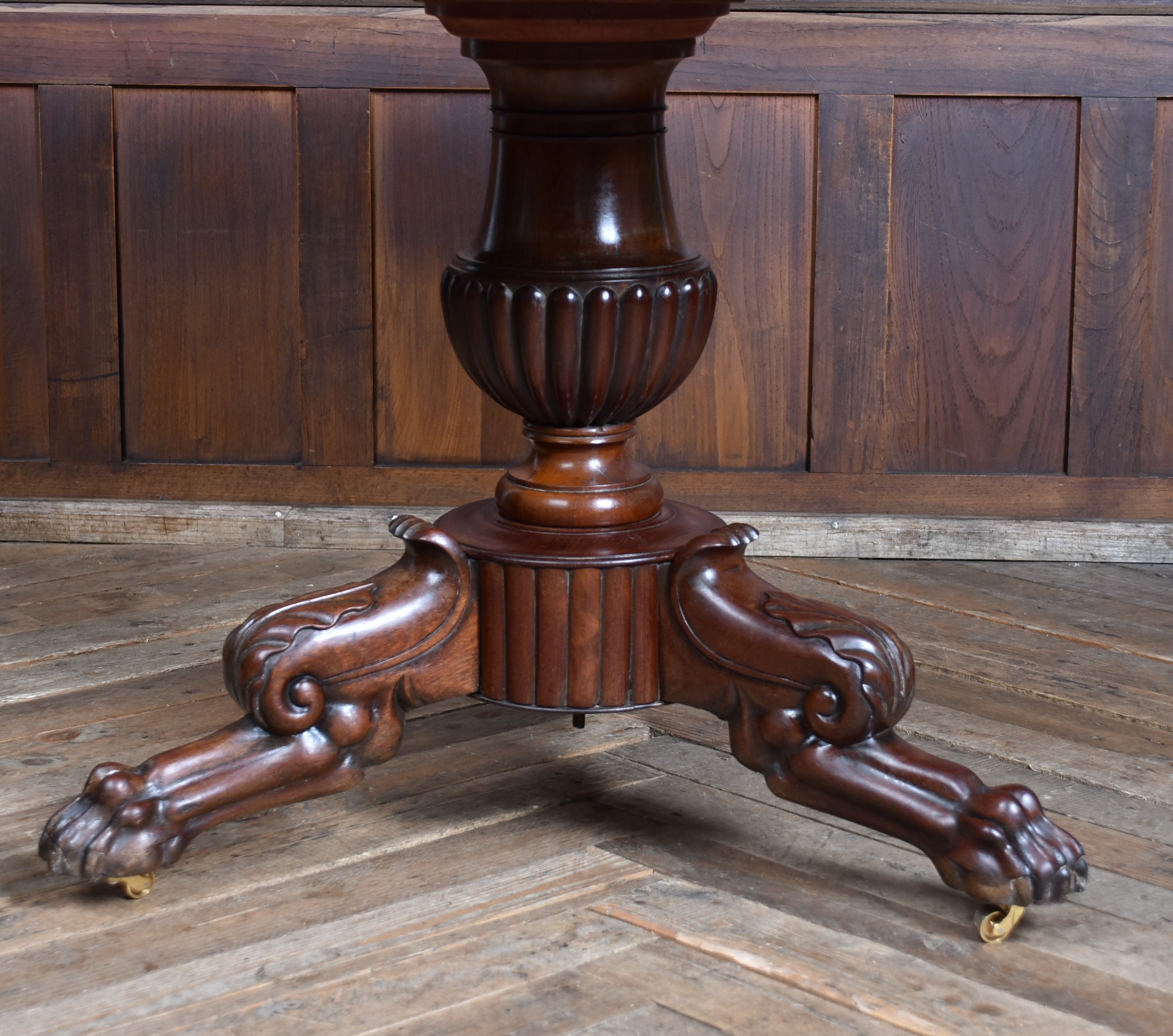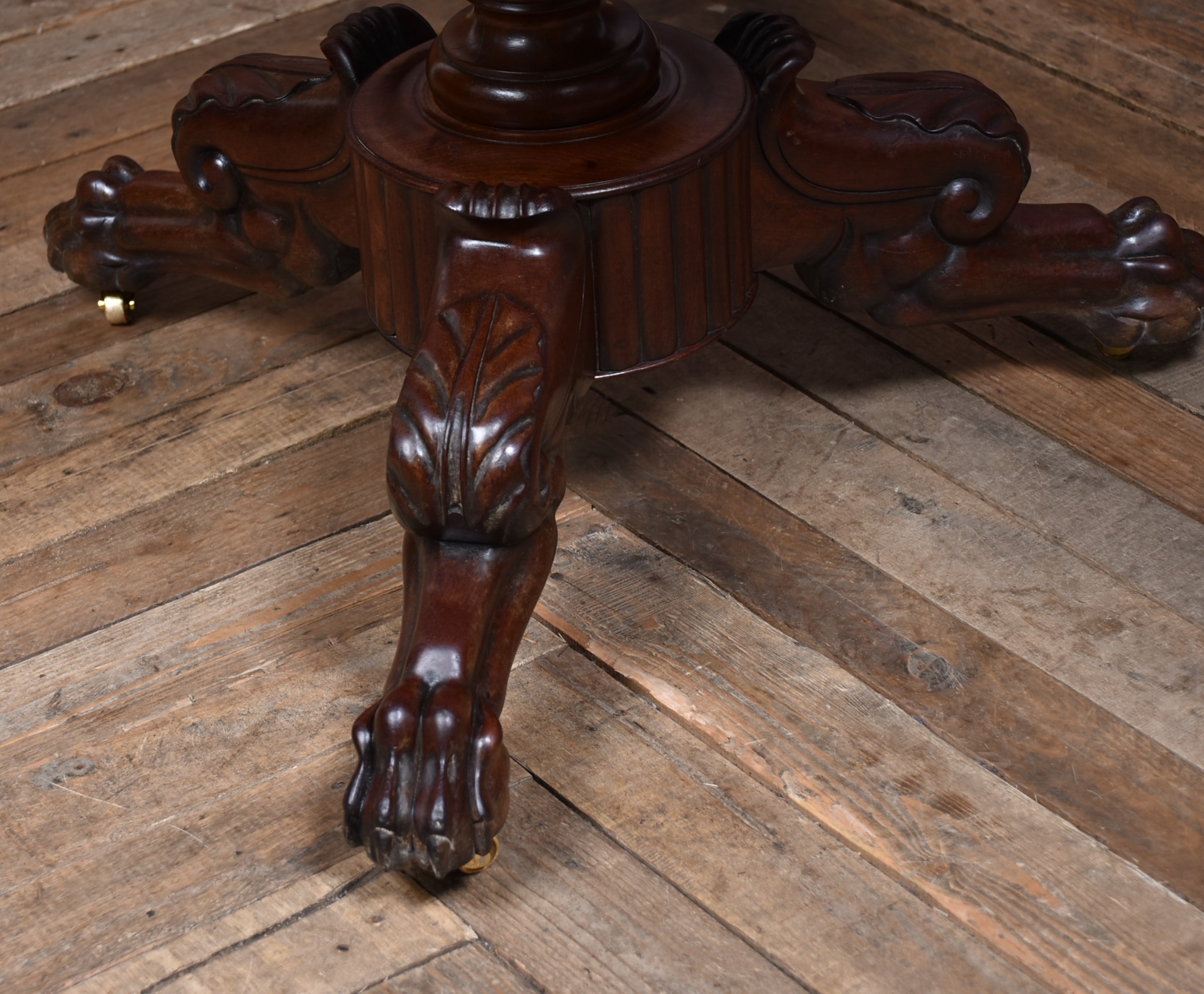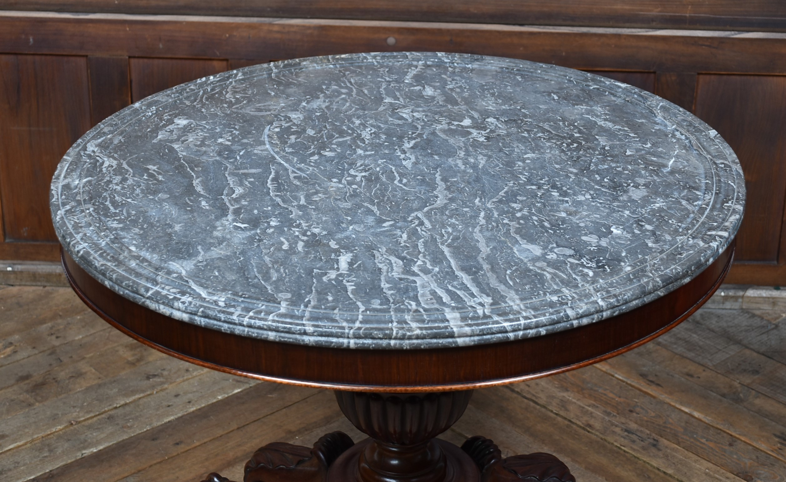 An exceptional French gueridon from the 19th century, presented in superb condition and showcasing the elegance of period craftsmanship. The circular black and white marble top features a wide moulded edge and concentric rings, intended to prevent spills from running over the sides. The marble rests upon a boldly carved, bulbous central column, which rises from a finely sculpted tri-form base adorned with acanthus scrolls and terminating in robust paw feet, each set on original brass castors. The wood retains a rich, polished patina that beautifully offsets the cool refinement of the marble. Both decorative and functional, this piece offering timeless sophistication to any home.