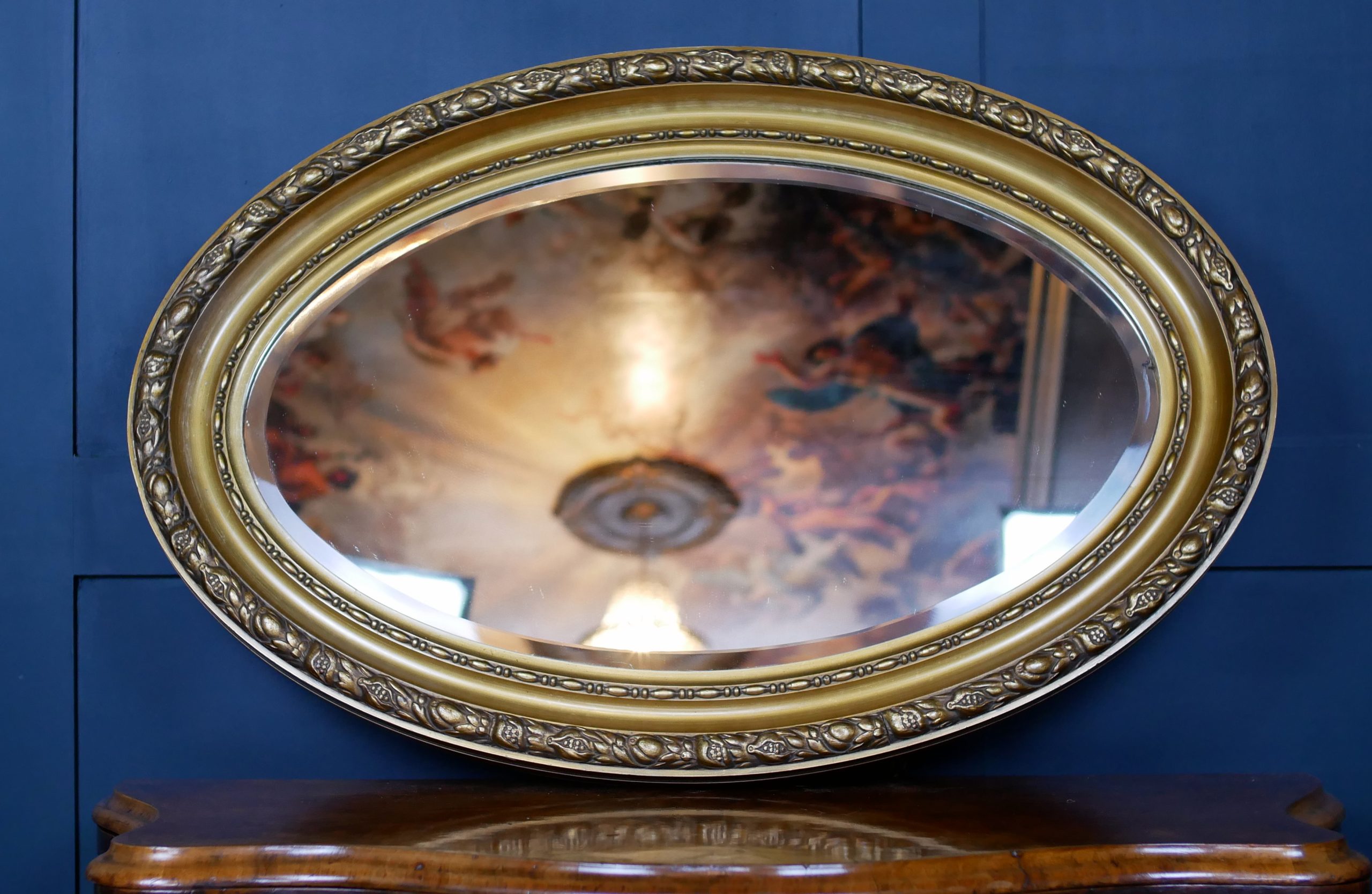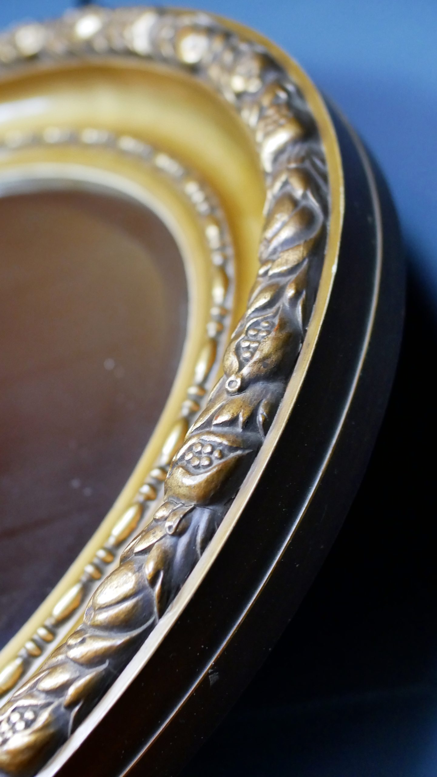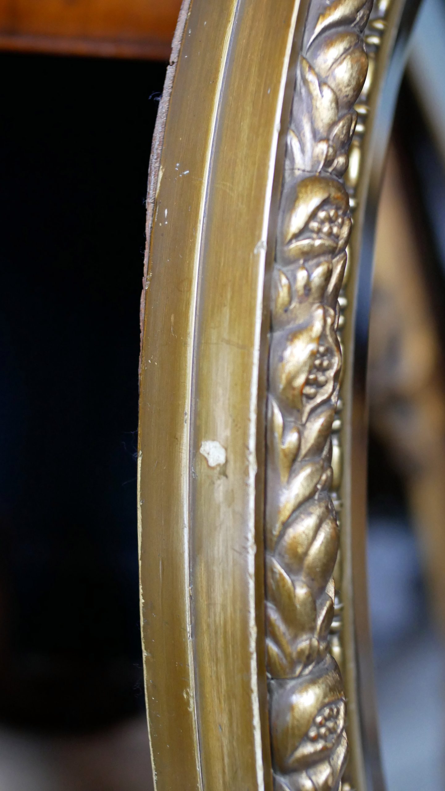 Ornate Detailing: The frame features beautiful, continuous relief carving in gesso, showcasing intricate floral and foliate motifs that wrap elegantly around the oval silhouette.