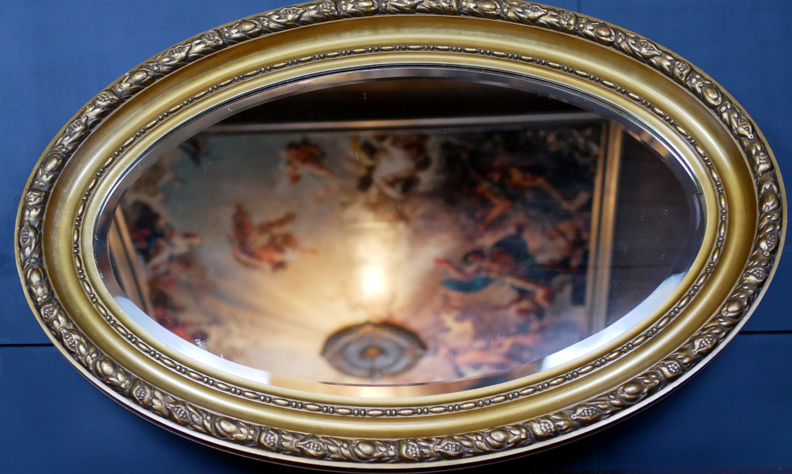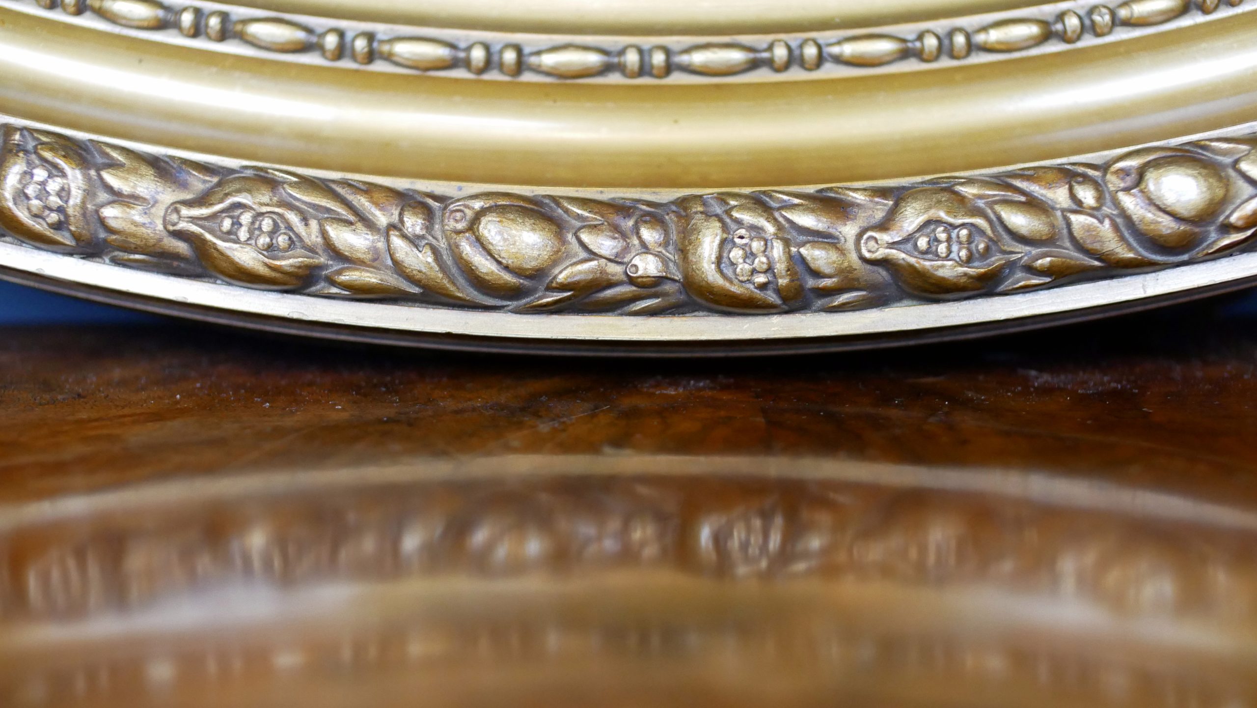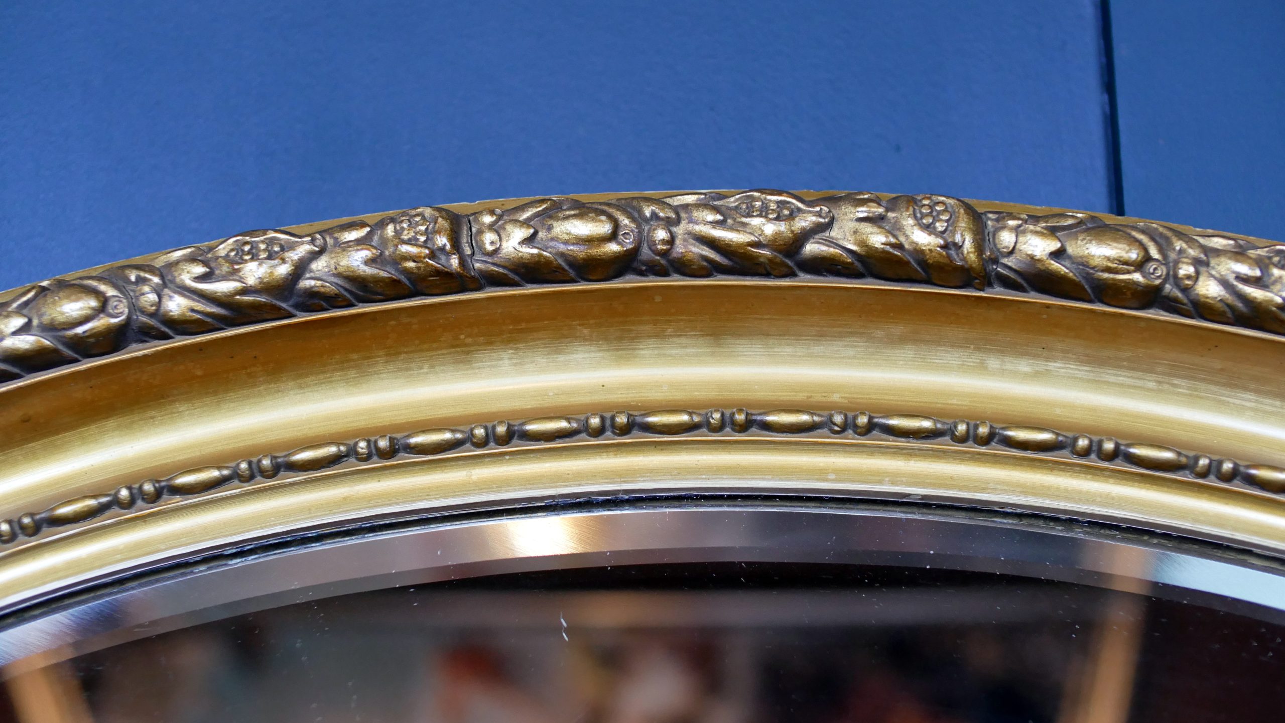 Ornate Detailing: The frame features beautiful, continuous relief carving in gesso, showcasing intricate floral and foliate motifs that wrap elegantly around the oval silhouette.