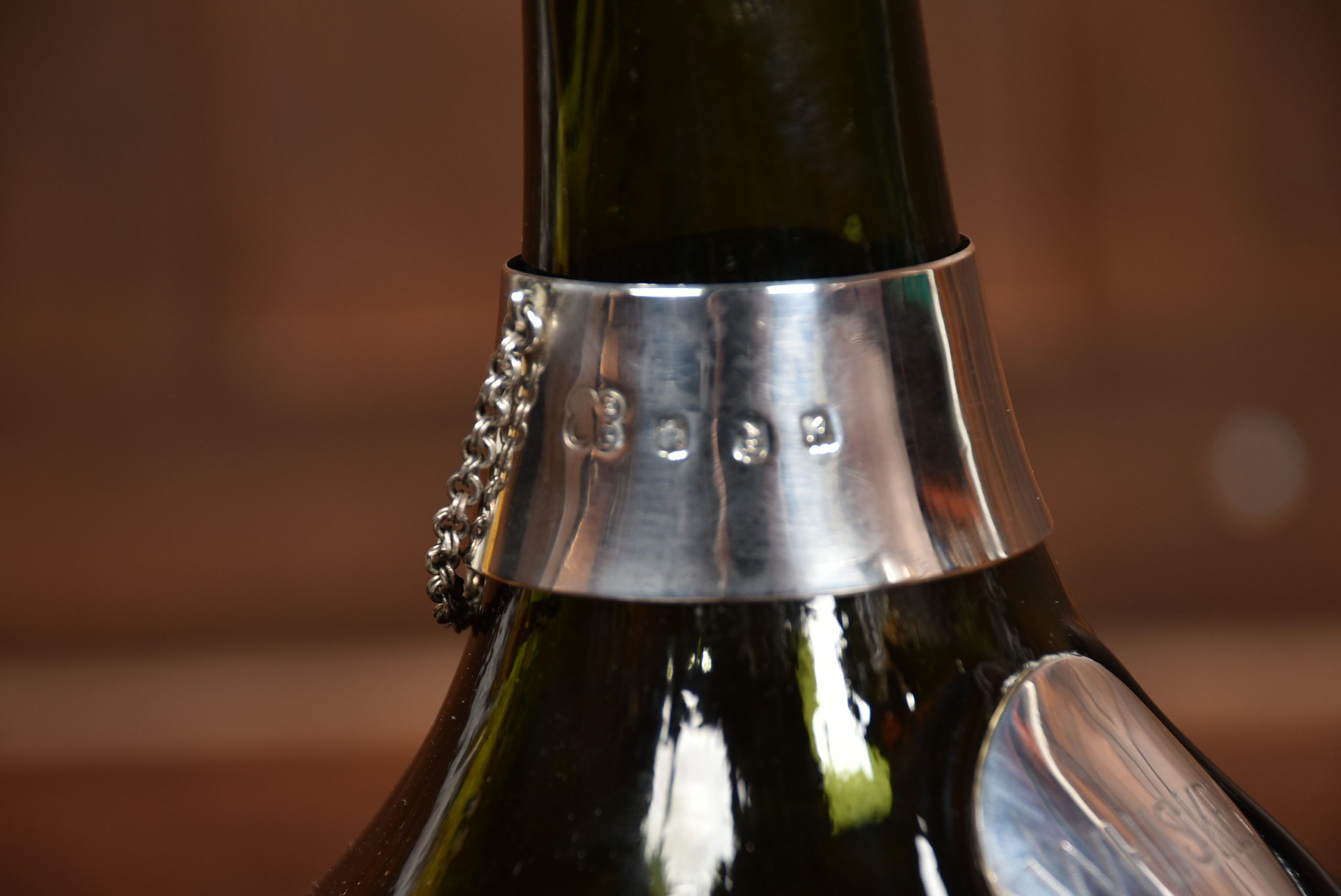 A handsome late Victorian decanter in deep green glass, elegantly proportioned and richly detailed. The wide-bodied form tapers to a slender neck, adorned with a hallmarked silver cuff and topped with a domed silver stopper, both retaining their original lustre. All silver elements are stamped for Glasgow, 1897, and bear the maker’s mark of David & George Edwards, renowned silversmiths of Buchanan Street. Their work is celebrated for its refined execution and quality. A fine example of Scottish craftsmanship, this decanter would make a distinguished addition to any barware collection.