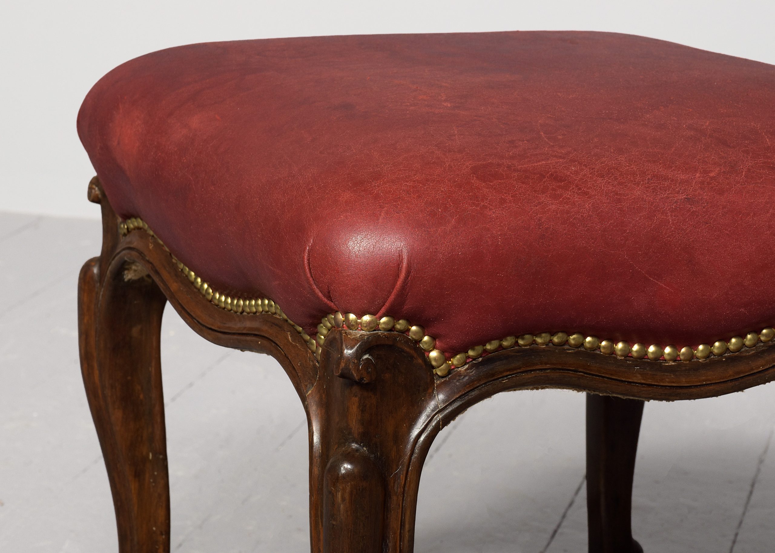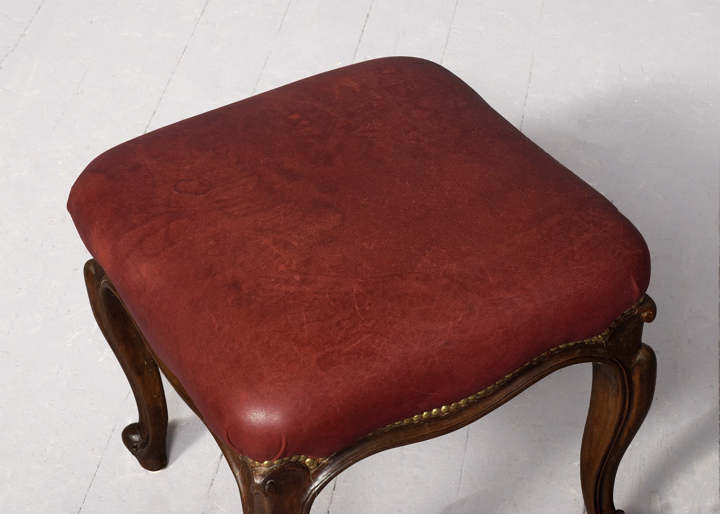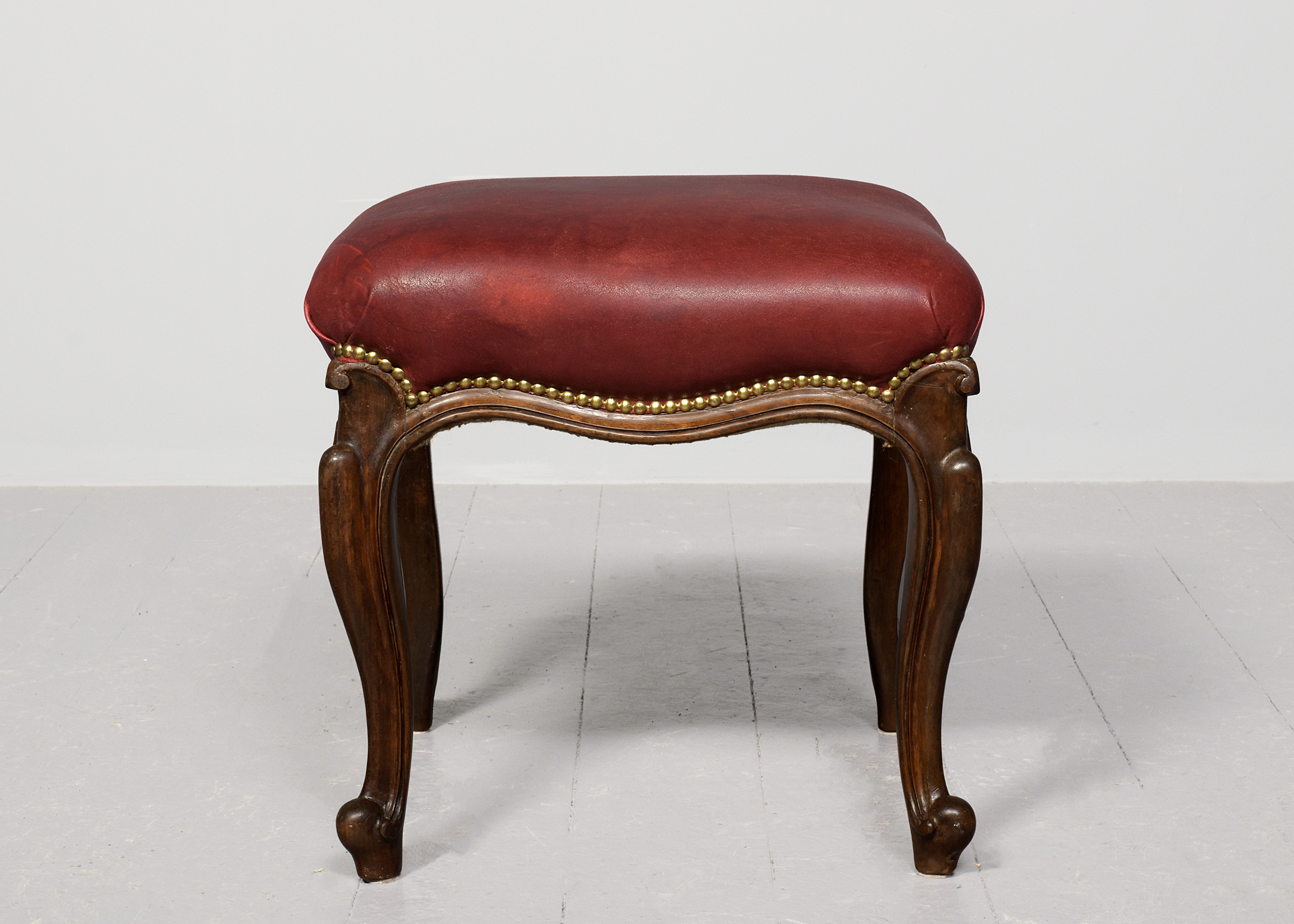 Circa 1860. A mid-Victorian leather upholstered cabriole-legged stool, upholstered burgundy leather with closed brass studding, the frame with a shaped and beaded serpentine rail over four elegant cabriole legs, finishing with a curled and extended toe.