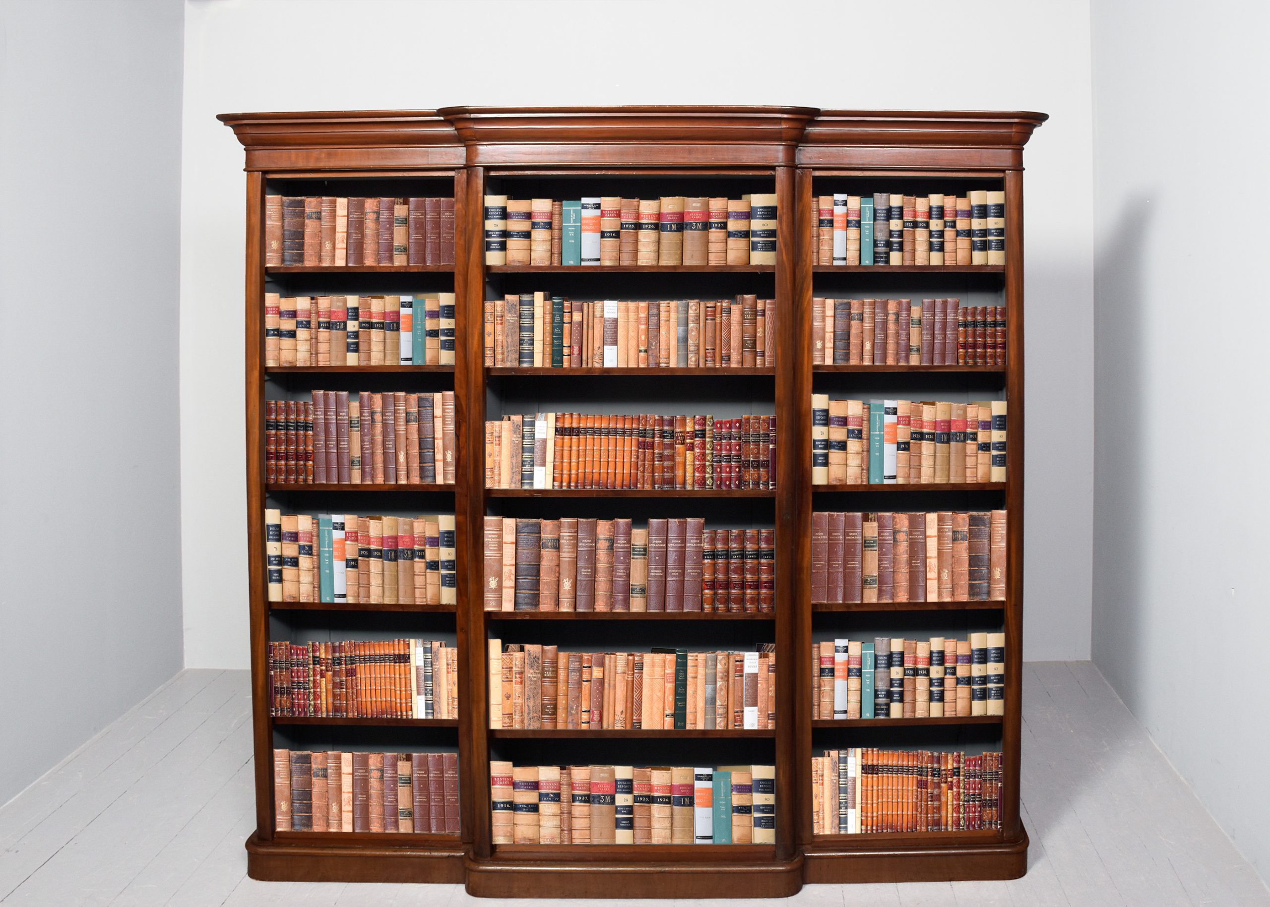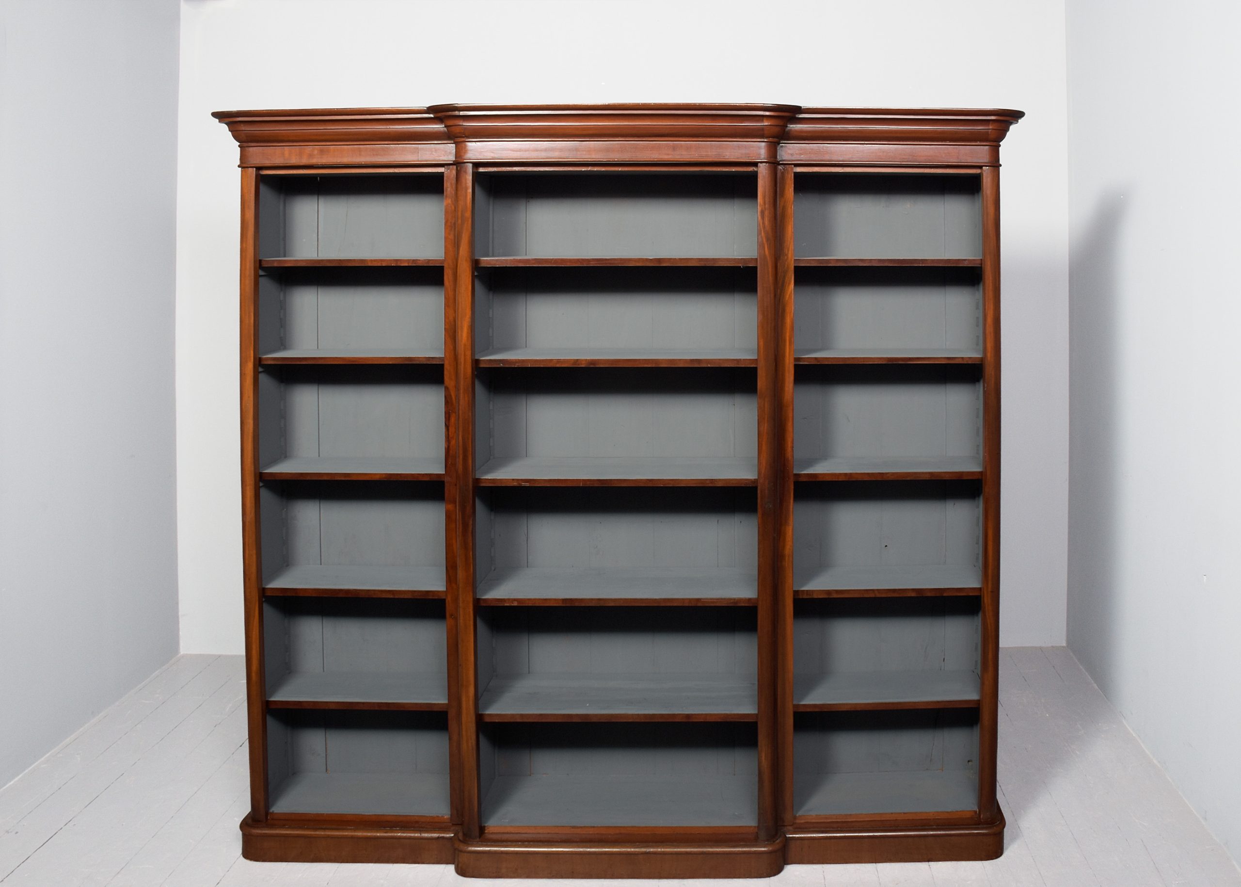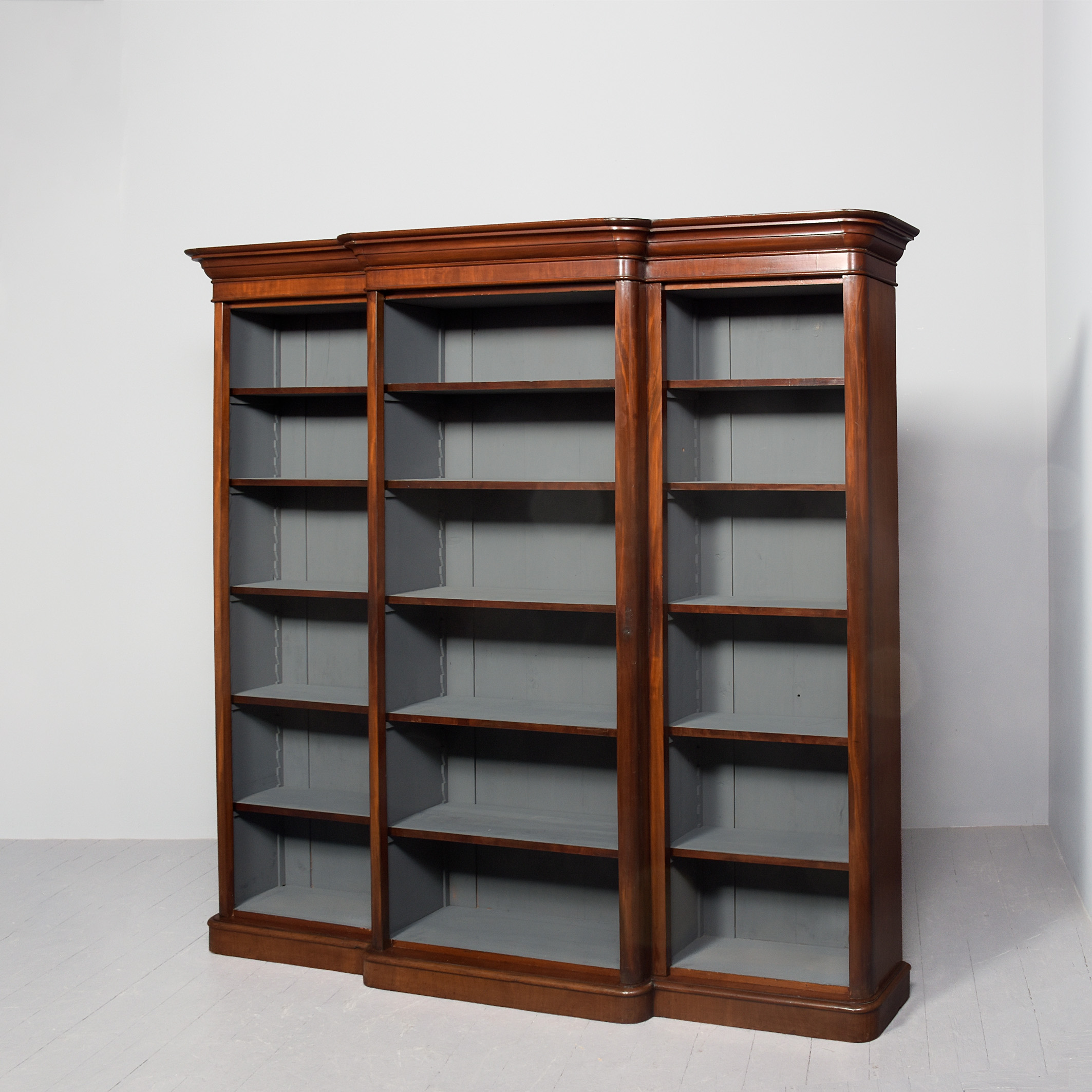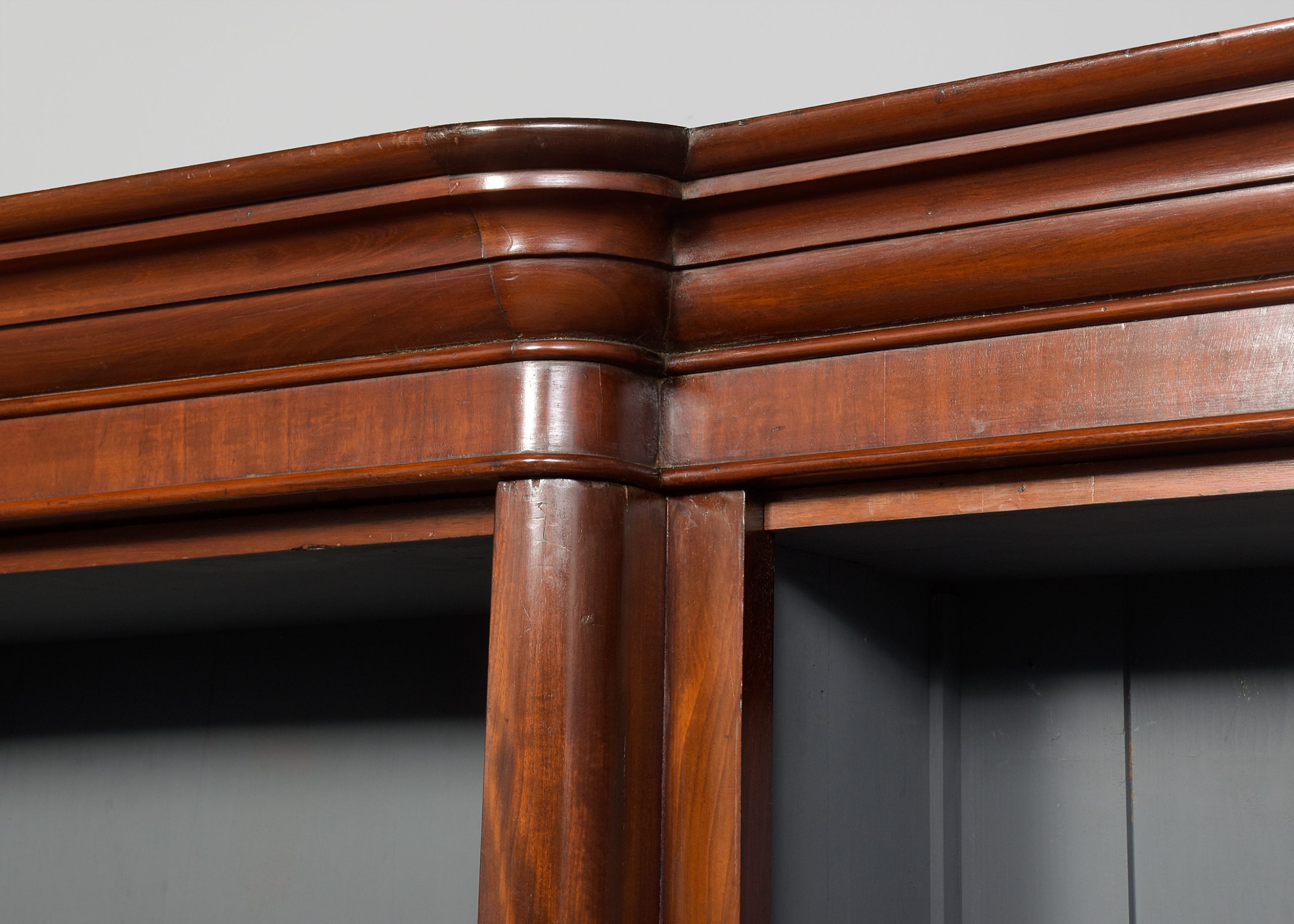 Circa 1860 with adaptations. Victorian mahogany breakfront bookcase. Surmounted by a moulded breakfront cornice over a simple crossbanded beaded frieze, in three sections including a deeper central section, each with five adjustable shelves, all flanked by simple mahogany pilasters. Supported on enclosed breakfront base. In excellent condition. Its simple, clean lines would suit a contemporary or modern setting.