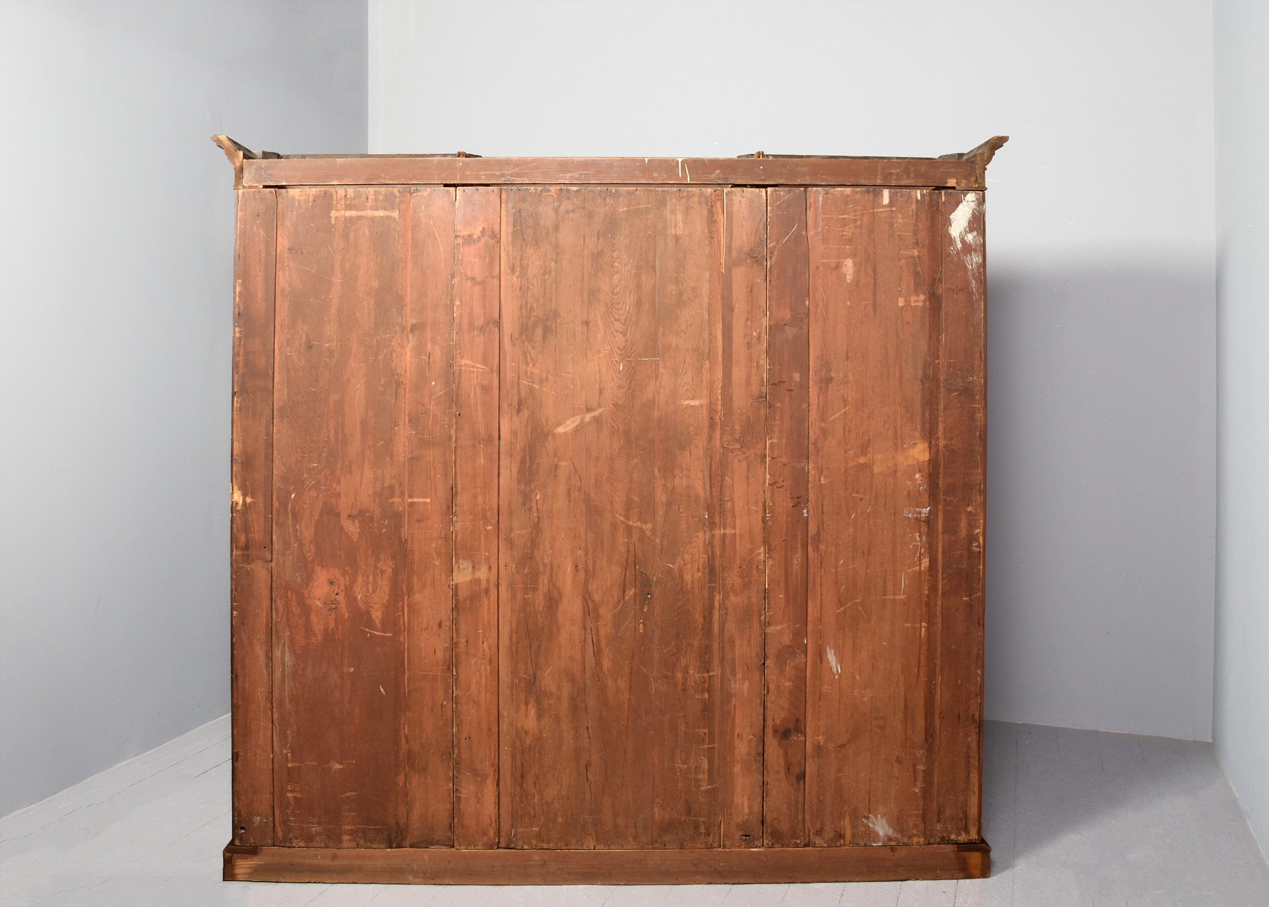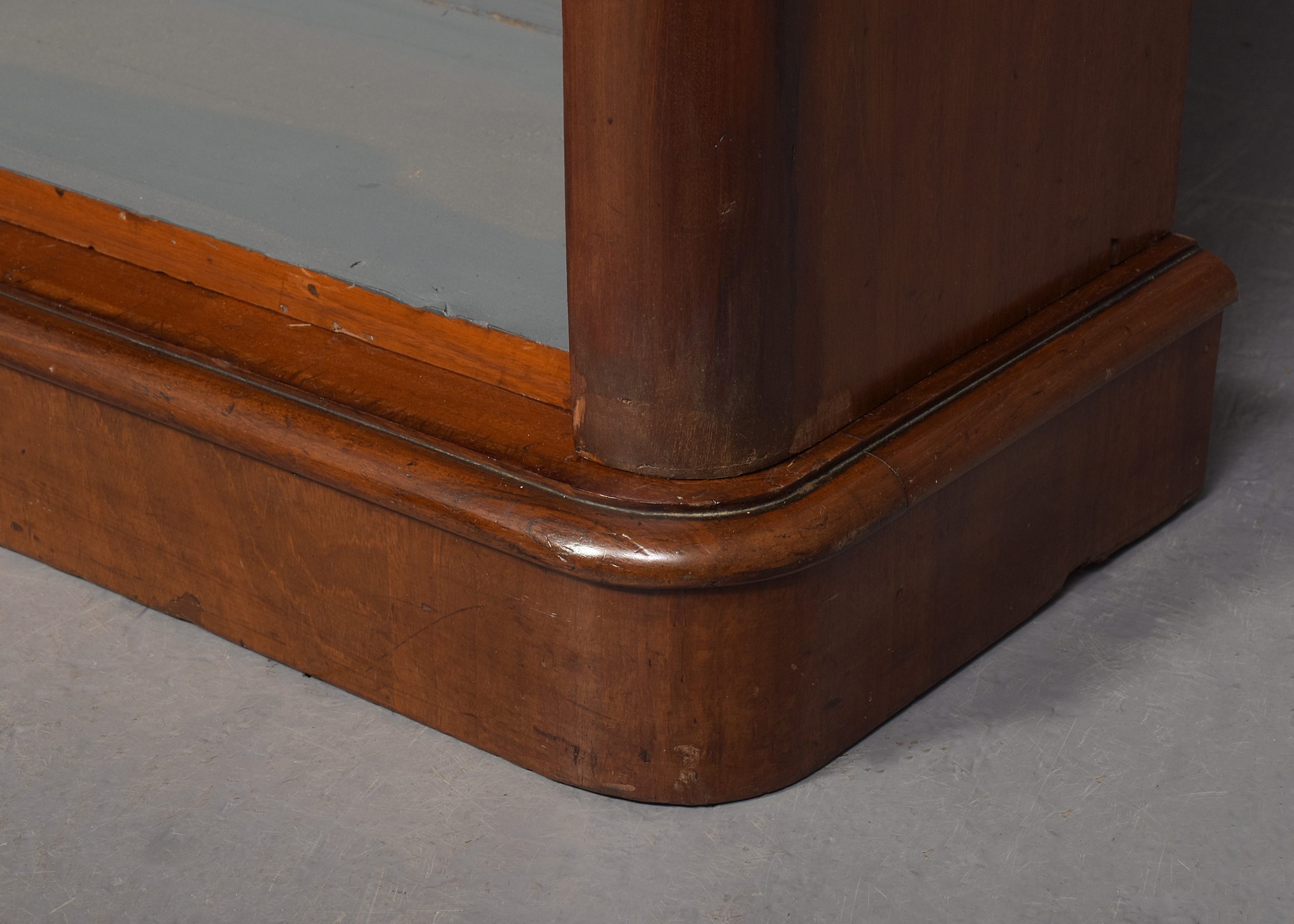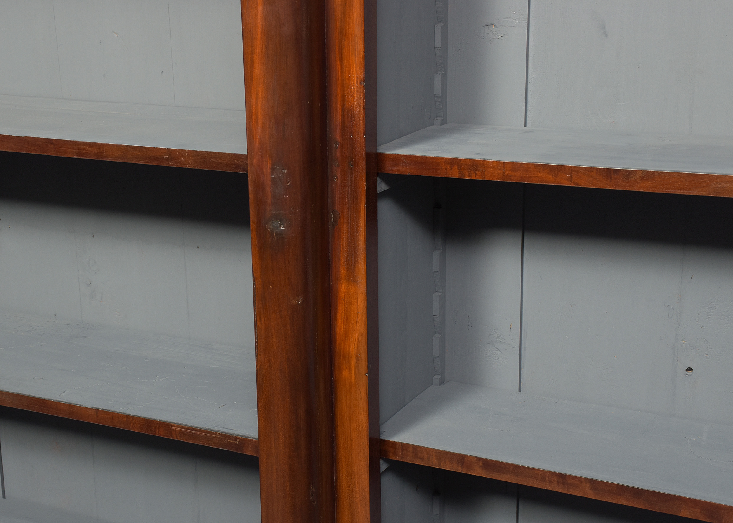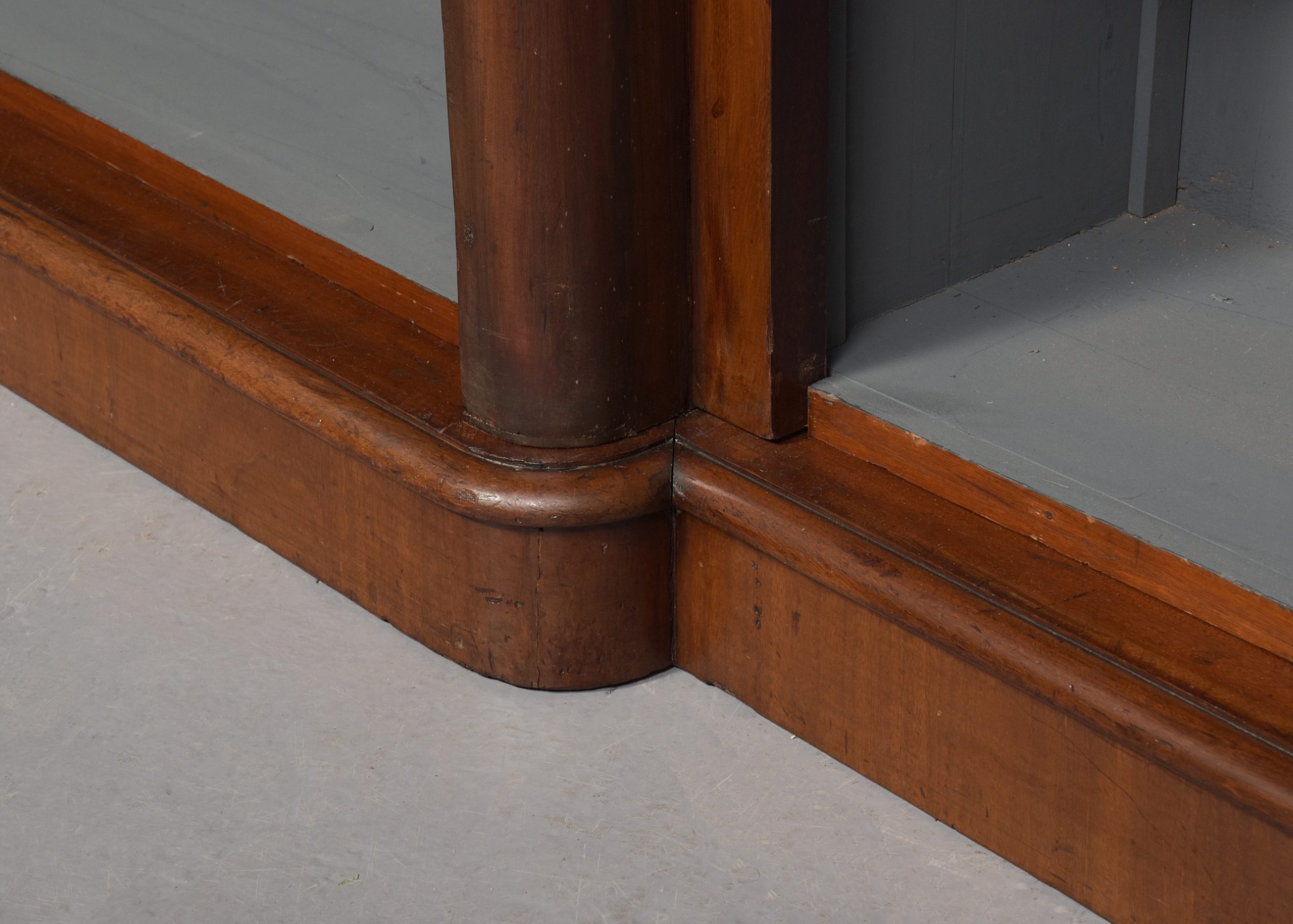 Circa 1860 with adaptations. Victorian mahogany breakfront bookcase. Surmounted by a moulded breakfront cornice over a simple crossbanded beaded frieze, in three sections including a deeper central section, each with five adjustable shelves, all flanked by simple mahogany pilasters. Supported on enclosed breakfront base. In excellent condition. Its simple, clean lines would suit a contemporary or modern setting.