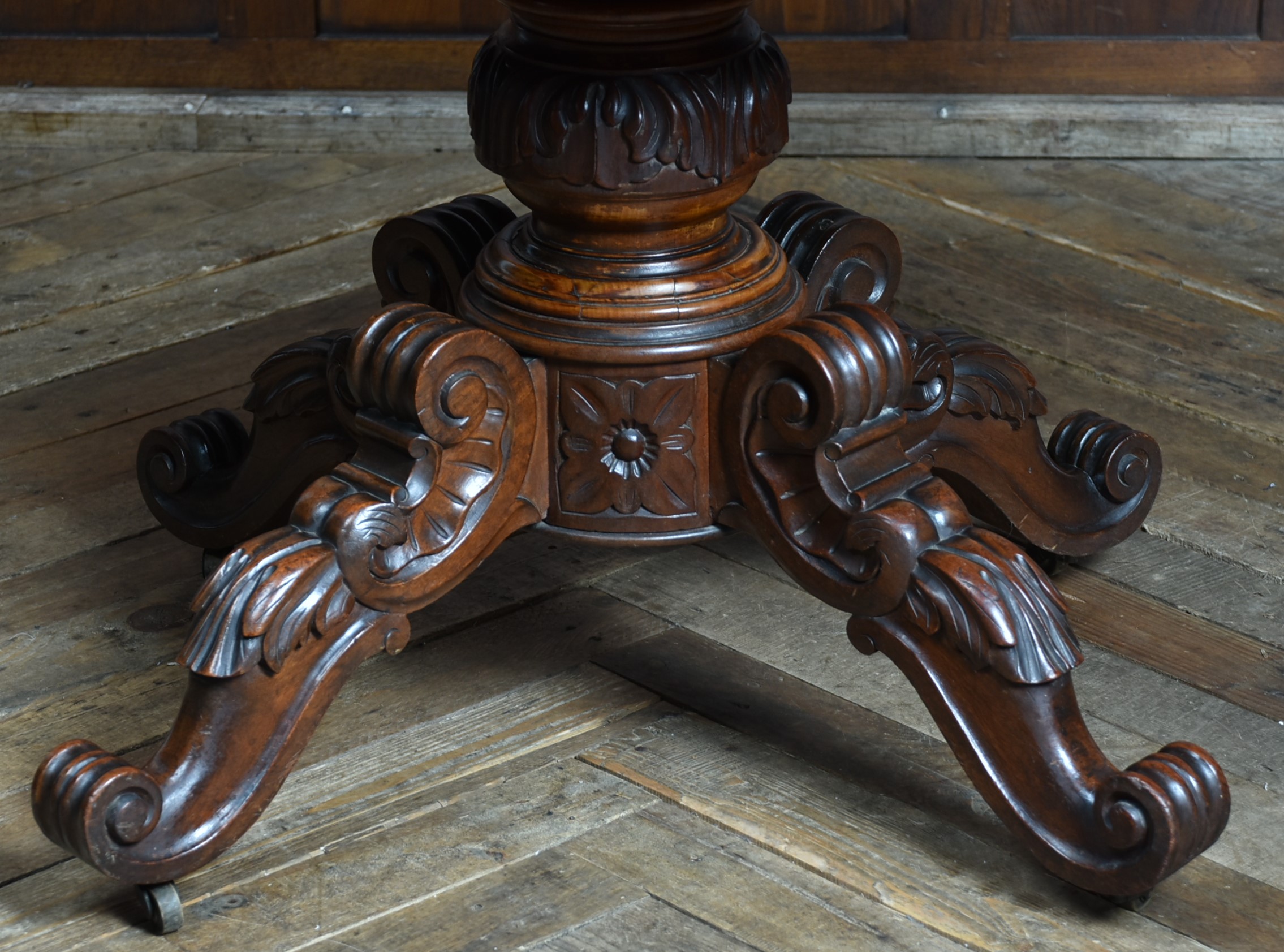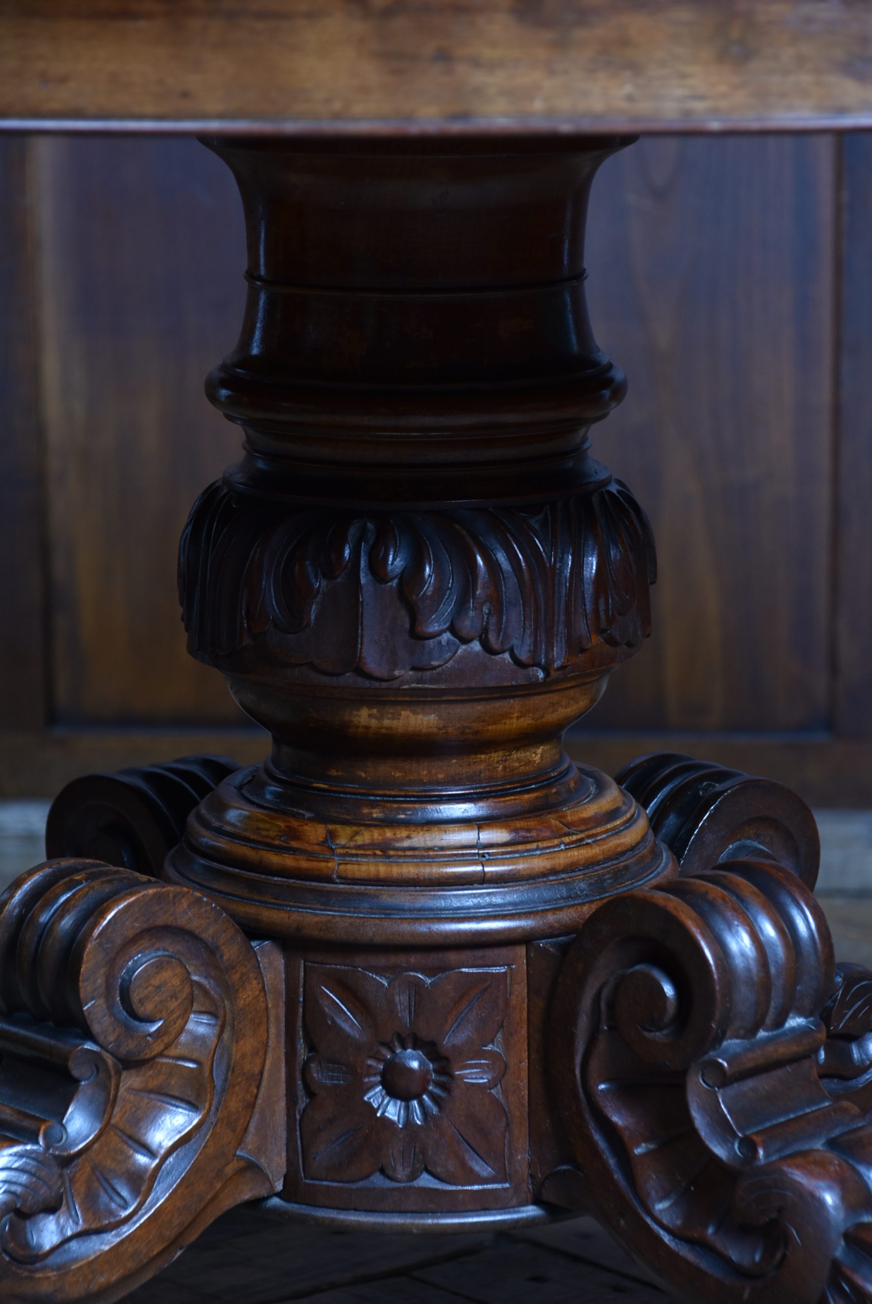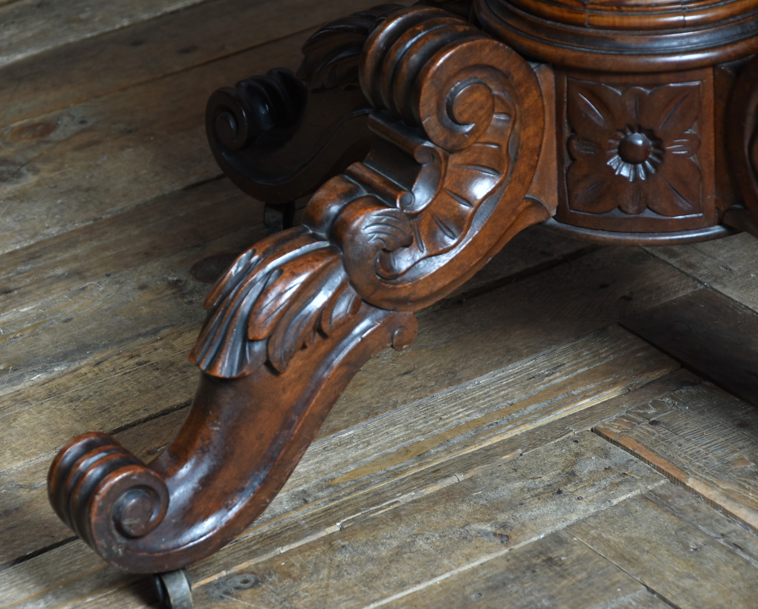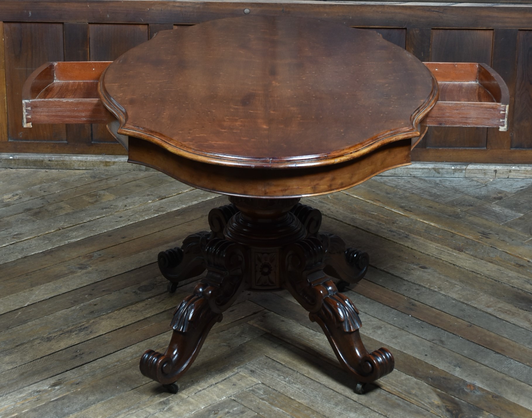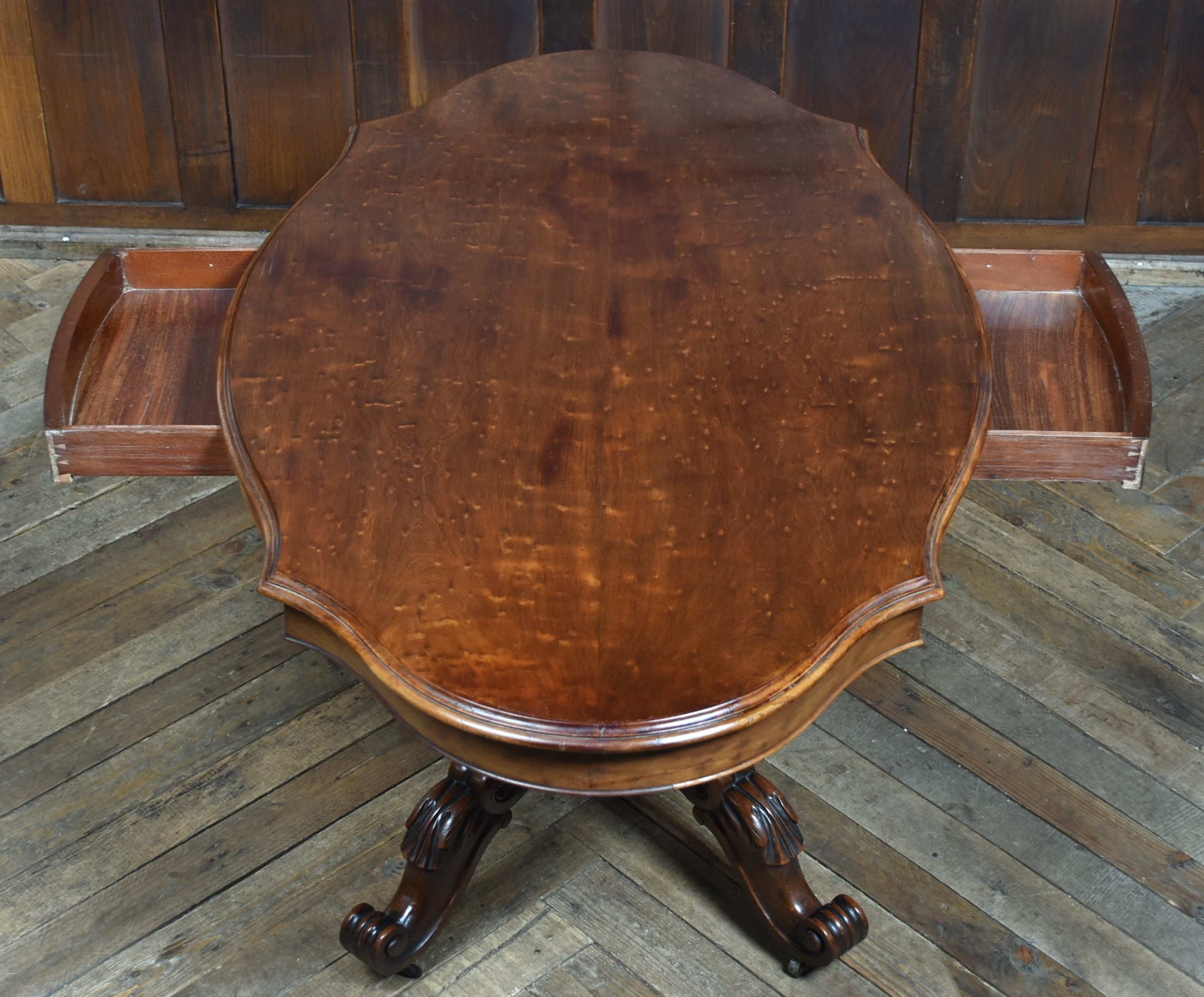 A superb Victorian mahogany centre table, displaying exceptional craftsmanship and elegance. The plum‑pudding mahogany top is finished with thumb‑moulded edging and a deep frieze, incorporating concealed drawers to both the front and back, each constructed with fine dovetail joints. The table stands on a robust, beautifully carved column which flows into four gracefully swept legs, embellished with C‑scroll motifs and delicate floral carving, all resting on their original casters for ease of movement and added authenticity. As with all genuine antiques, it shows minor age‑related imperfections, yet it remains a solid, beautifully preserved piece with a particularly rich colour and patina.