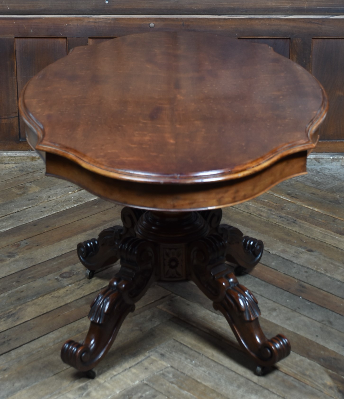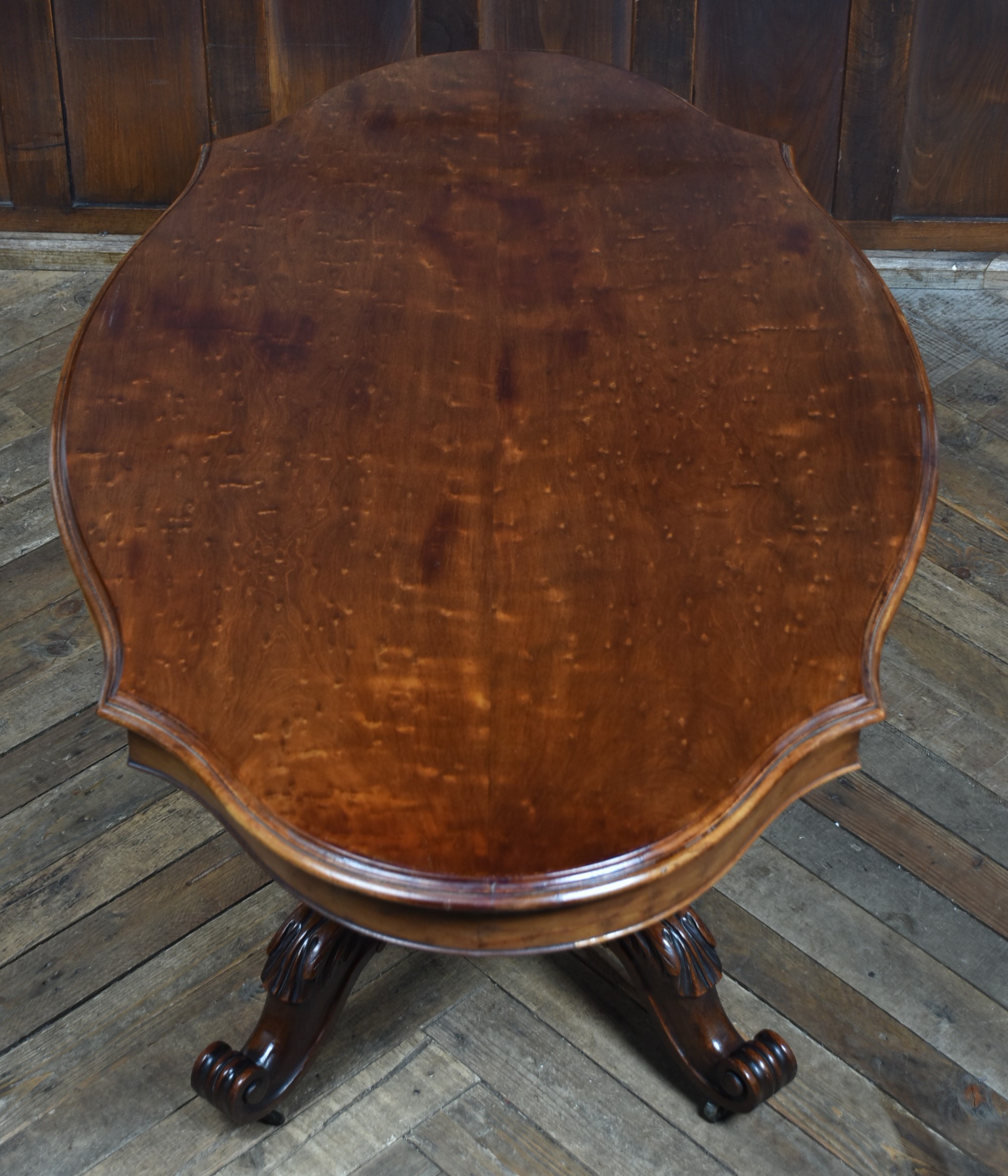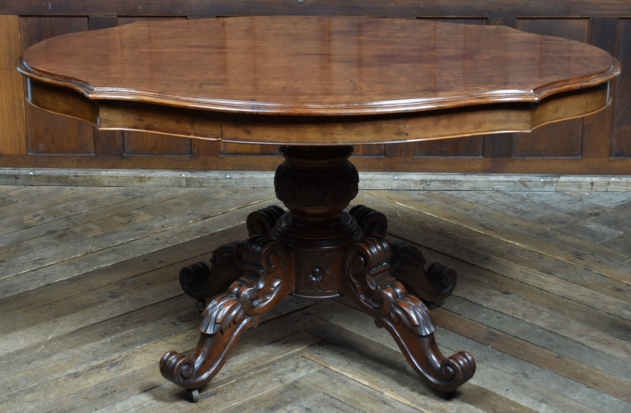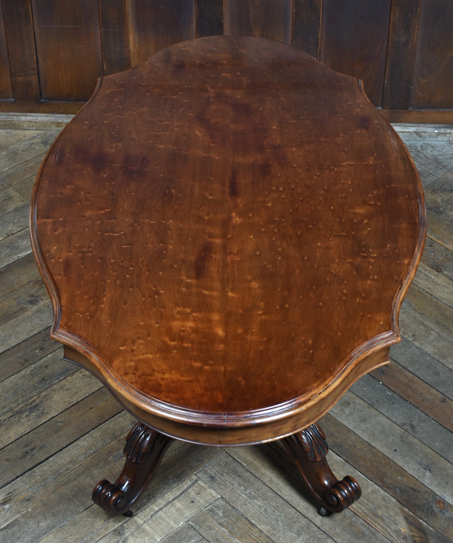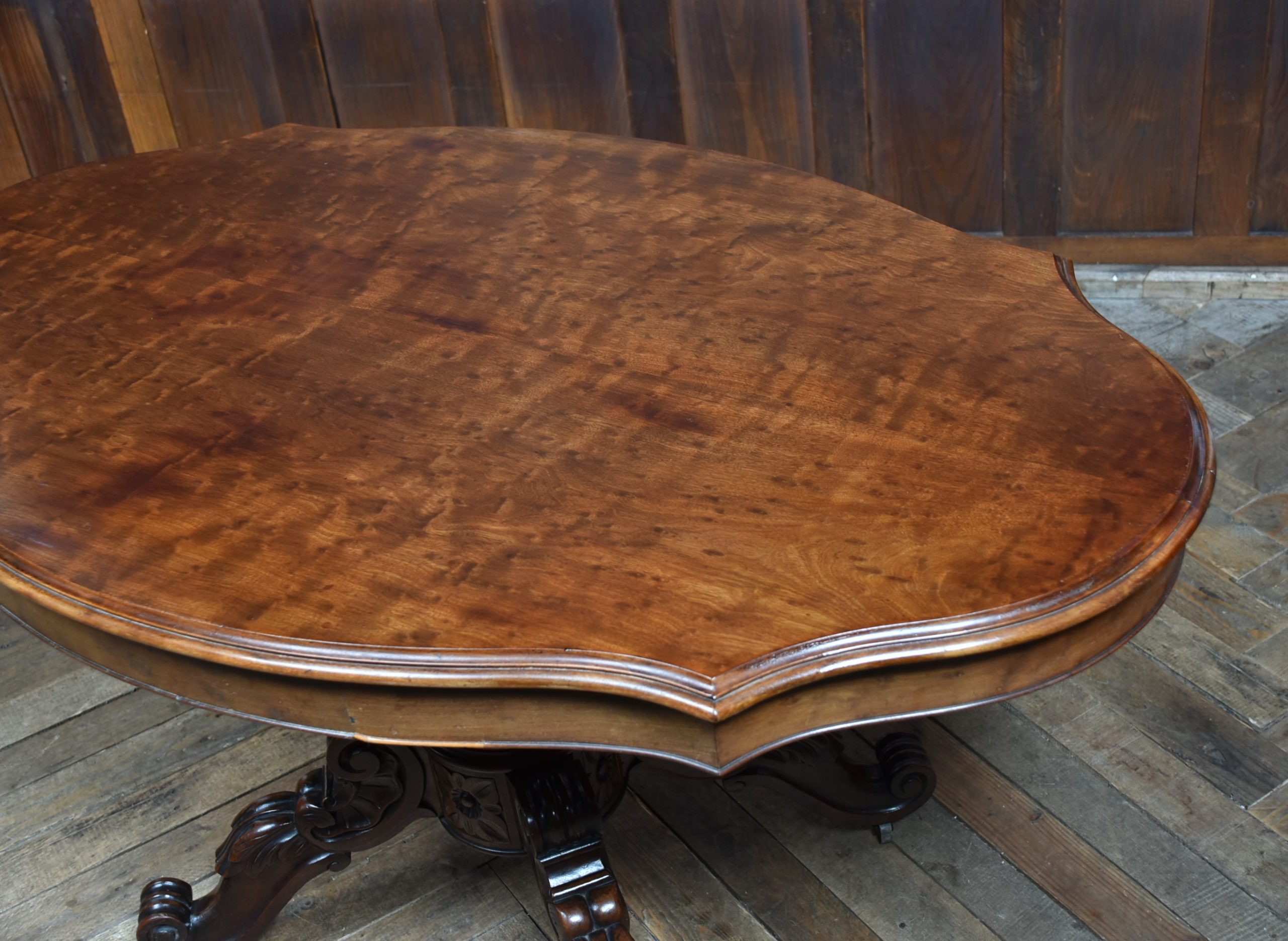 A superb Victorian mahogany centre table, displaying exceptional craftsmanship and elegance. The plum‑pudding mahogany top is finished with thumb‑moulded edging and a deep frieze, incorporating concealed drawers to both the front and back, each constructed with fine dovetail joints. The table stands on a robust, beautifully carved column which flows into four gracefully swept legs, embellished with C‑scroll motifs and delicate floral carving, all resting on their original casters for ease of movement and added authenticity. As with all genuine antiques, it shows minor age‑related imperfections, yet it remains a solid, beautifully preserved piece with a particularly rich colour and patina.