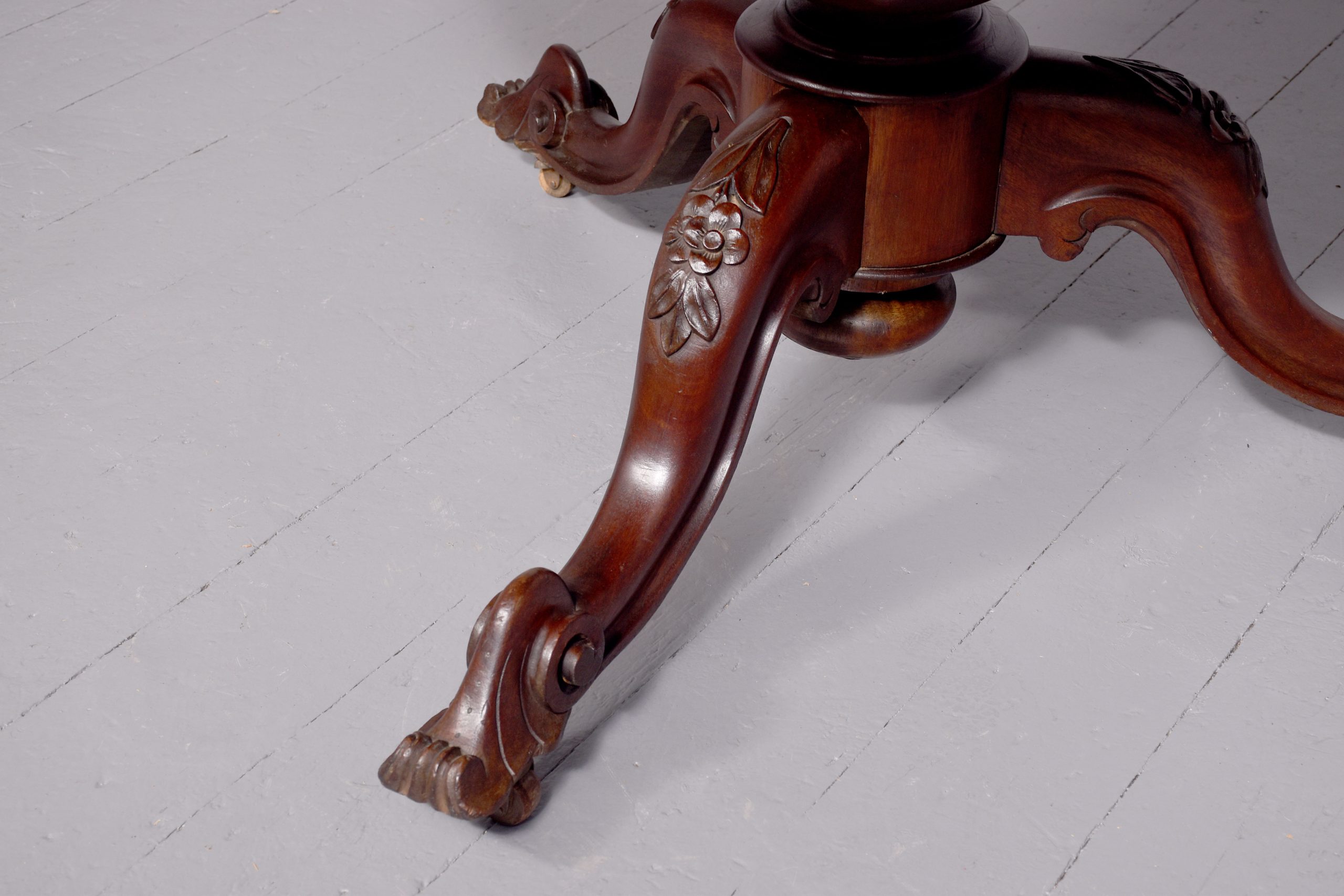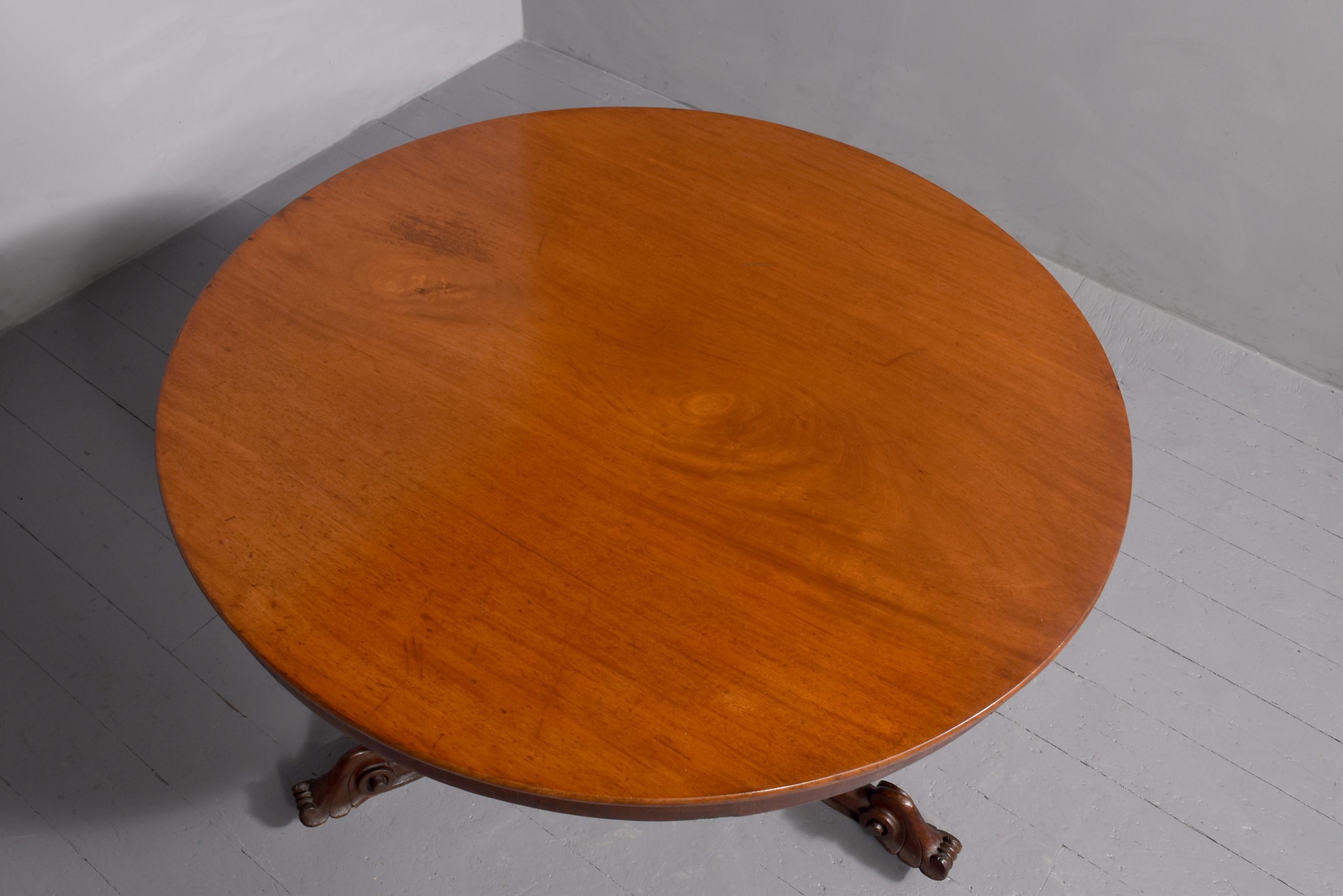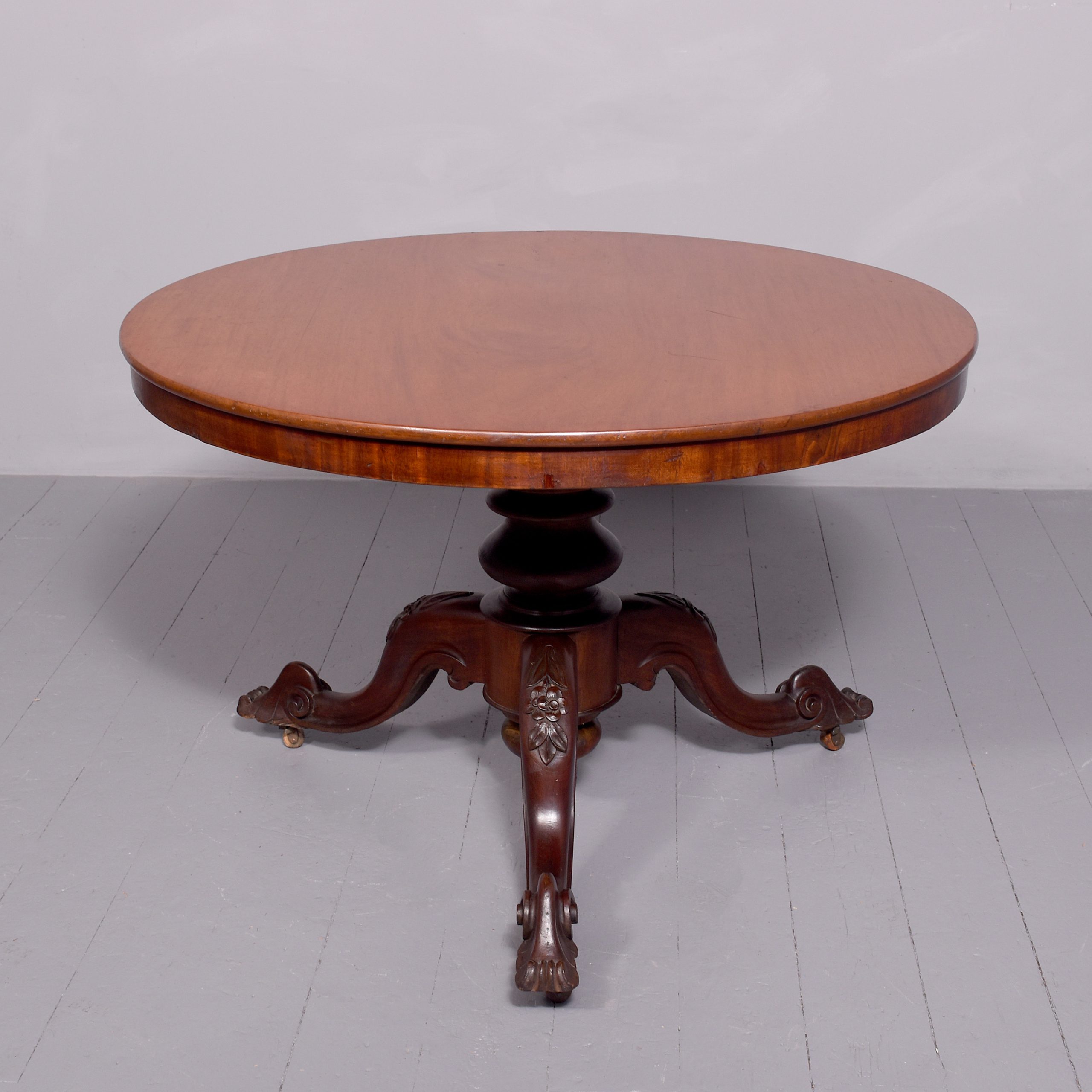 Circa 1870. A Mid-Victorian circular mahogany breakfast table, the top in fine figured mahogany with a simple fore-edge and frieze, the table rests on a sturdy block, supported on a turned stem, issuing three cabriole legs with foliate carving on the knees, a downward facing finial in the center and finishing on a well carved foliate carved feet, with the original castors beneath, the top is held in place by four pins.