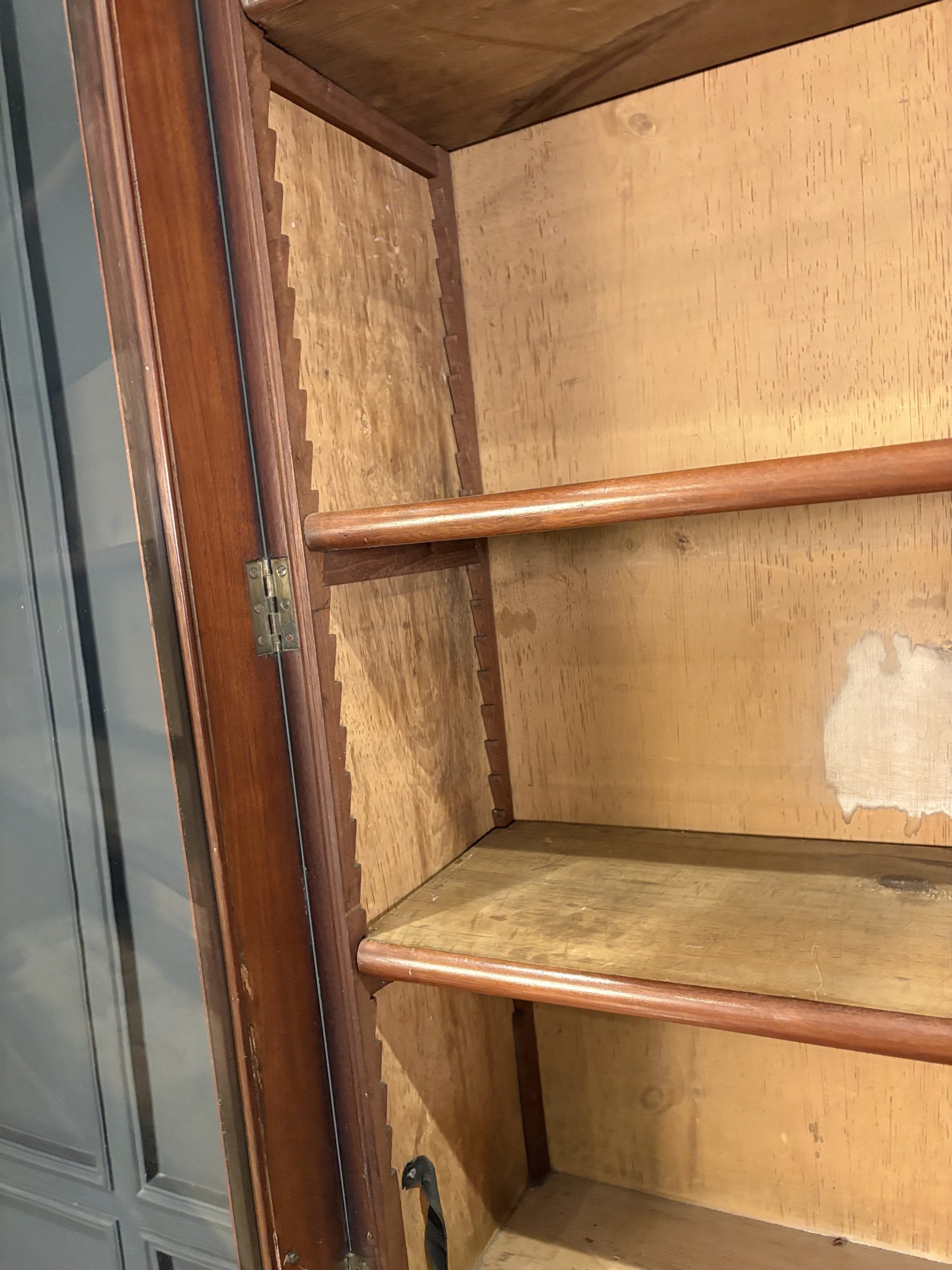 The upper section features a pair of glazed doors with working key, opening to reveal three height-adjustable shelves, ideal for displaying books or decorative pieces.