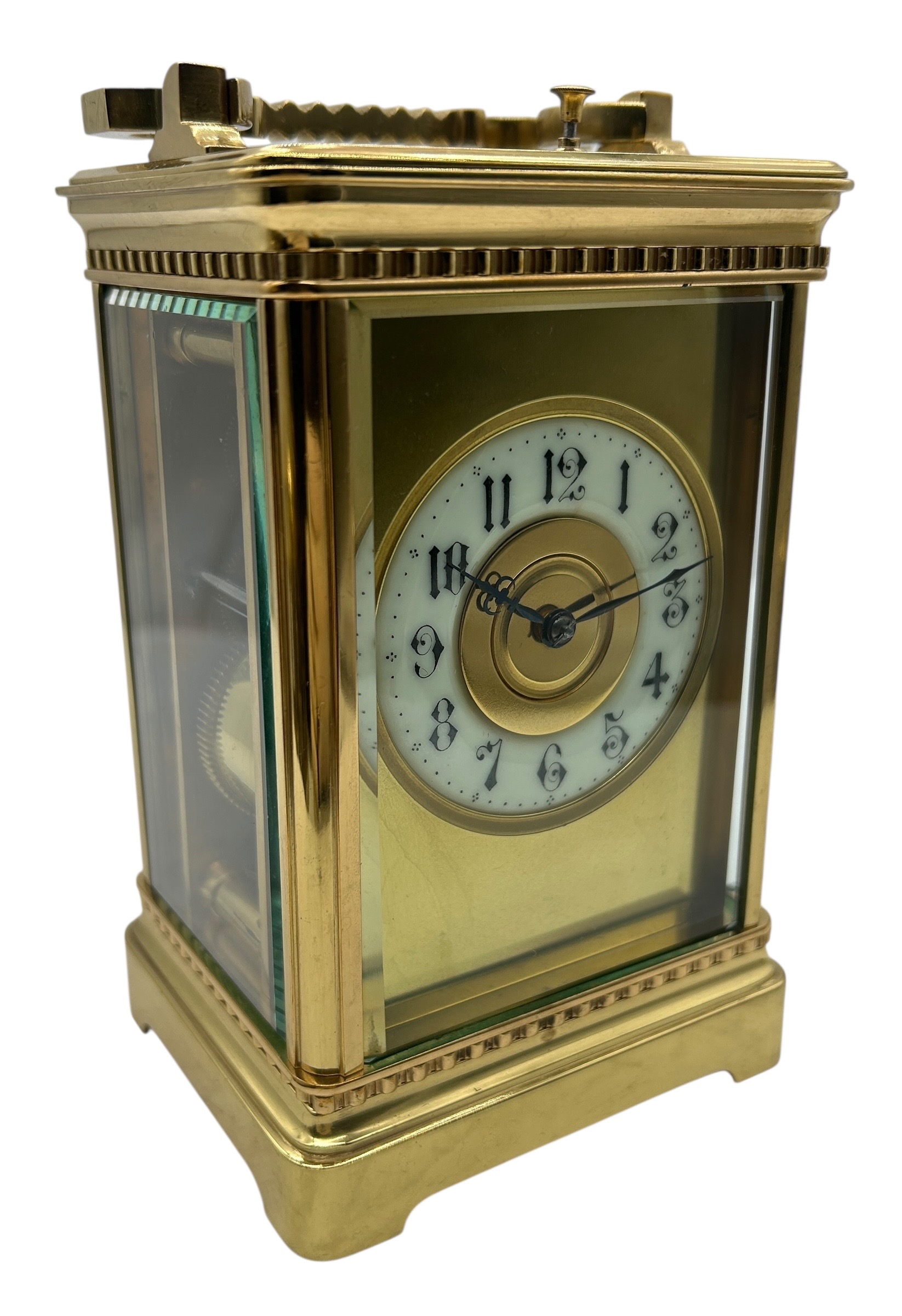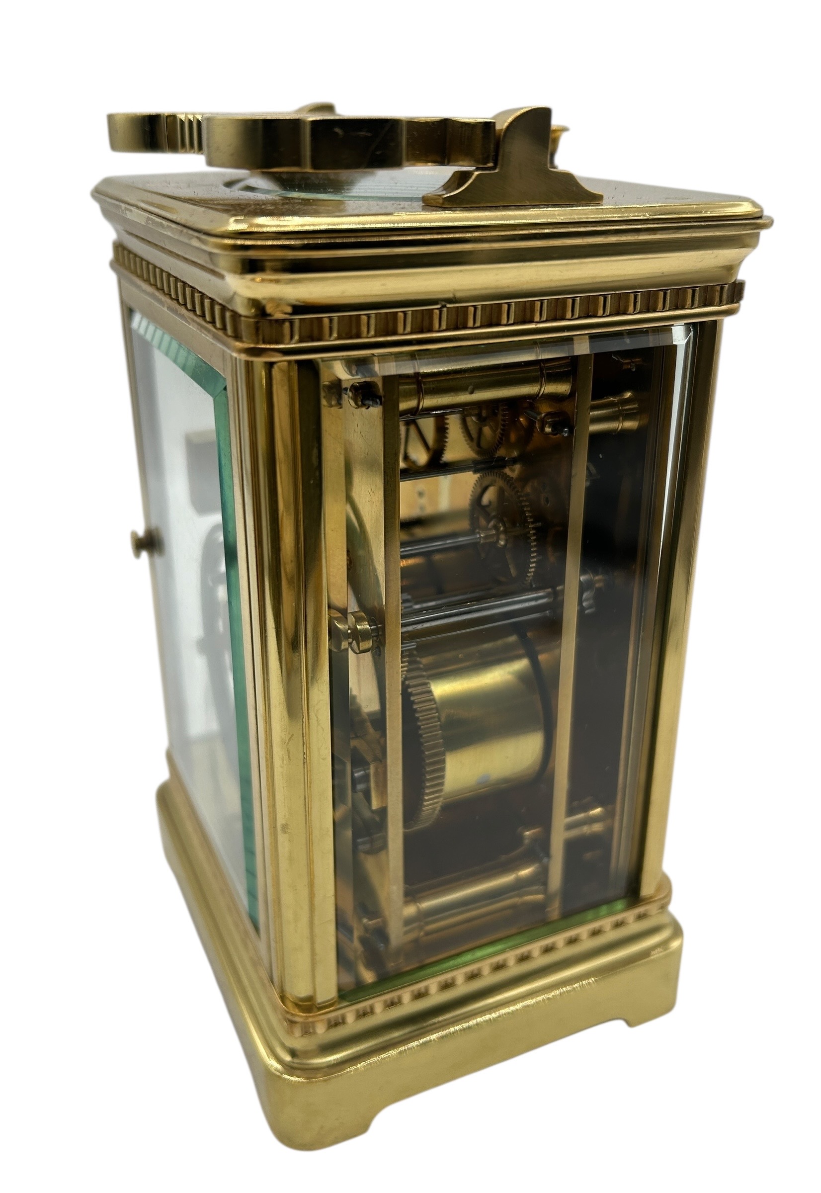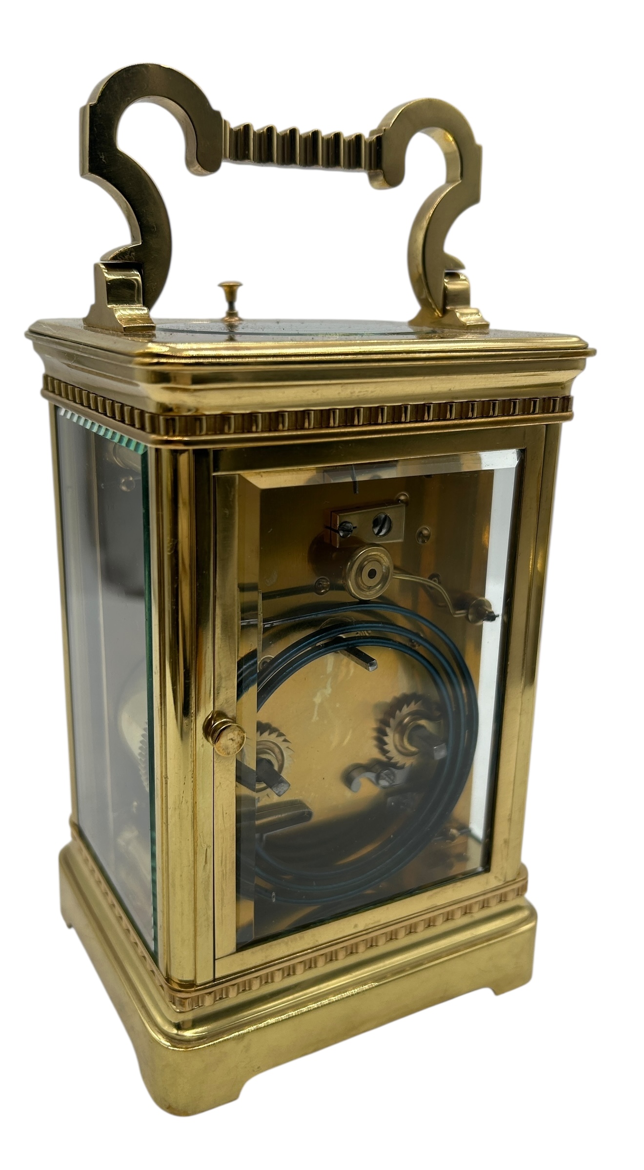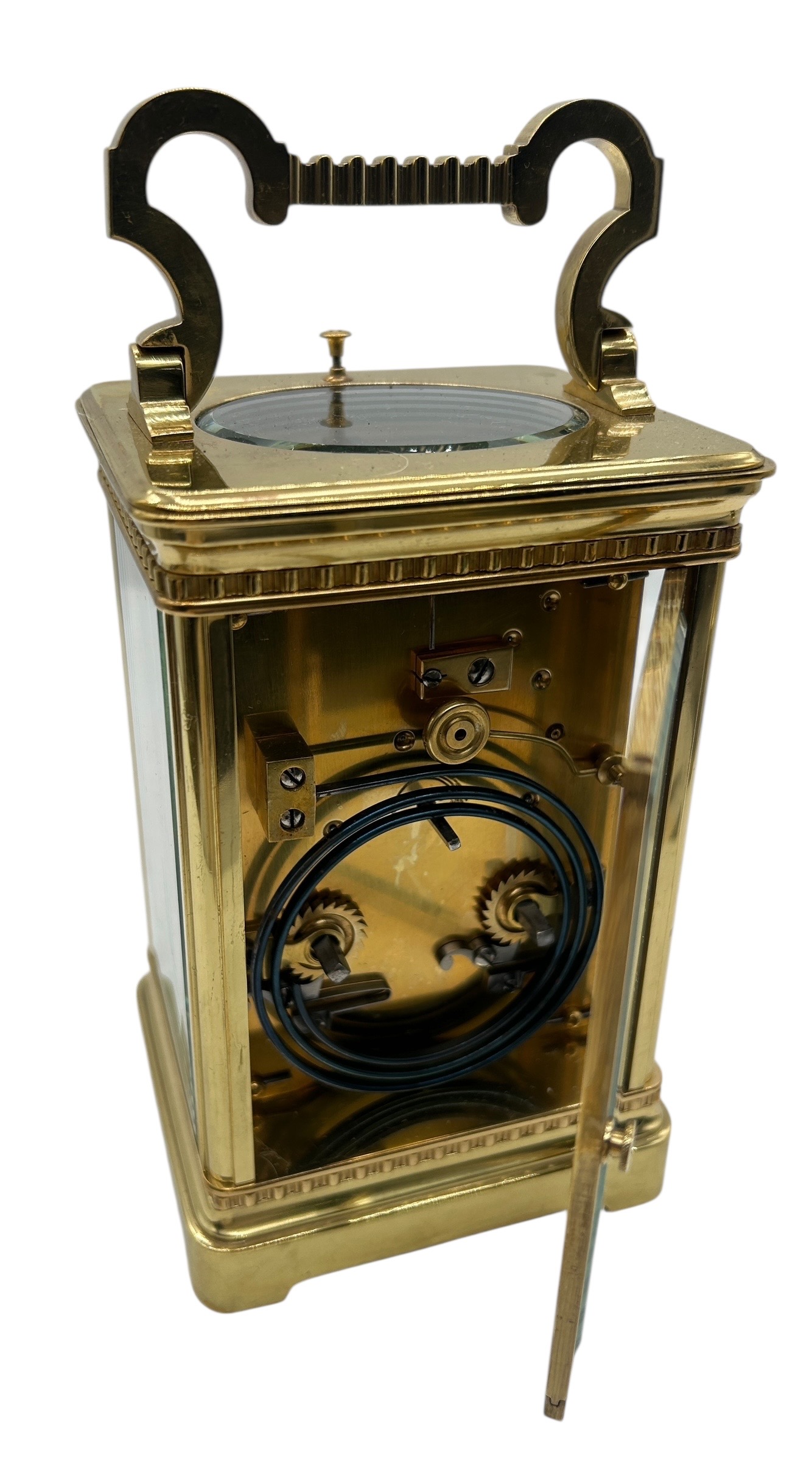 This is an incredible French carriage clock; I have never seen this large model before. This clock has many excellent features, but the case is what sells it a truly magnificent looking clock. I have fully serviced this clock; it is in terrific condition and full working order. Please view the many photos make sure you are happy with the condition of this clock you can also see a video on my YouTube channel.