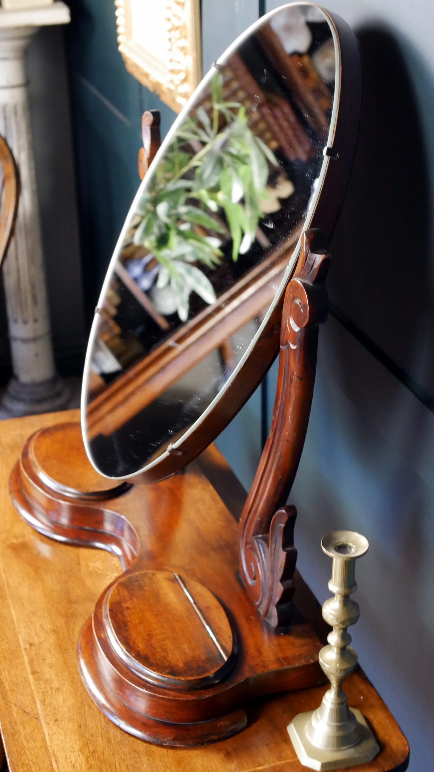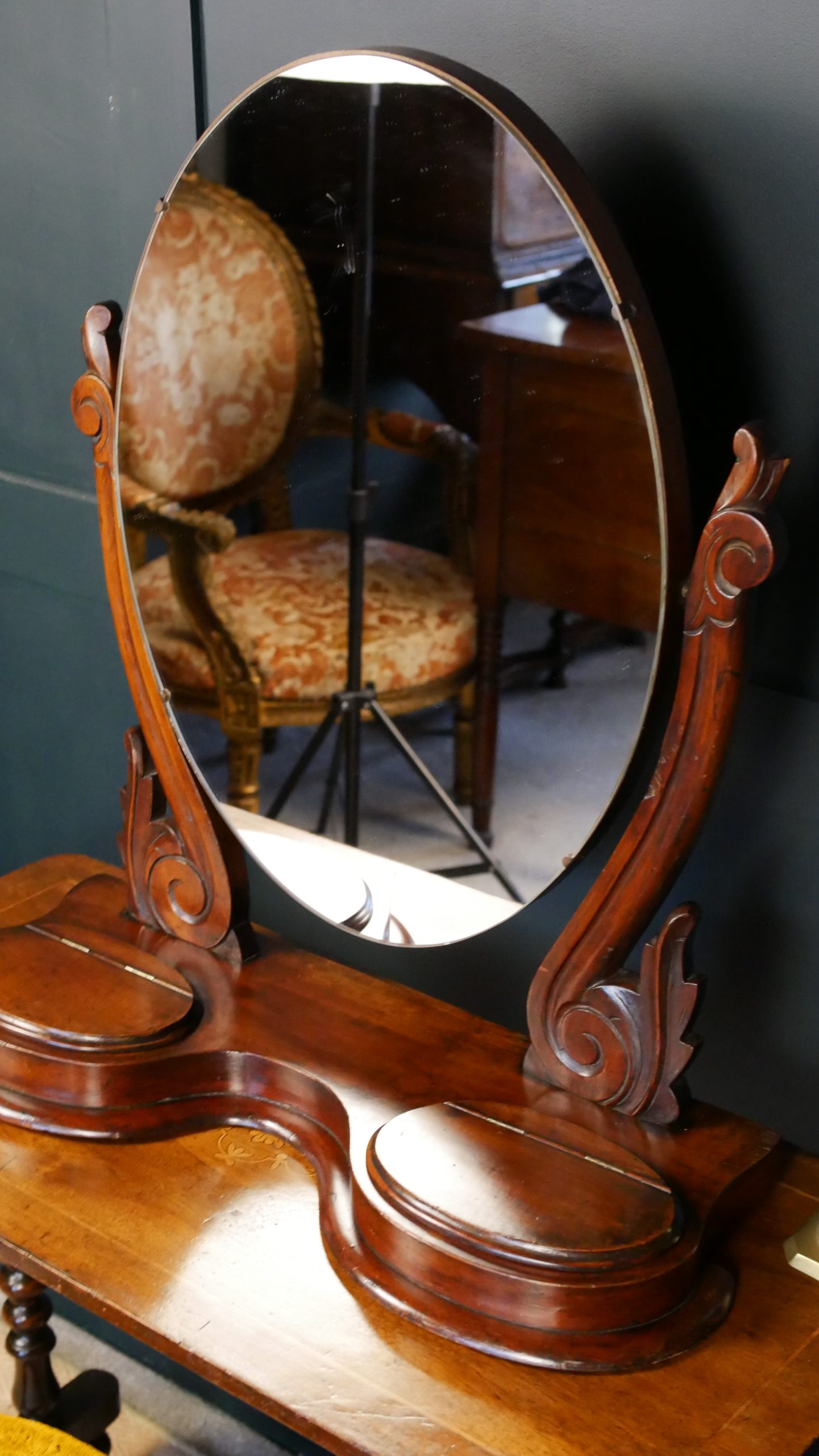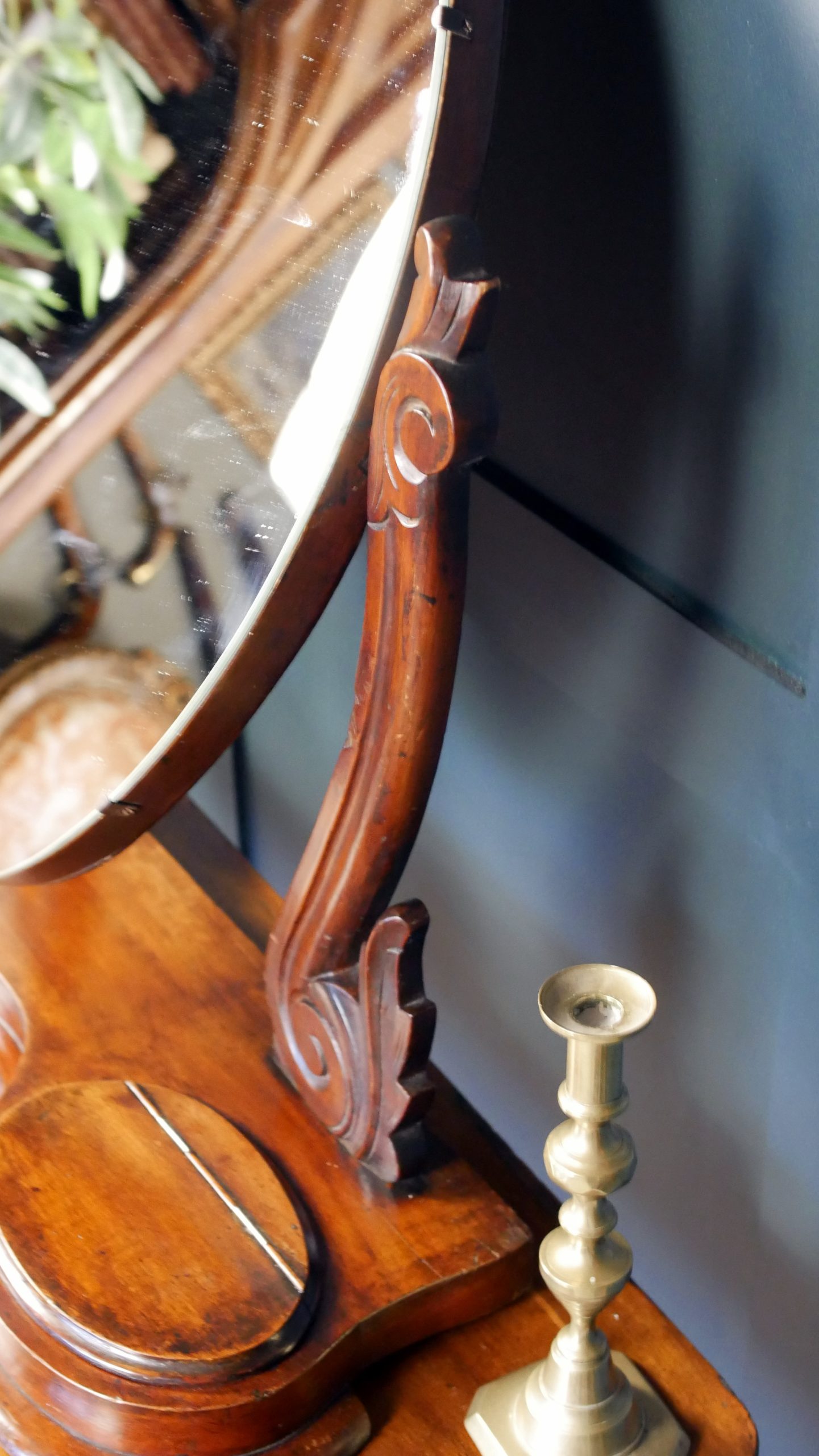 A stunning example of 19th-century craftsmanship, this Victorian oval dressing mirror features a beautifully grained mahogany frame with elegant scroll supports and a gracefully curved base. The mirror pivots smoothly within its frame, allowing for adjustable angles, and reflects the warm, rich tones characteristic of fine period furniture.