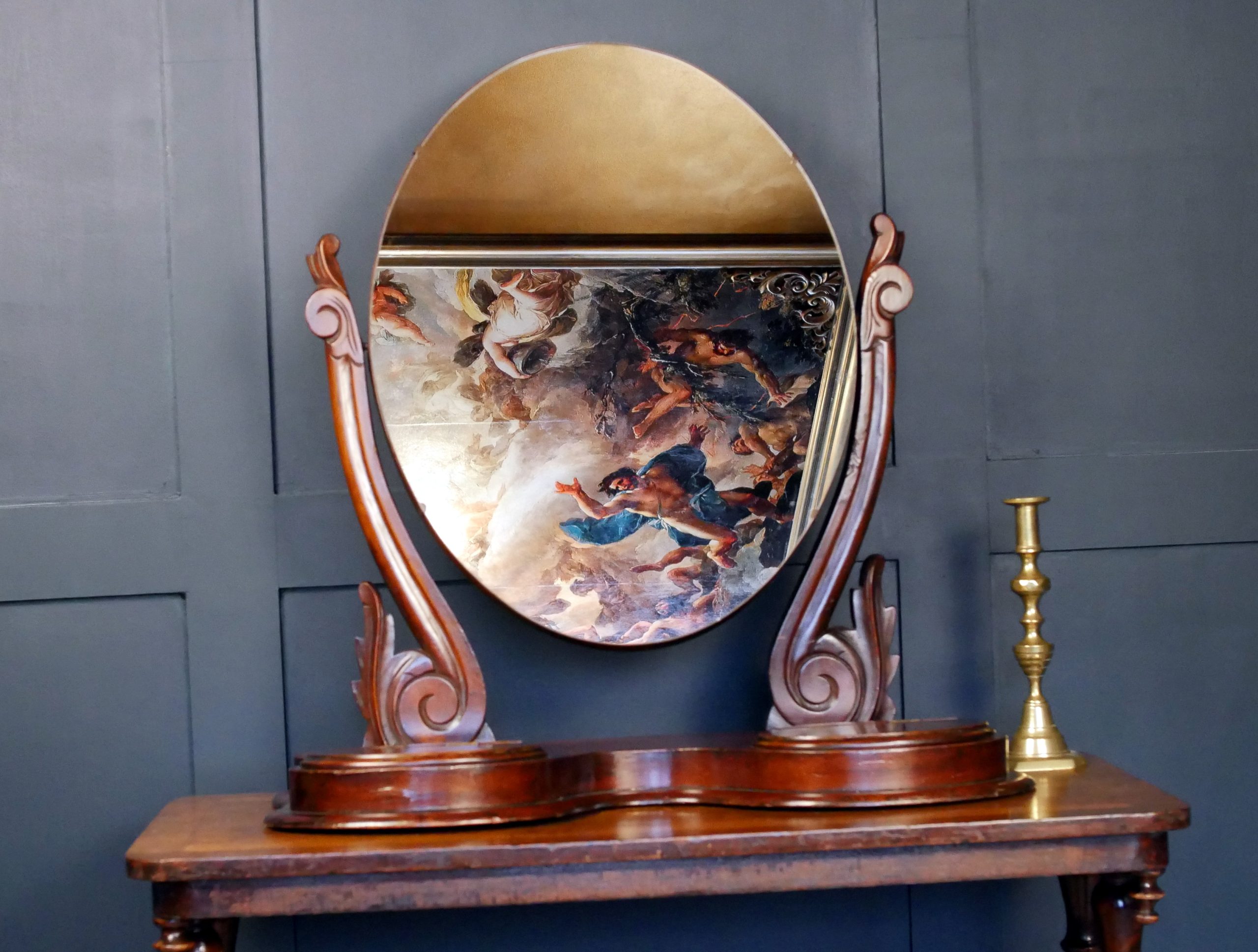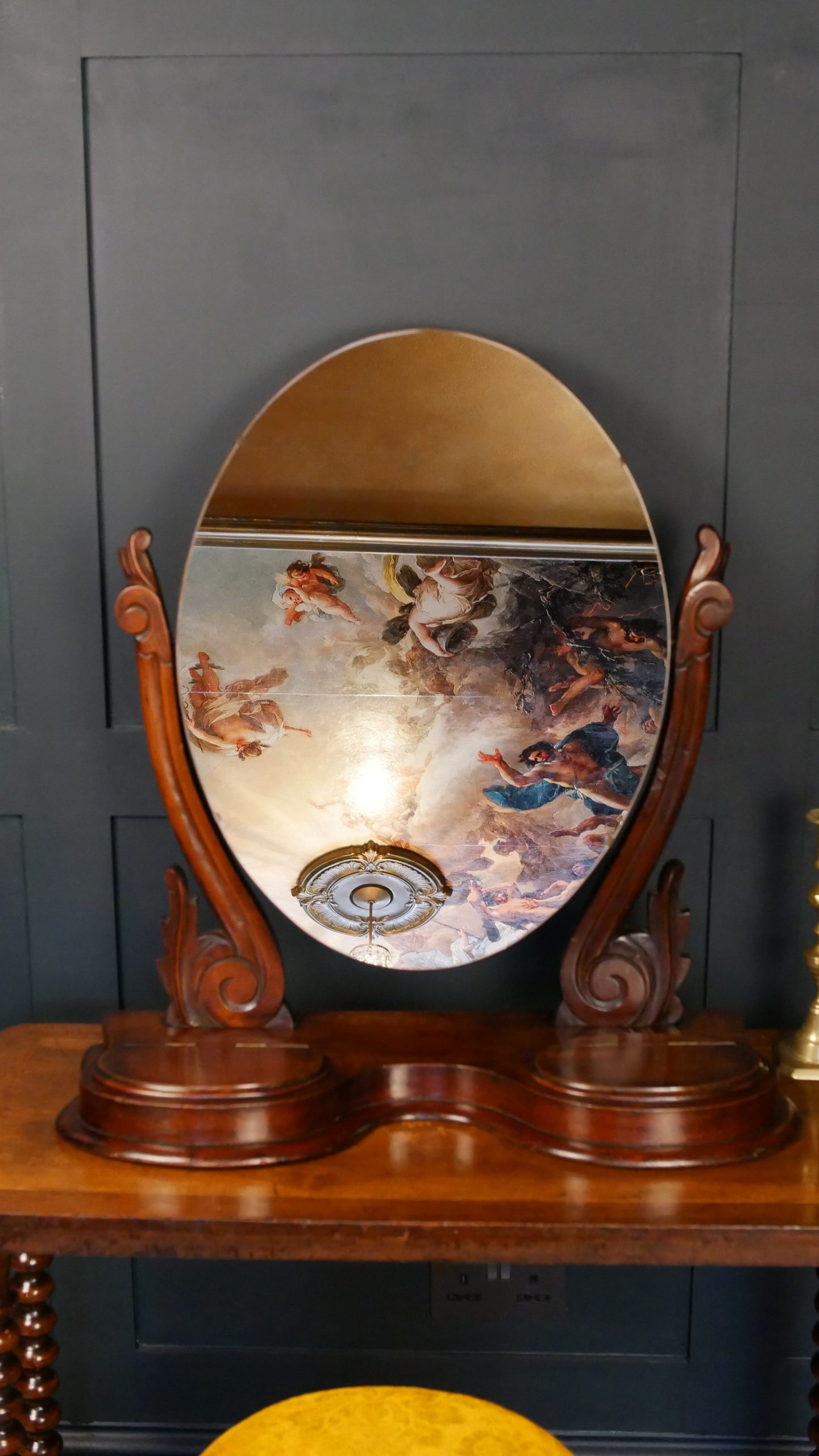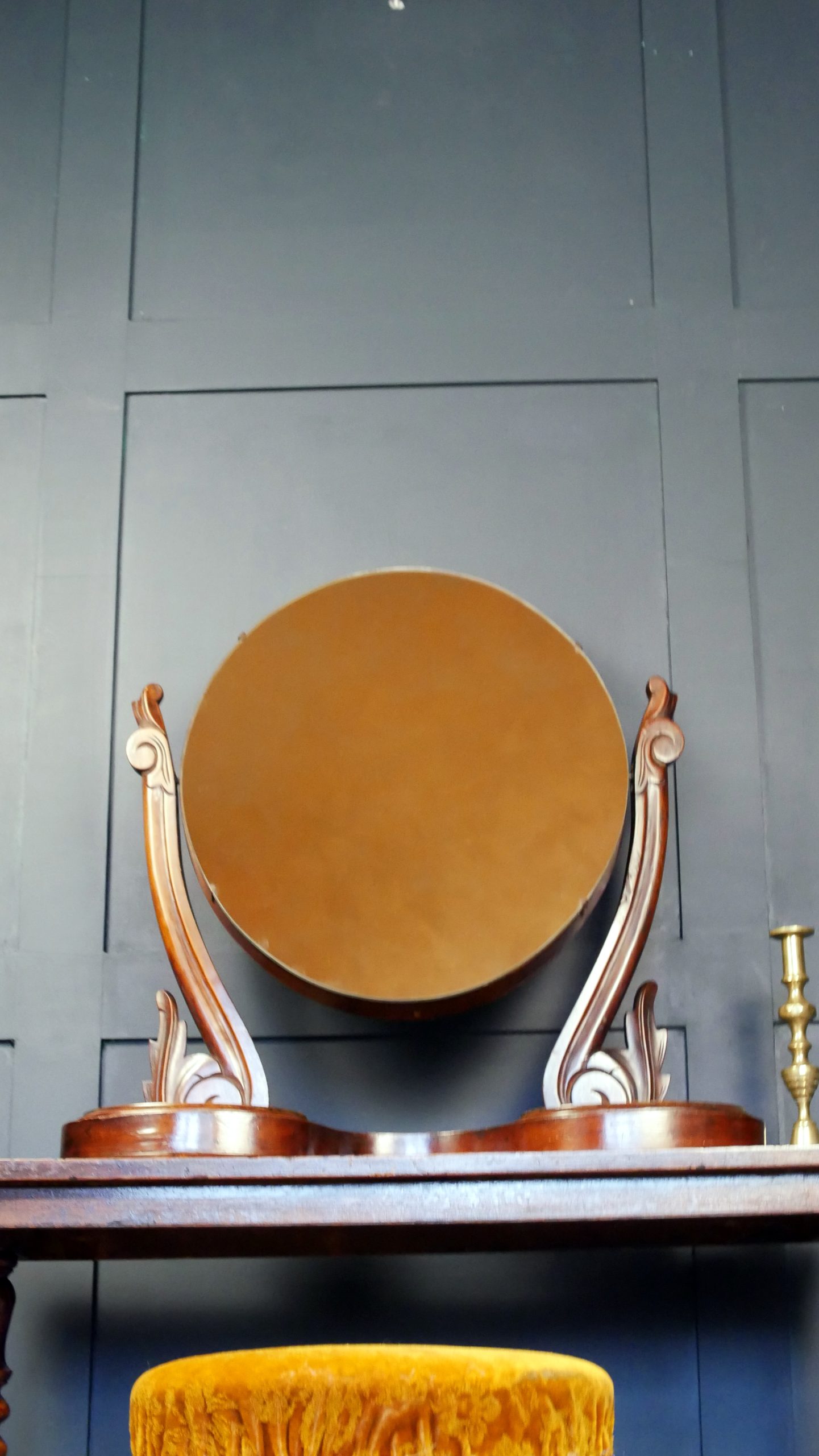 A stunning example of 19th-century craftsmanship, this Victorian oval dressing mirror features a beautifully grained mahogany frame with elegant scroll supports and a gracefully curved base. The mirror pivots smoothly within its frame, allowing for adjustable angles, and reflects the warm, rich tones characteristic of fine period furniture.