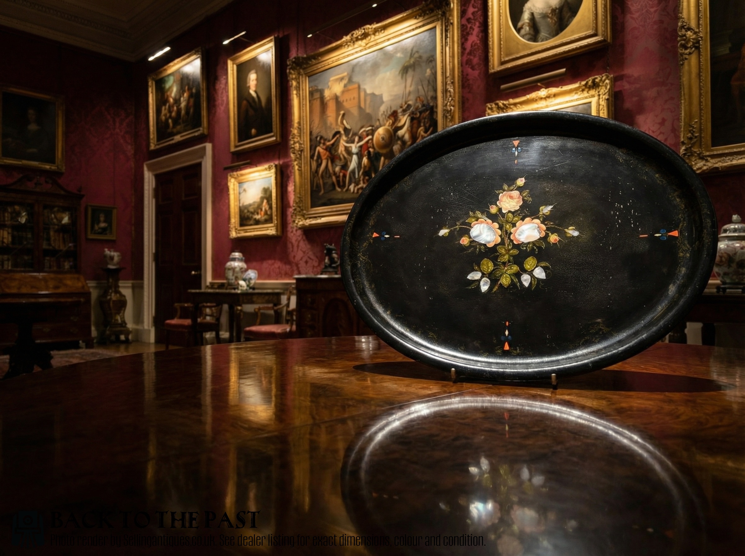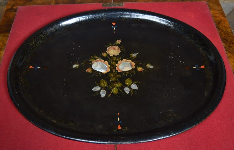Beautiful Victorian paper-mache lacquered tray with hand painted floral design with mother of pearl inlay. Like all antiques there are some imperfections (shown in pictures) however these are mostly to the back so unseen. It has a very simple design however still a very decorative item.