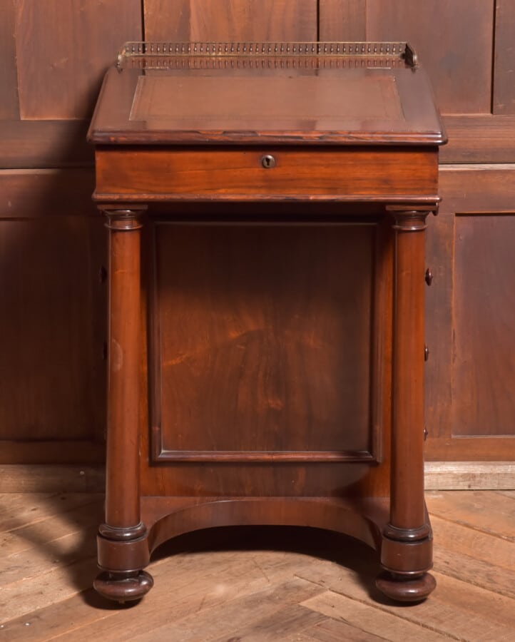 Victorian rose wood davenport with brass gallery top. The sloping writing surface has it’s original leather insert which adds to the character and charm of this handsome piece of furniture. The writing surface hinges open and has a storage area with two working and two dummy drawers. To the right hand side of the slope is an inkwell drawer which pulls out and hinges back to present the inkwells beside your right hand. The usual four graduated drawer to the right and dummy drawers on the left all with original turned handles. The davenport is finished all around so it can free stand and is raised on bun feet with casters underneath. A perfect addition to any home or office.