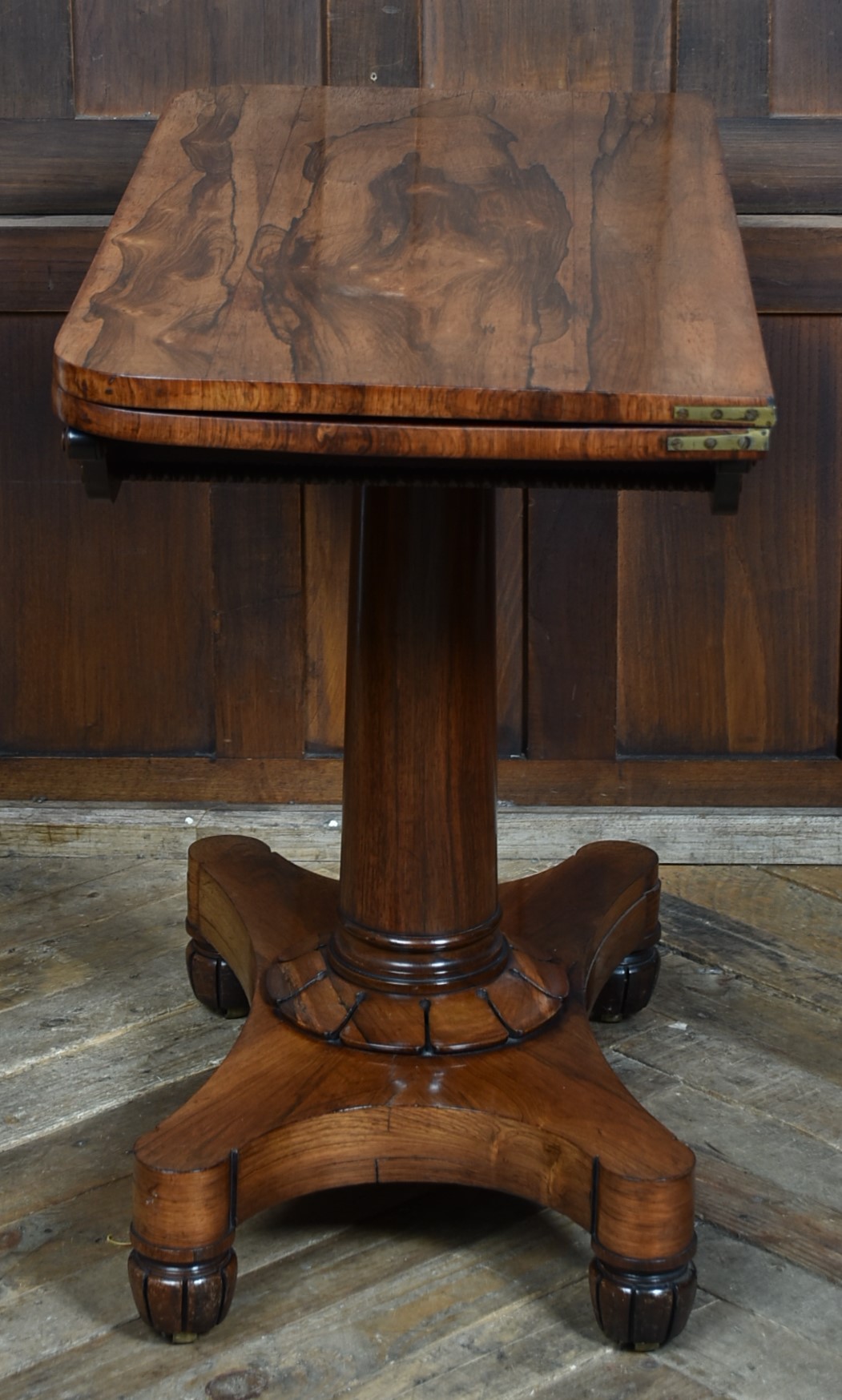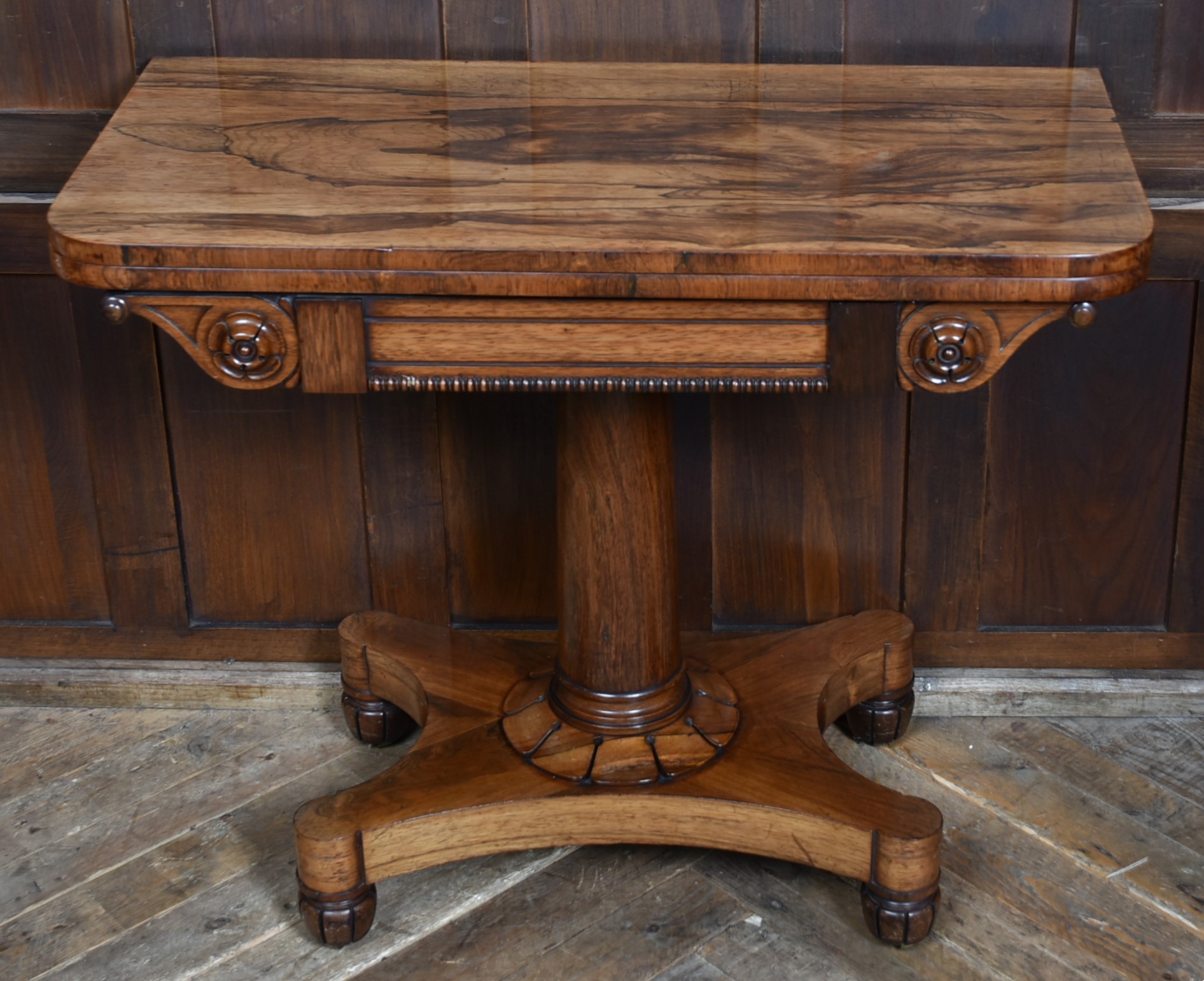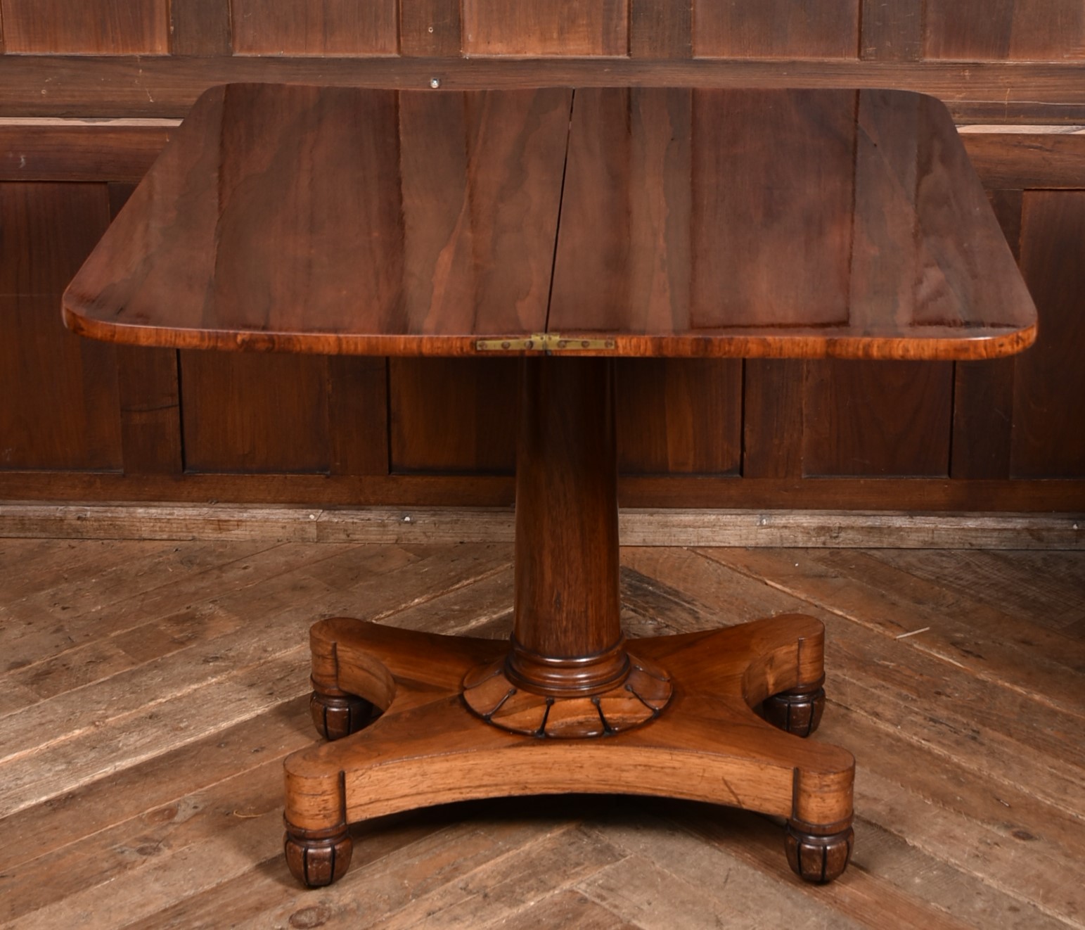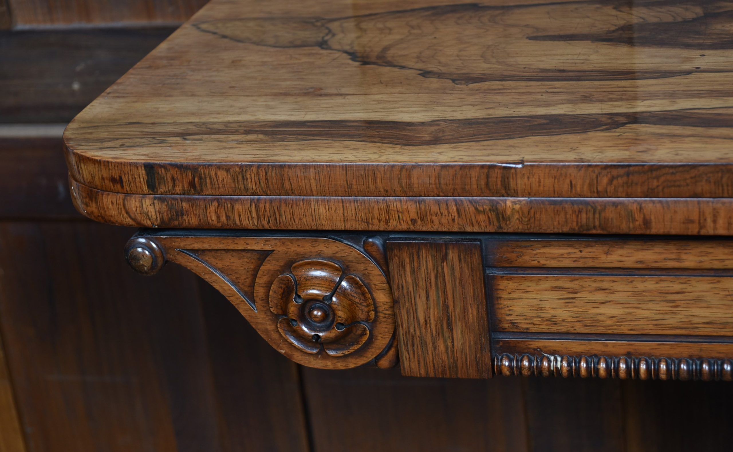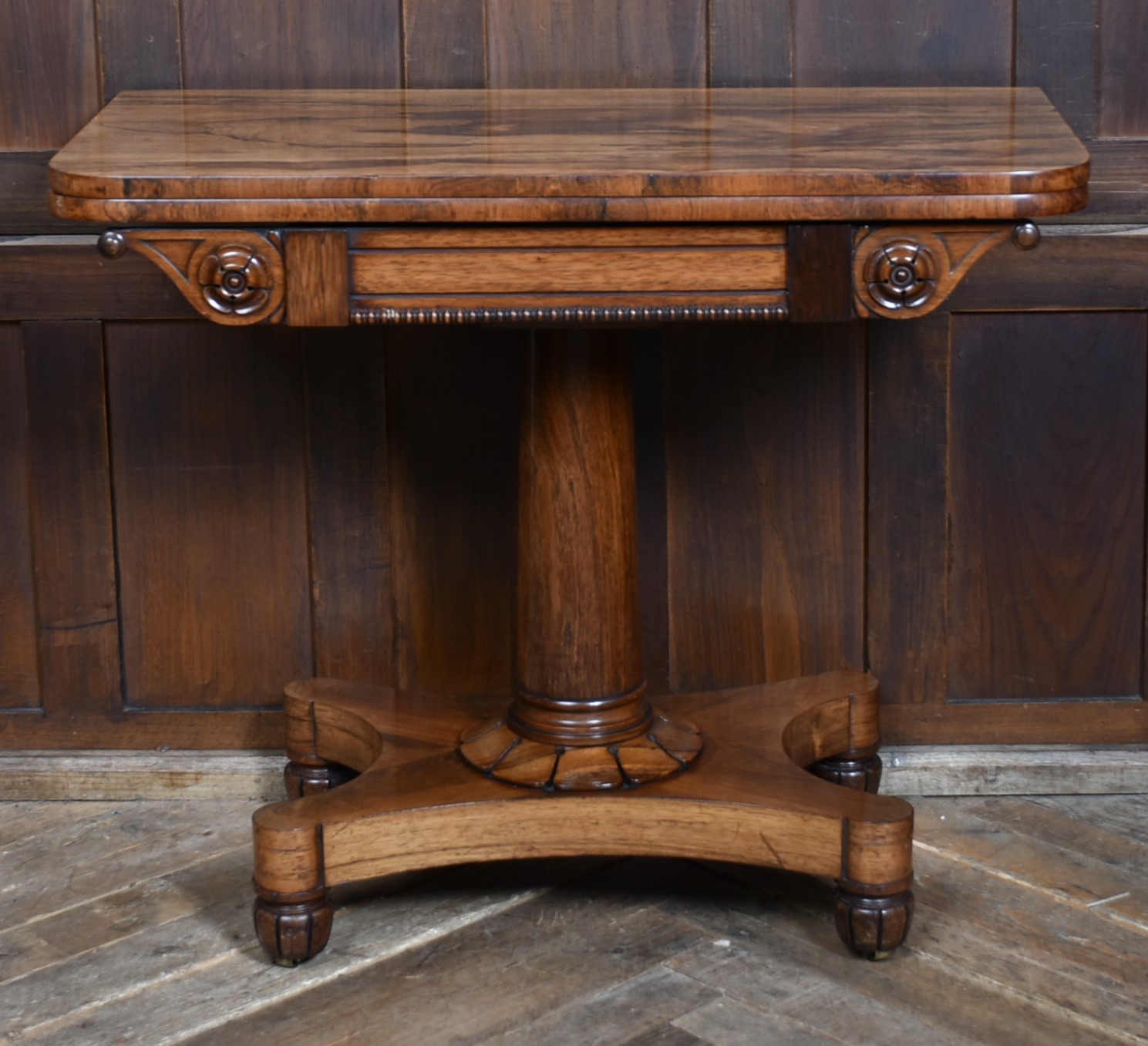 Fabulous quality Victorian fold over tea table crafted in stunning rosewood. The beautifully grained top rotates to reveal a discreet storage compartment, ideal for table linens, mats, or games. The hinged top opens to reveal a generous playing or serving surface, supported by a smooth swivel action. Beneath, a shaped frieze with decorative carved detail supported on a beautifully turned column with carved collar sitting on a concave quadruple platform base with carved bun feet. The superb craftsmanship and excellent condition speak to the quality of the piece. The superb quality and condition shows high craftsmanship and would look stunning in any home. This is a very versatile table that can be used as a console or side table and when opened it is an ideal size (H=73.5cm x W=92cm x D=90cm) for an intimate supper. This charming little table with its gorgeous rich colouring and amazing graining will look stunning in many places in the home.