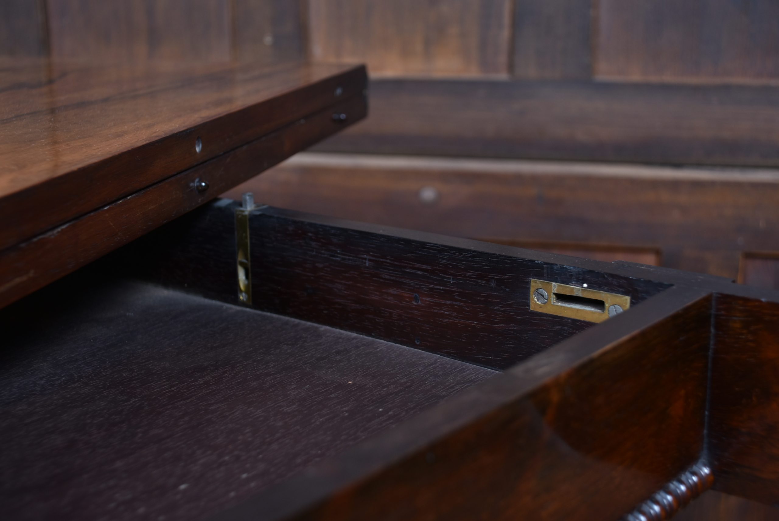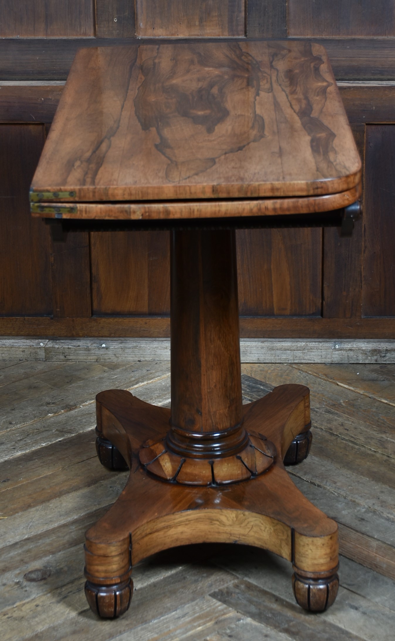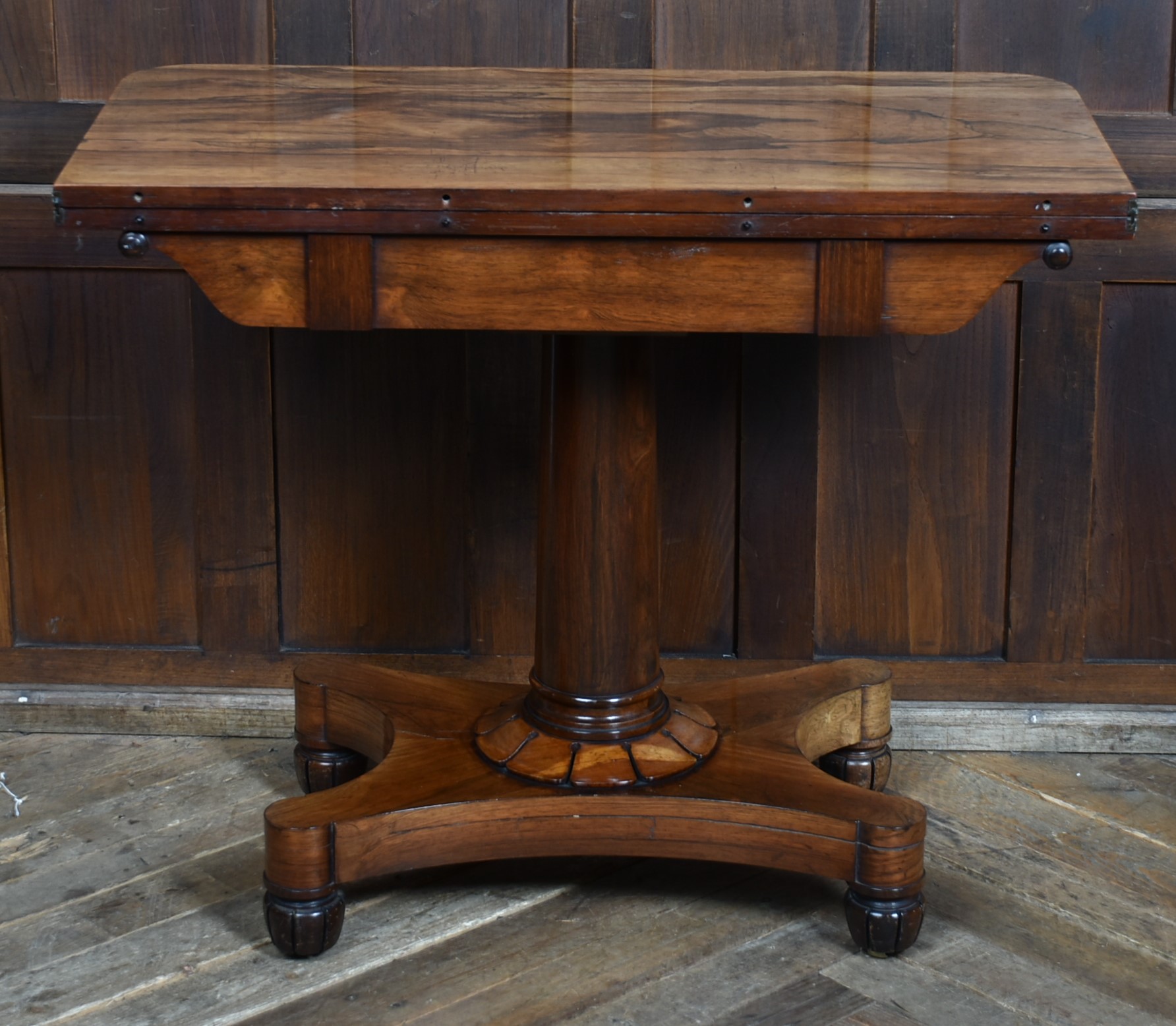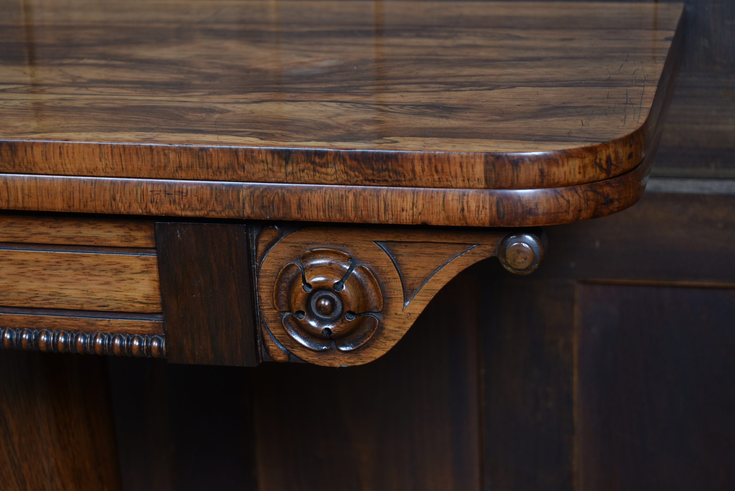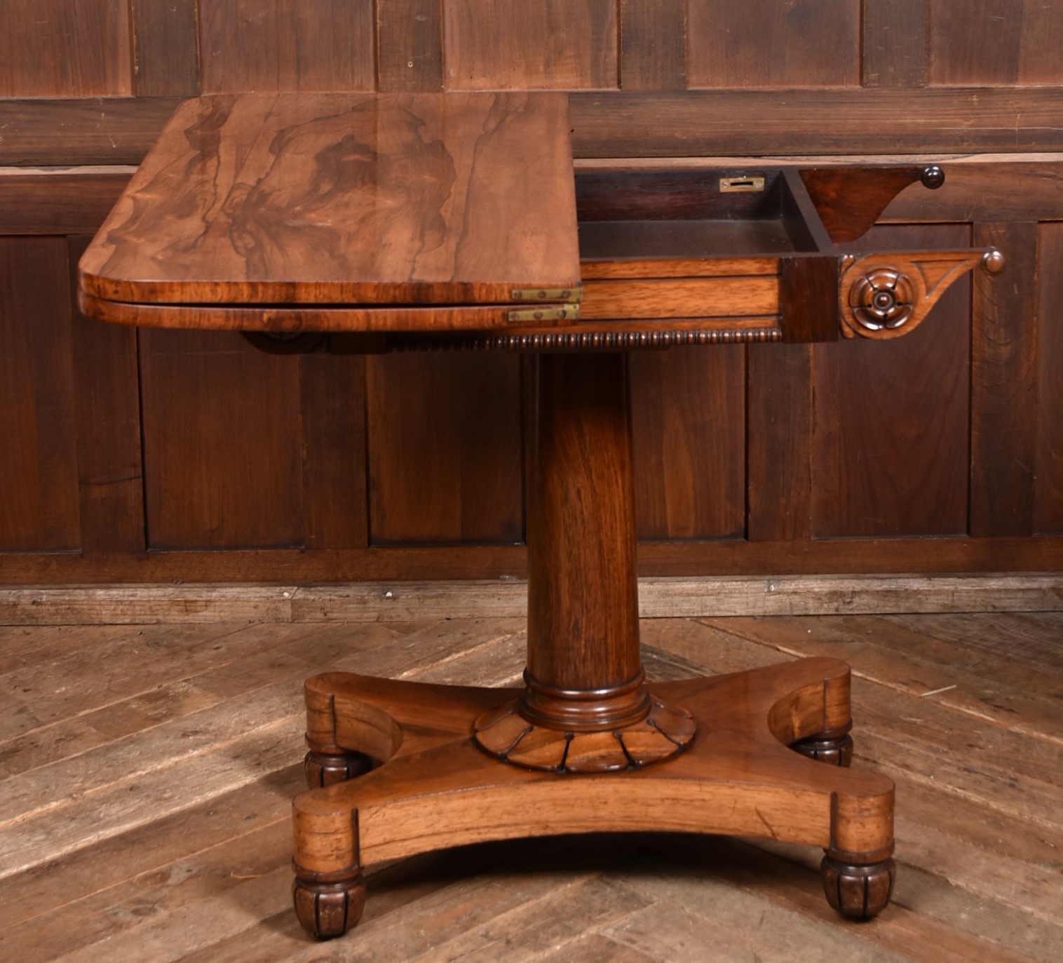 Fabulous quality Victorian fold over tea table crafted in stunning rosewood. The beautifully grained top rotates to reveal a discreet storage compartment, ideal for table linens, mats, or games. The hinged top opens to reveal a generous playing or serving surface, supported by a smooth swivel action. Beneath, a shaped frieze with decorative carved detail supported on a beautifully turned column with carved collar sitting on a concave quadruple platform base with carved bun feet. The superb craftsmanship and excellent condition speak to the quality of the piece. The superb quality and condition shows high craftsmanship and would look stunning in any home. This is a very versatile table that can be used as a console or side table and when opened it is an ideal size (H=73.5cm x W=92cm x D=90cm) for an intimate supper. This charming little table with its gorgeous rich colouring and amazing graining will look stunning in many places in the home.