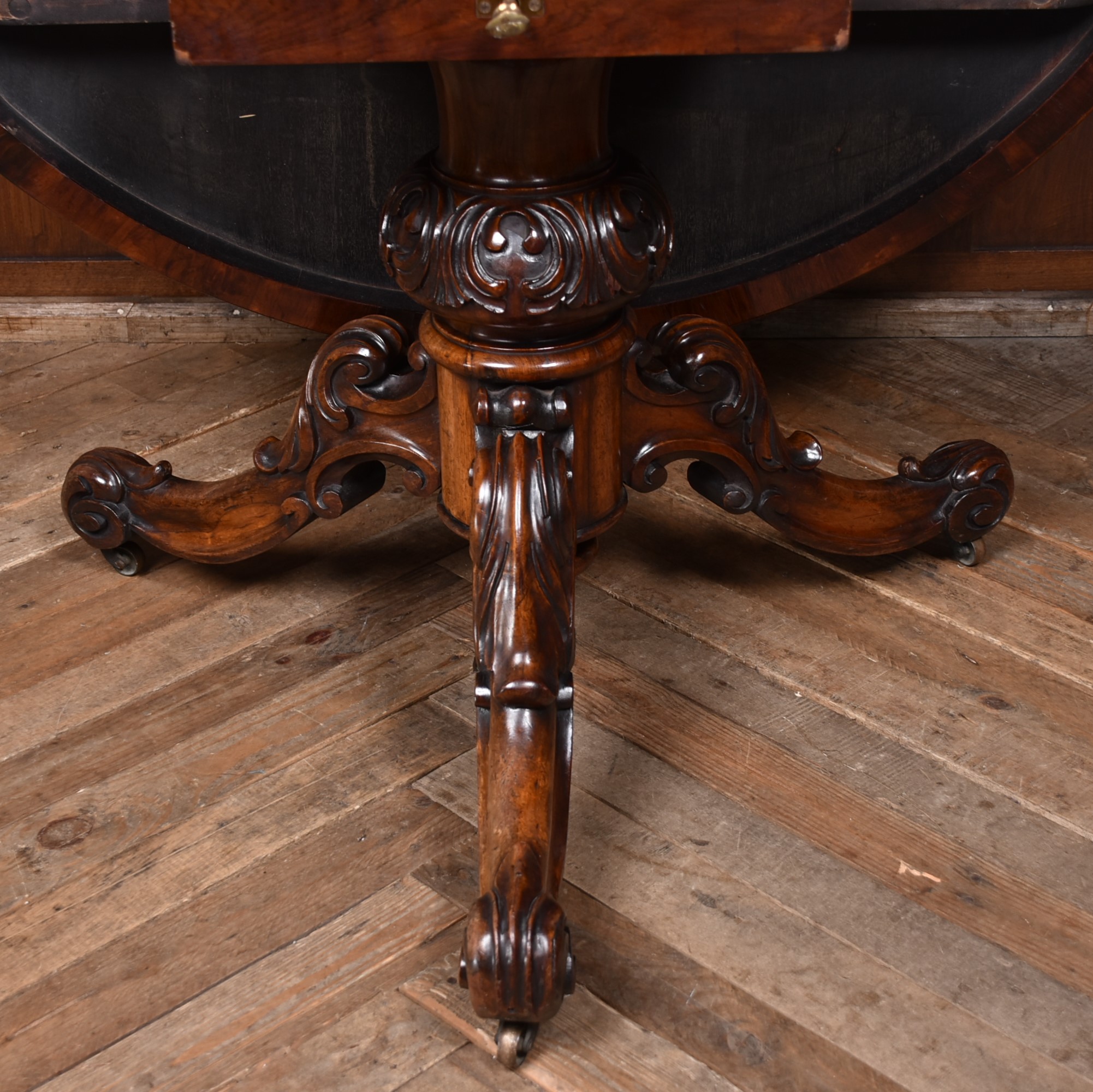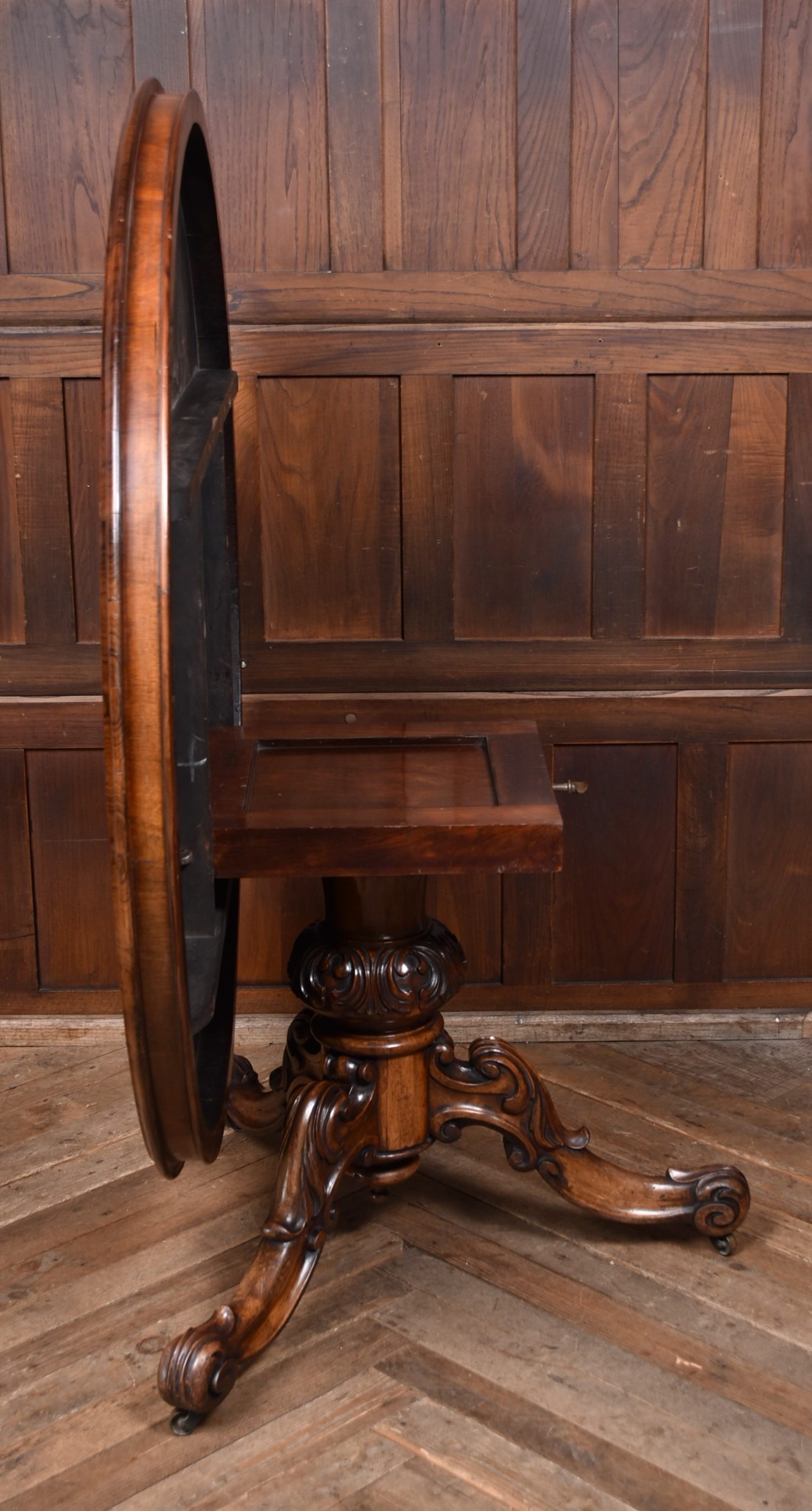 A fine Victorian rosewood tilt‑top table with a beautifully figured circular top and rich, warm colouring throughout. The surface displays the characteristic depth and shimmer of well‑chosen rosewood, supported on an ornate carved pedestal with scrolling legs and original castors. The tilt mechanism functions smoothly, allowing the table to stand as an impressive decorative piece when not in use. A classic example of mid‑19th‑century craftsmanship—graceful, practical, and full of presence.