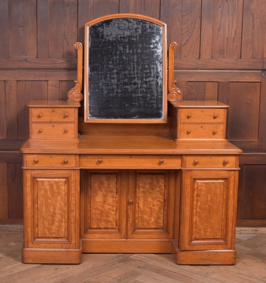 Fabulous Victorian satin wood dressing table in wonderful antique condition. The original mirror, elegantly upheld by scroll-carved supports, rests atop two petite drawers, adding both functionality and charm to the piece.