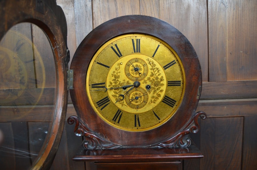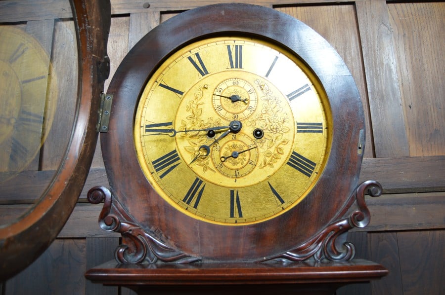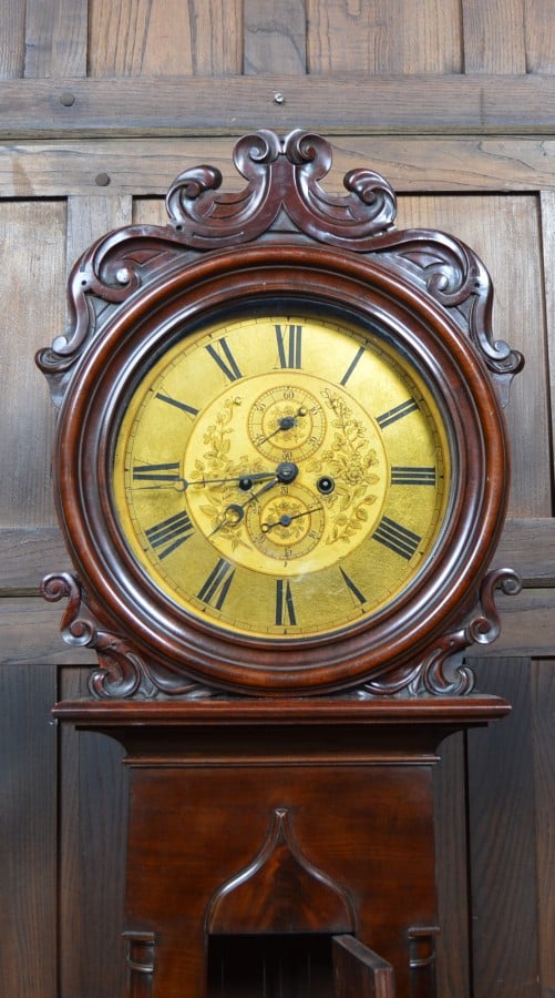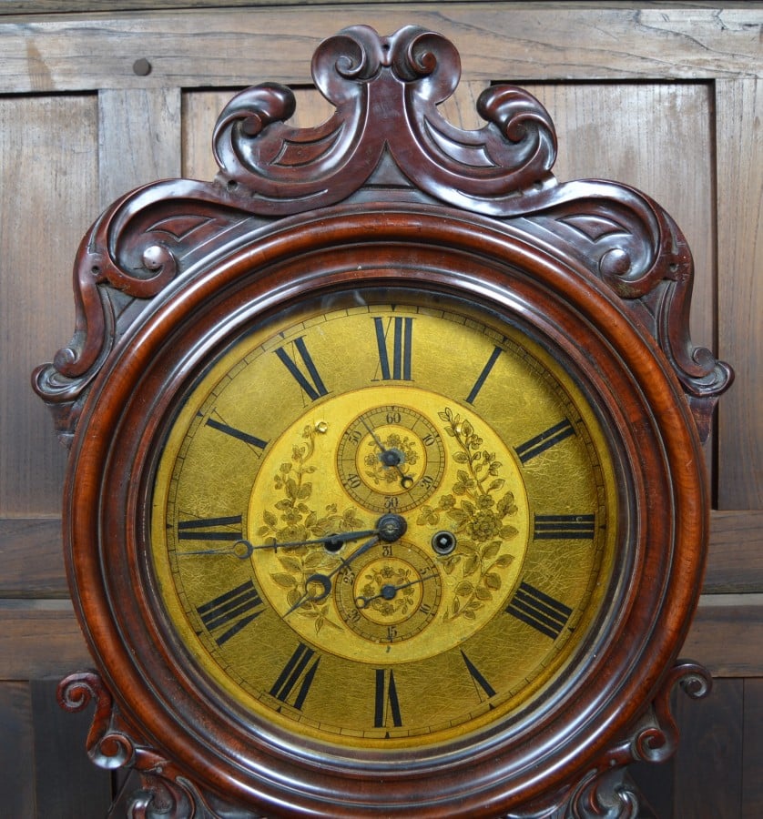 Fantastic Scottish mahogany drumhead Grandfather / longcase clock from the fabulous Victorian era. The clock has 8 day works that strike the hour on a bell. Its drum head hood is beautifully carved and sits on fantastic mahogany case with lockable door complete with key. The 14″ gilt dial has black roman numerals around the edge, in the centre, a decorative floral design with calendar and second dials. A wonderful example having a splendid colour and design and in good working order. Like all antiques there are the odd age-related marks but that does not diminish the outstanding quality of this statement item.