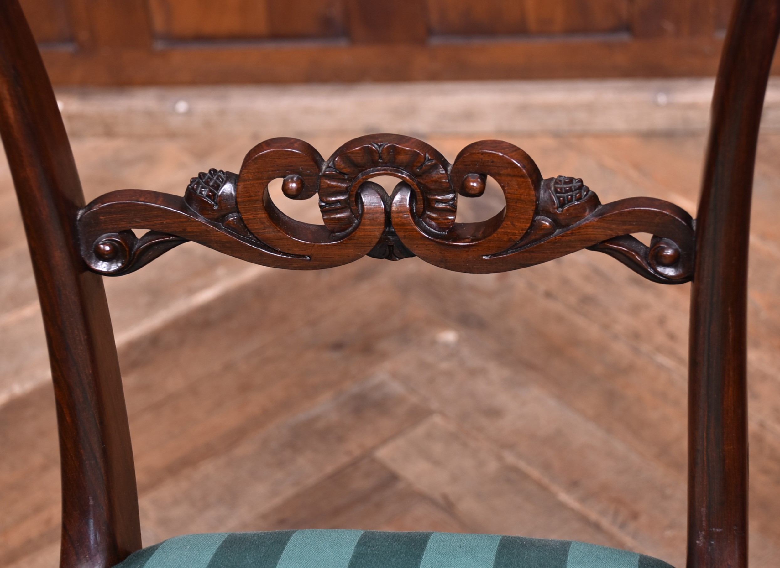 The rosewood frames display a rich, warm patina and coloration, embodying the natural character of antique furniture. Despite the imperfections inherent in vintage pieces, this set is beautifully crafted and offers a seamless blend of historical beauty and functional utility, making it a superb choice for enhancing any dining space.