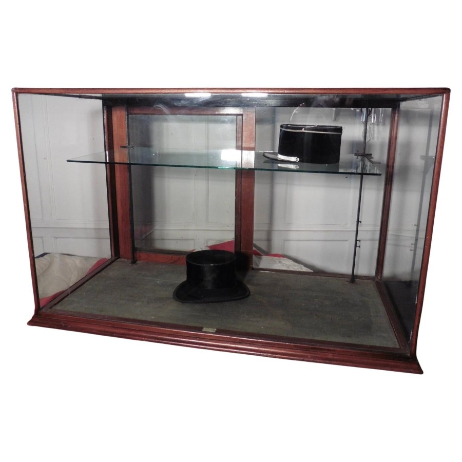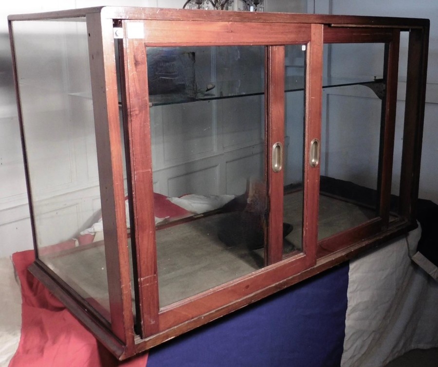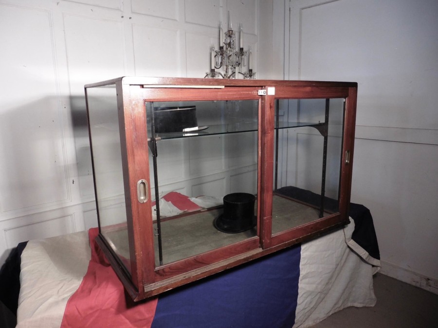 Victorian Shop Display Counter Top Cabinet This is superb Victorian shop display Cabinet, it has a walnut frame, the base of the cabinet is covered in its original faded blue Velvet, and the makers label, RADIN %26 CO, Shoreditch. The Cabinet is heavy it is made with plate glass, it has sliding doors on one side and a moveable plate glass shelf, supported on iron brackets The Cabinet is in used but sound condition, the velvet is worn but reasonably sound and there is an old lock fixed to the door which could be removed The Cabinet is 47” long, 30” high and 23” deep SR142 Manufacture Date : 19th Century Materials : Glass