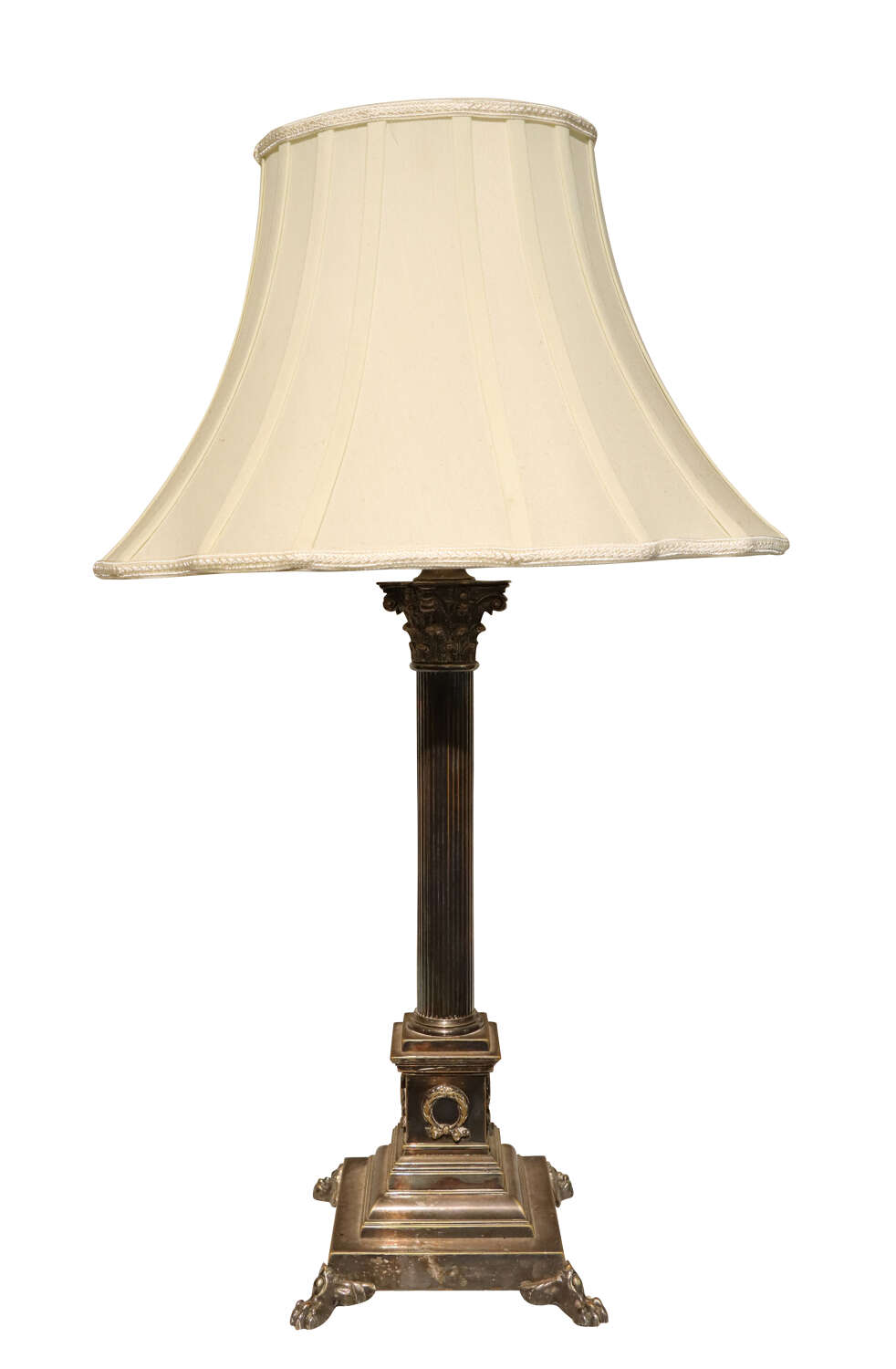 The fluted column is surmounted by a finely cast Corinthian capital, richly detailed with acanthus leaves, and raised on a stepped square base adorned with applied wreath motifs. The whole stands on distinctive lion’s paw feet, giving the piece both presence and a strong architectural character.