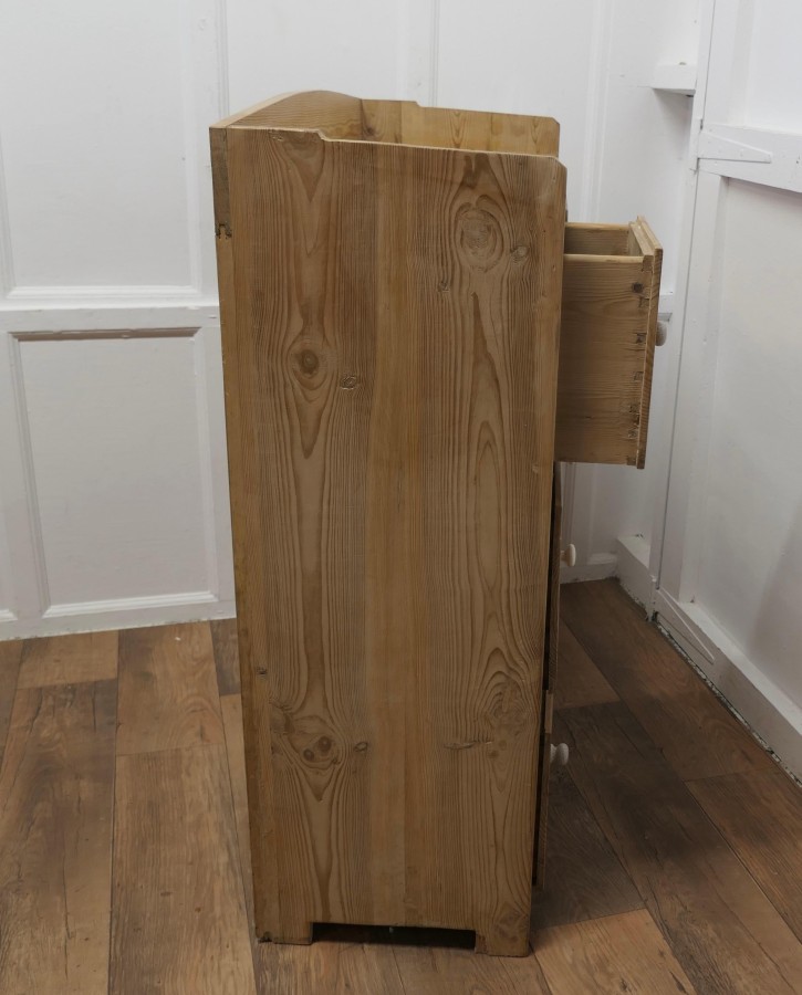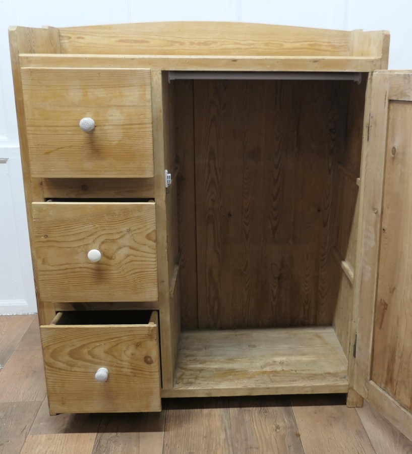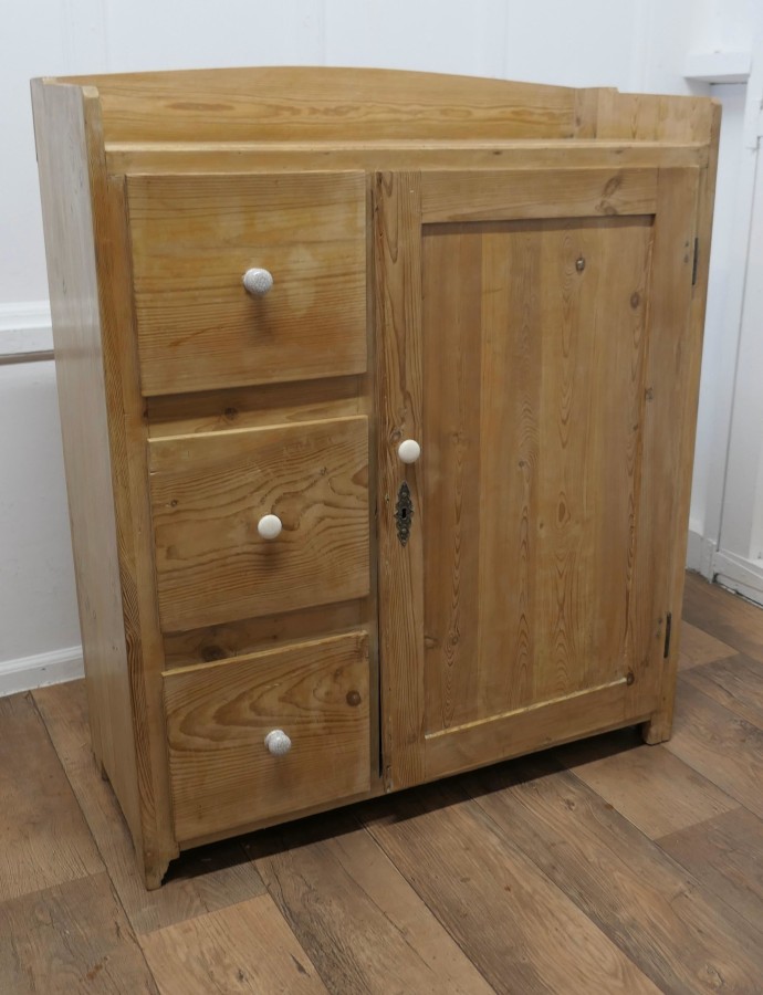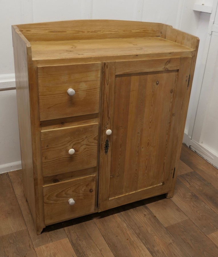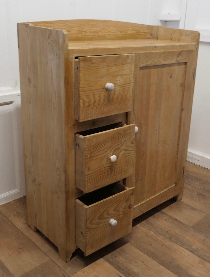 Victorian Stripped Pine Greeting Station Cupboard This is a very good quality cupboard, it has been used as a Restaurant Greeting Station, it has a panelled front and a flat galleried top, 3 deep storage drawers and a tall cupboard below with provision for shelves A sleek and compact piece with plenty of storage The greeter is in good condition it has been stripped and has a waxed finish there are no loose joints and the drawers run well, it is 47” high it is 39” wide and 16” deep VY192 Manufacture Date : 19th Century Materials : Pine