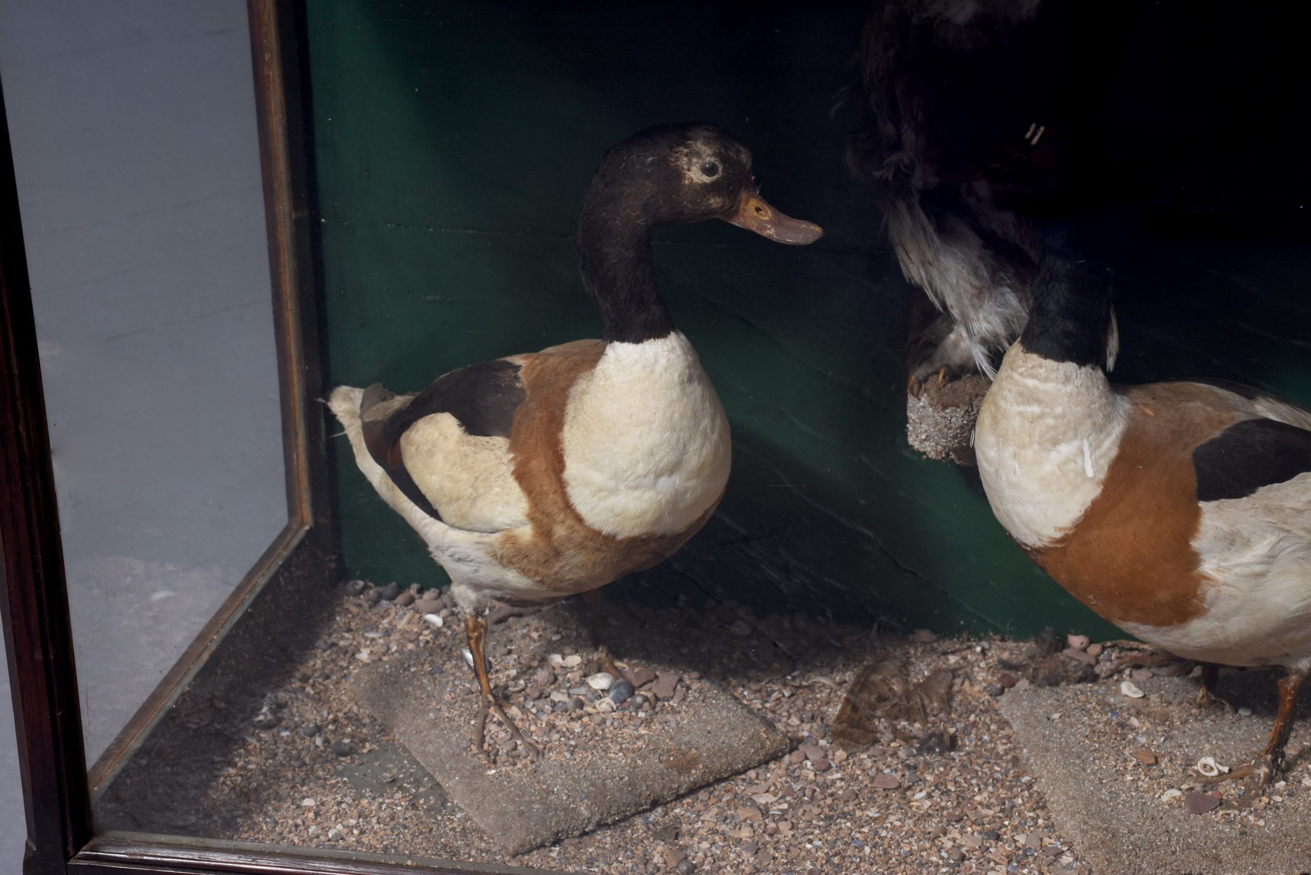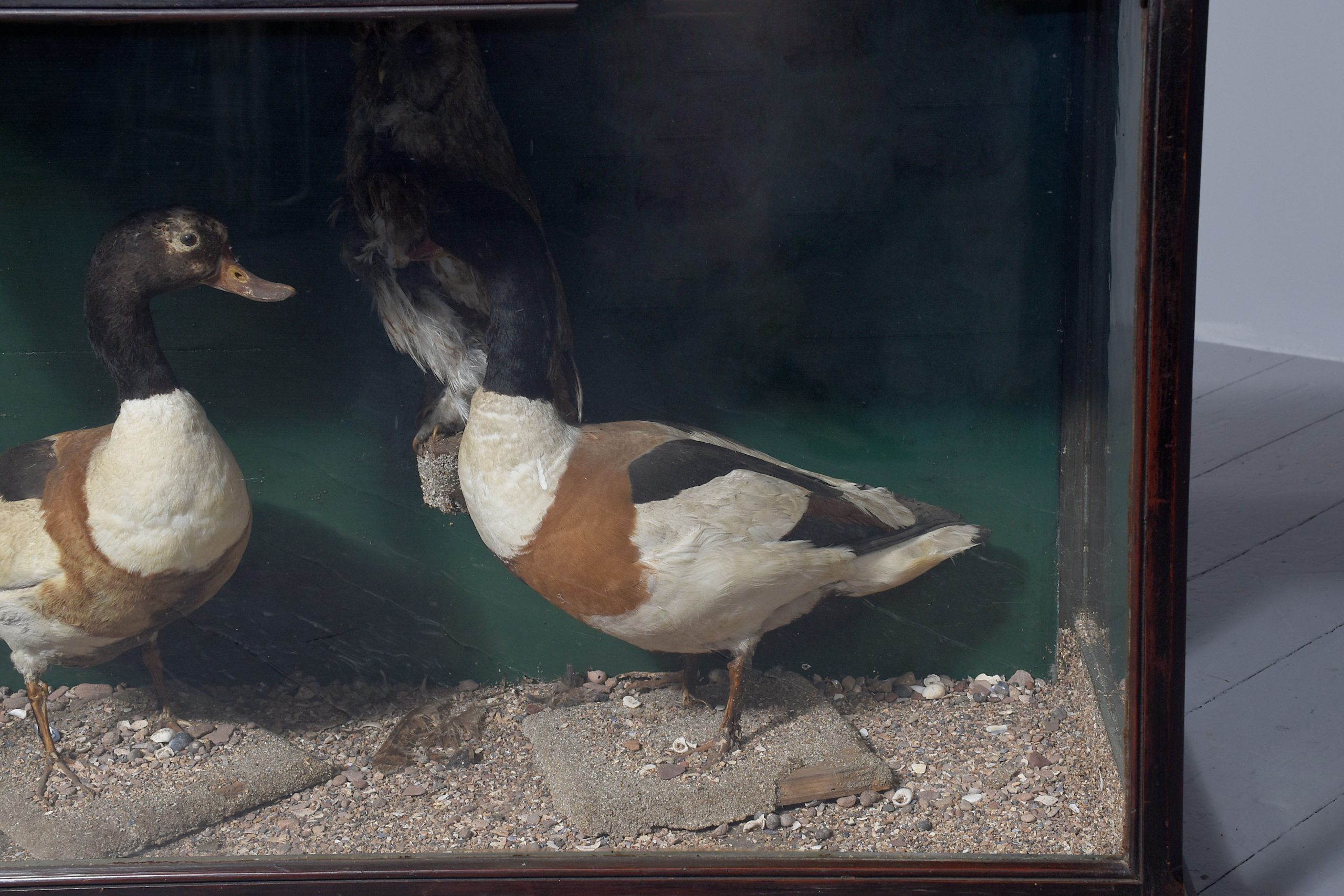 Circa 1890. Victorian wooden showcase with two ducks and an owl taxidermy, mounted in realistic poses. The interior with sand and shells on the base, with a painted green background. The taxidermy case with a polished top and chamfered fore-edges over a small, enclosed plinth. All in excellent condition.