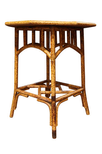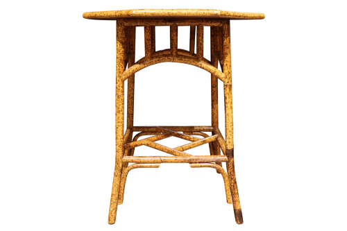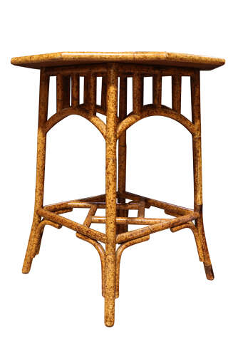 An attractive Victorian occasional table of octagonal form, constructed in tiger bamboo. The moulded octagonal top is raised on slender bamboo supports united by stretchers and a square under-tier with diagonal bracing.