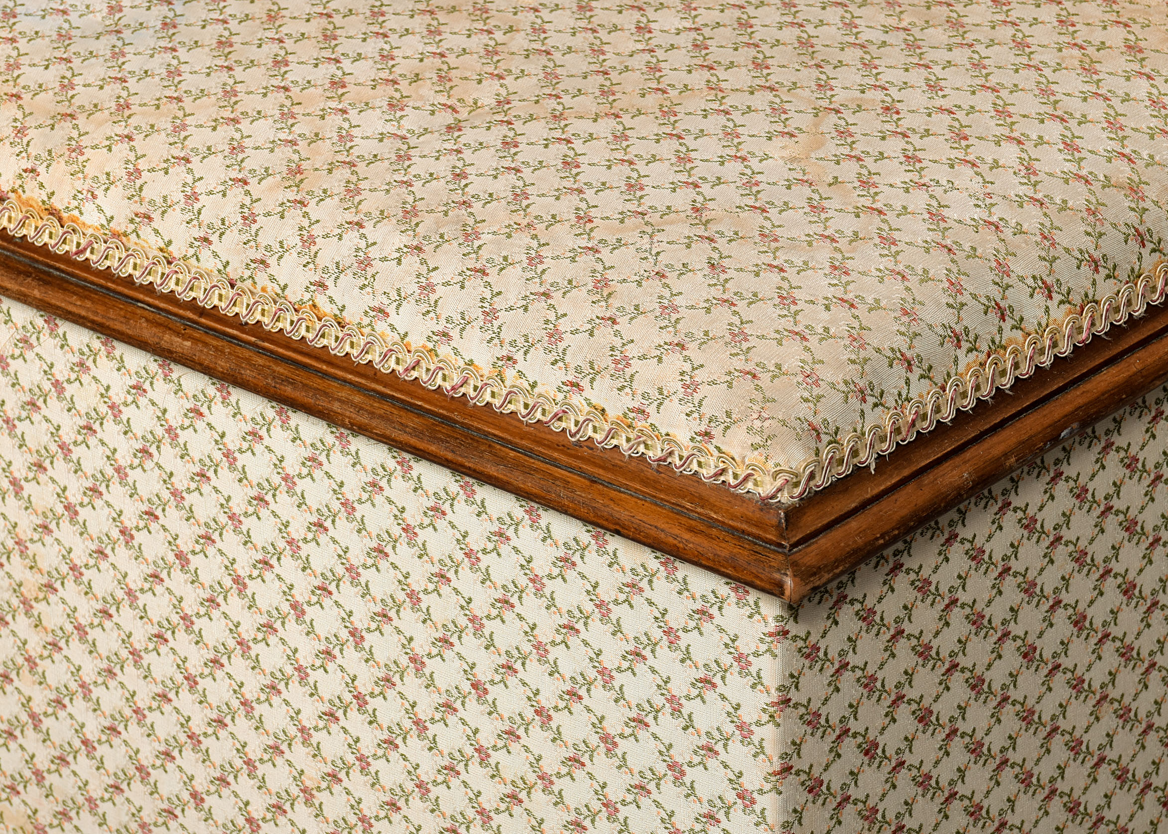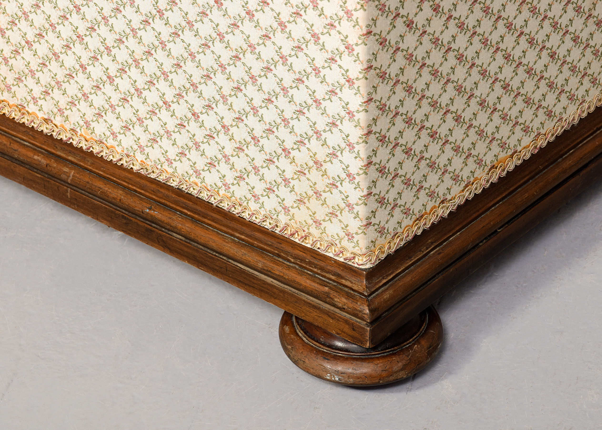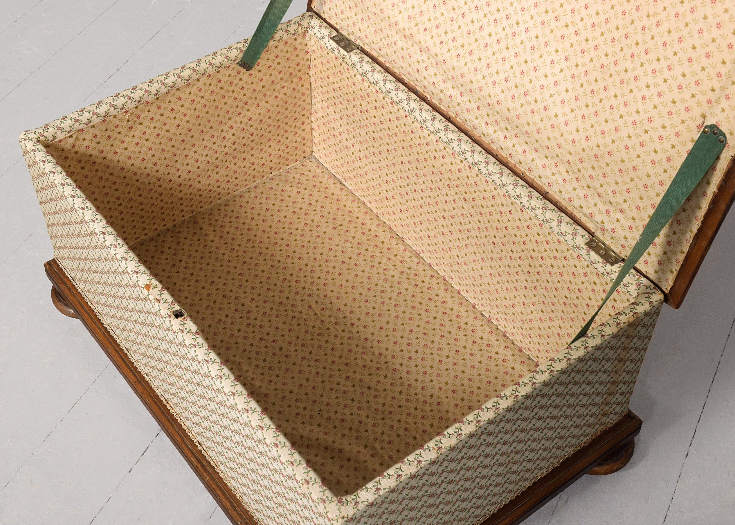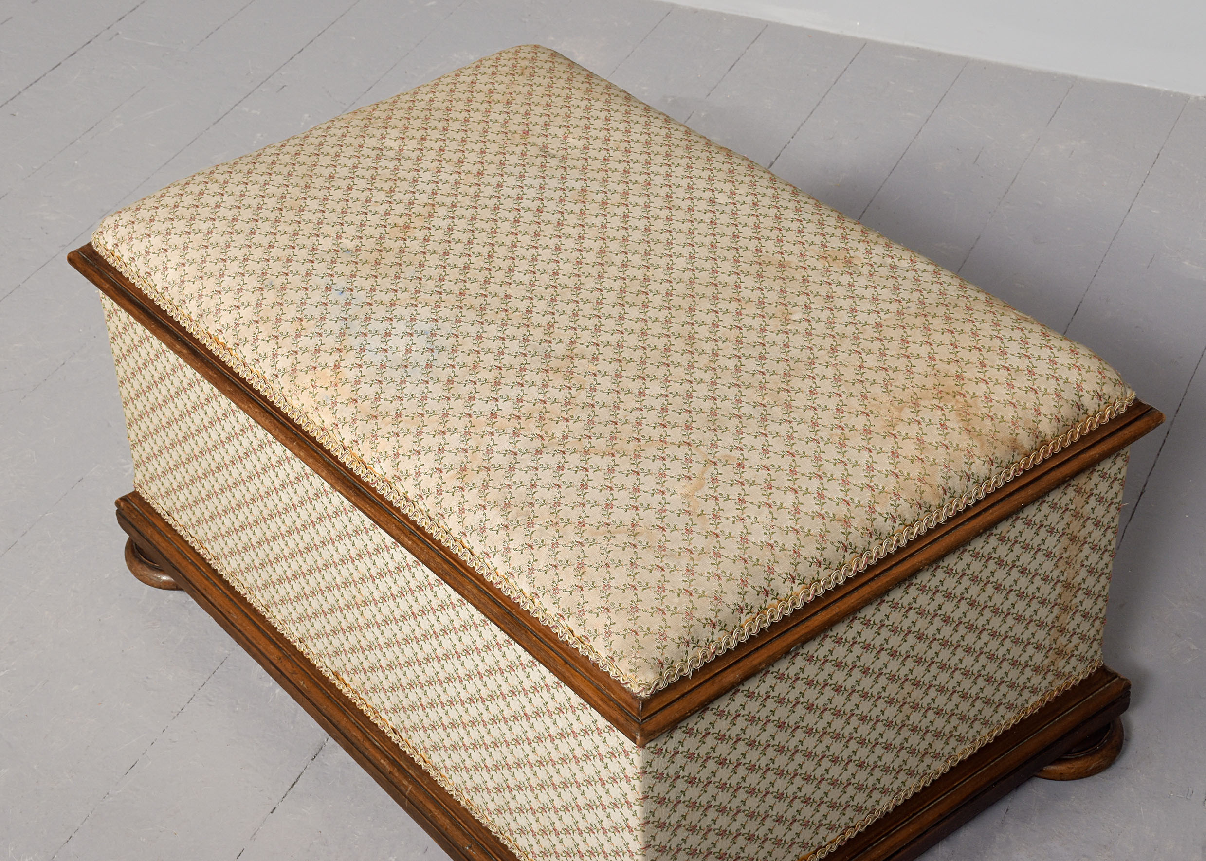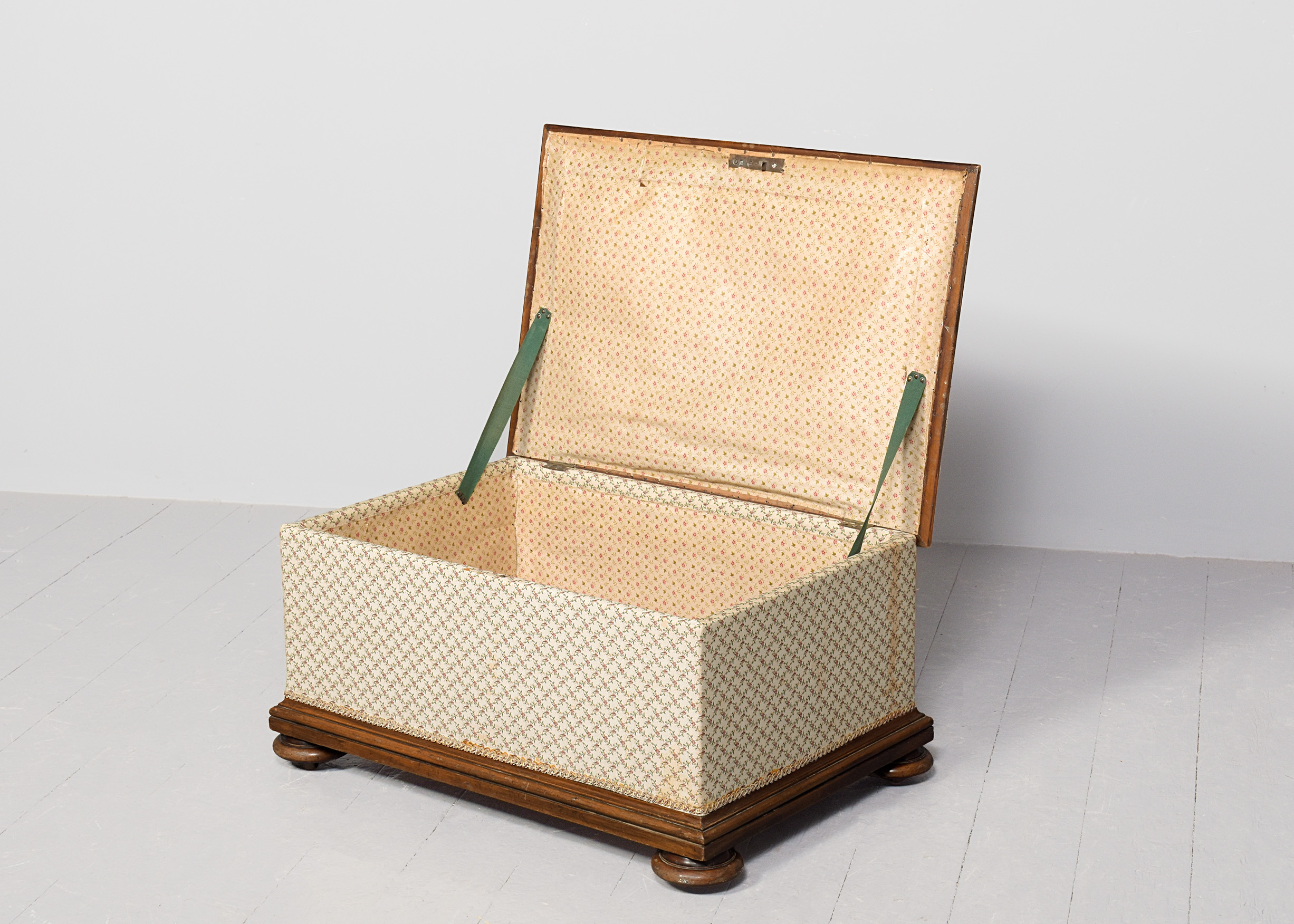 Circa 1860. A Mid-Victorian walnut-framed ottoman stool, with rectangular upholstered hinged top, within a moulded frame, opens to a chintz-lined interior, the bottom of the stool with stylish mouldings, all resting on four squat bun feet with concealed brass and porcelain castors.