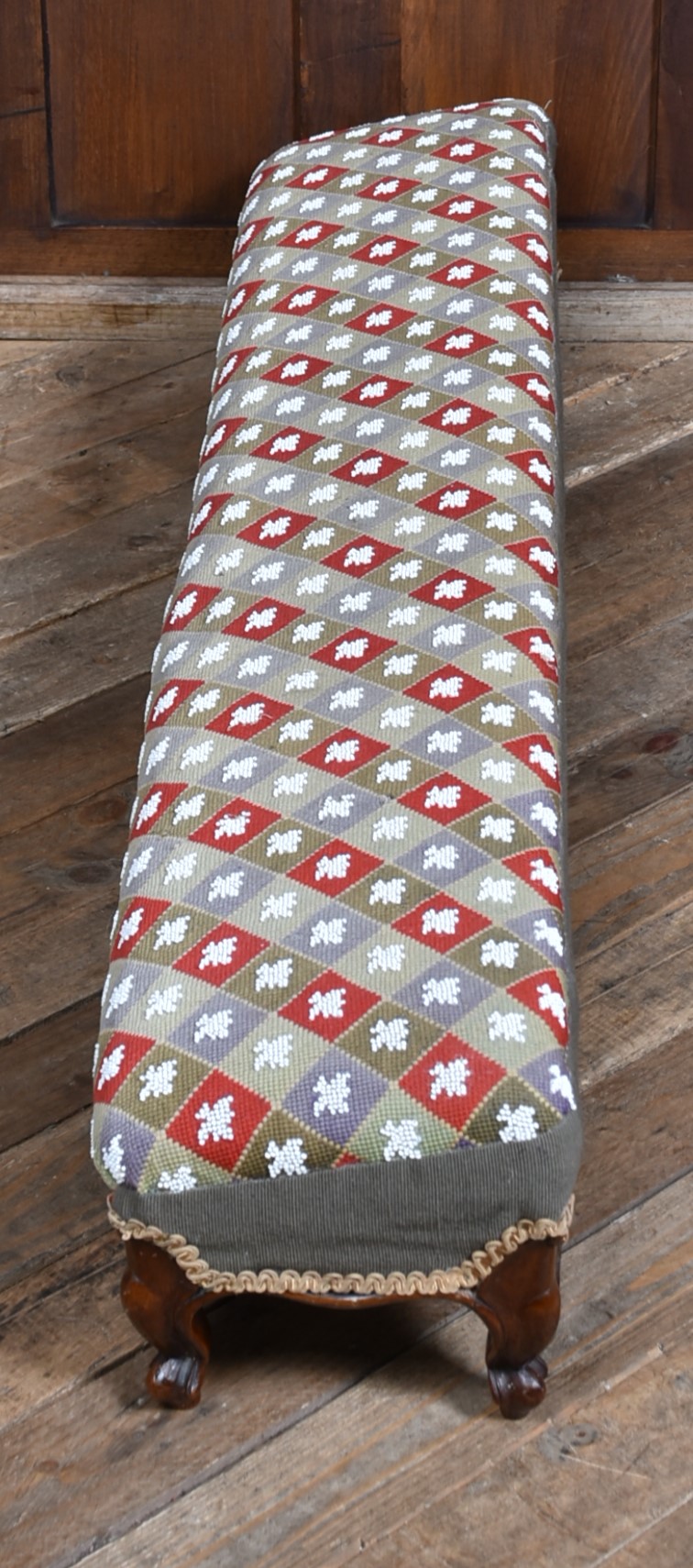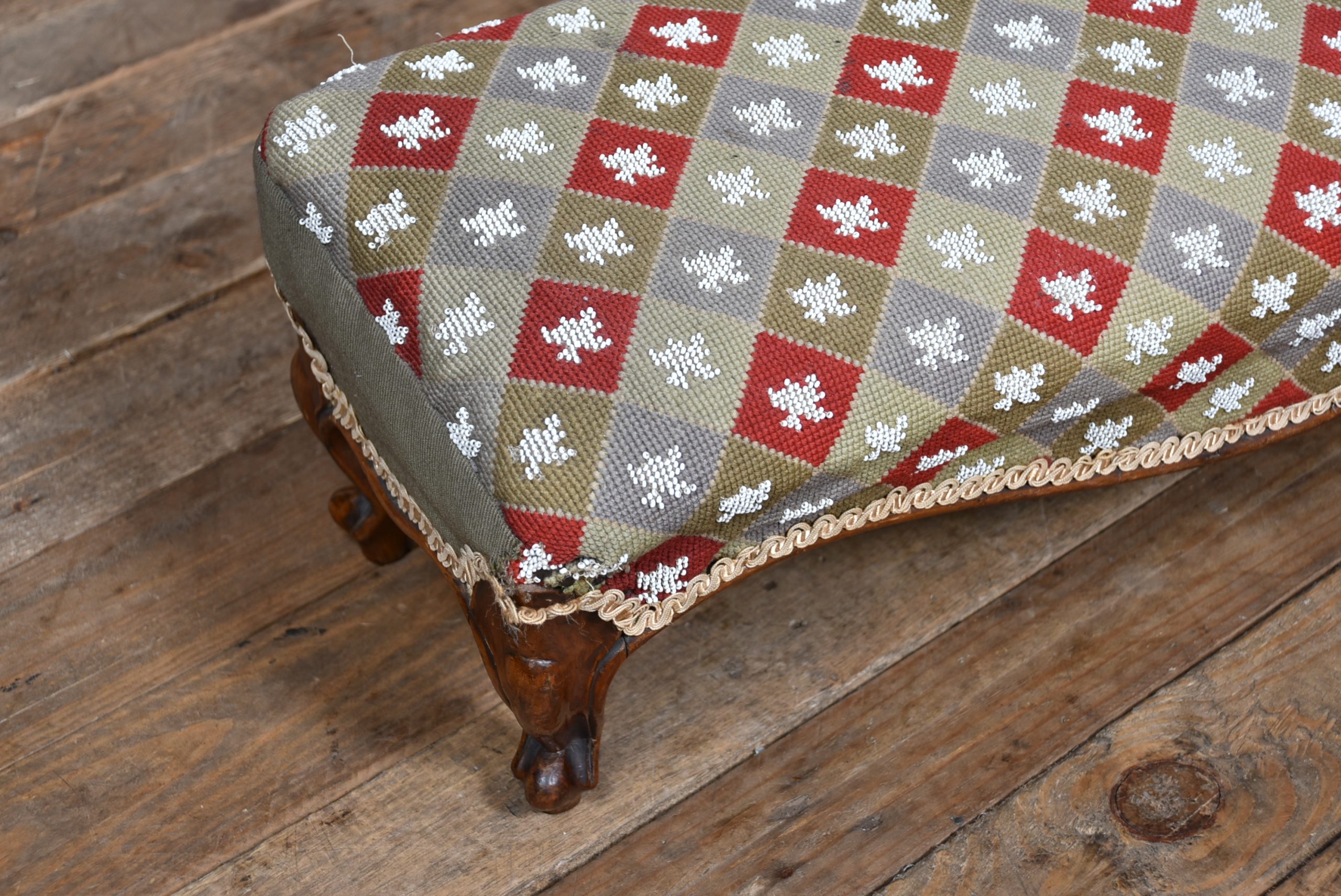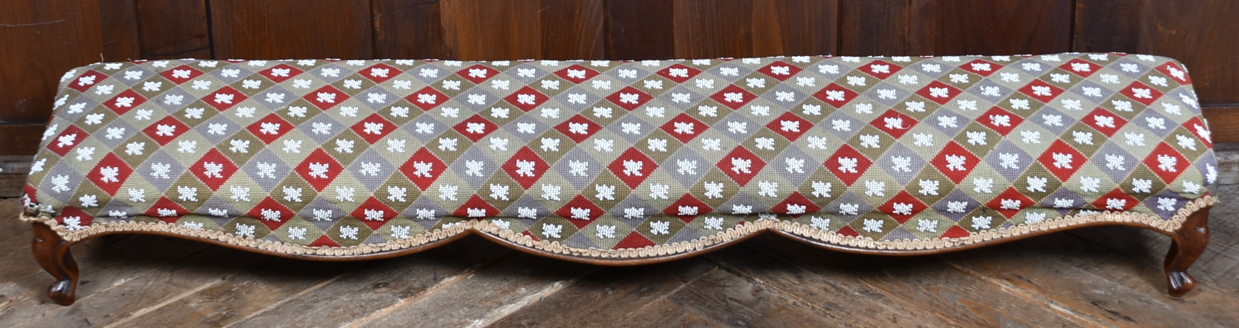 A charming Victorian walnut fender stool upholstered in a beadwork fabric featuring a repeating diamond motif in tones of red, green, and grey. The lower section is finished in deep green fabric, edged with a scalloped trim and decorative braid that lends texture and contrast. Raised on carved wooden legs with a shaped apron, the stool offers both comfort and visual appeal. Its craftsmanship and textile detailing make it a versatile accent—equally suited to hearthside seating or as a decorative feature in a hallway or drawing room.