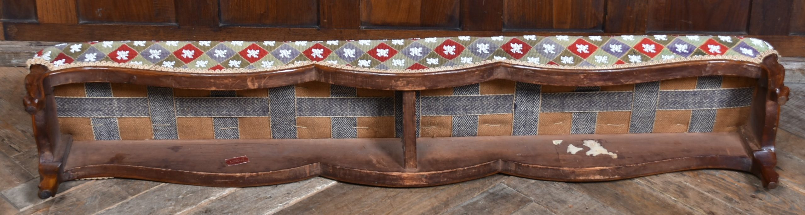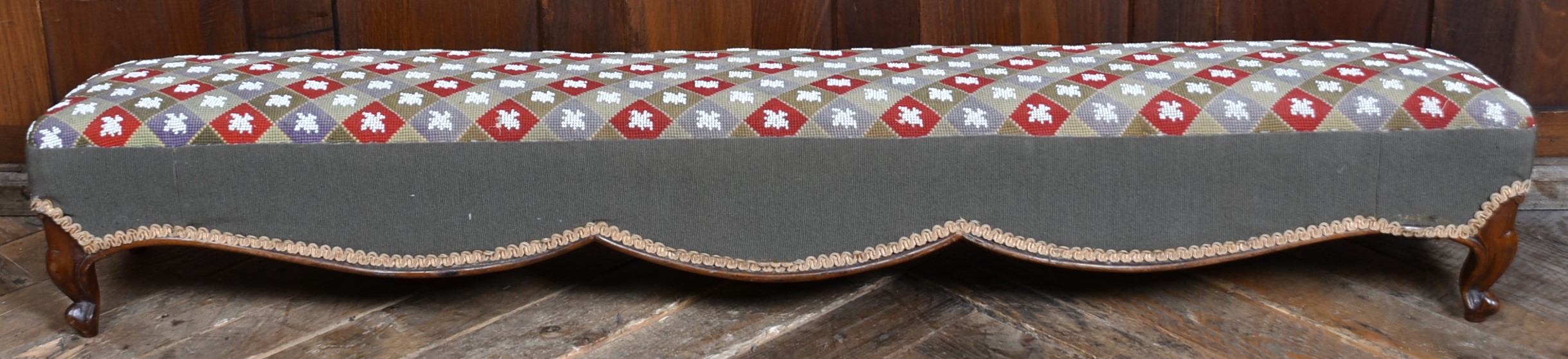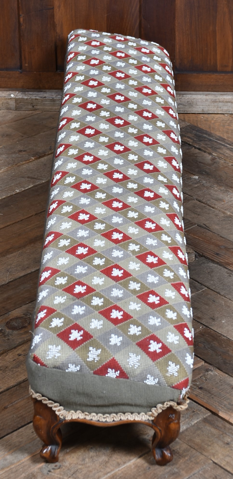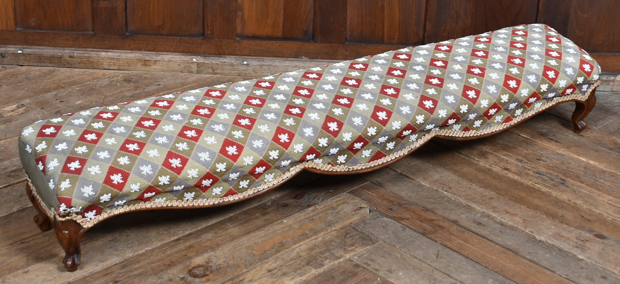 A charming Victorian walnut fender stool upholstered in a beadwork fabric featuring a repeating diamond motif in tones of red, green, and grey. The lower section is finished in deep green fabric, edged with a scalloped trim and decorative braid that lends texture and contrast. Raised on carved wooden legs with a shaped apron, the stool offers both comfort and visual appeal. Its craftsmanship and textile detailing make it a versatile accent—equally suited to hearthside seating or as a decorative feature in a hallway or drawing room.