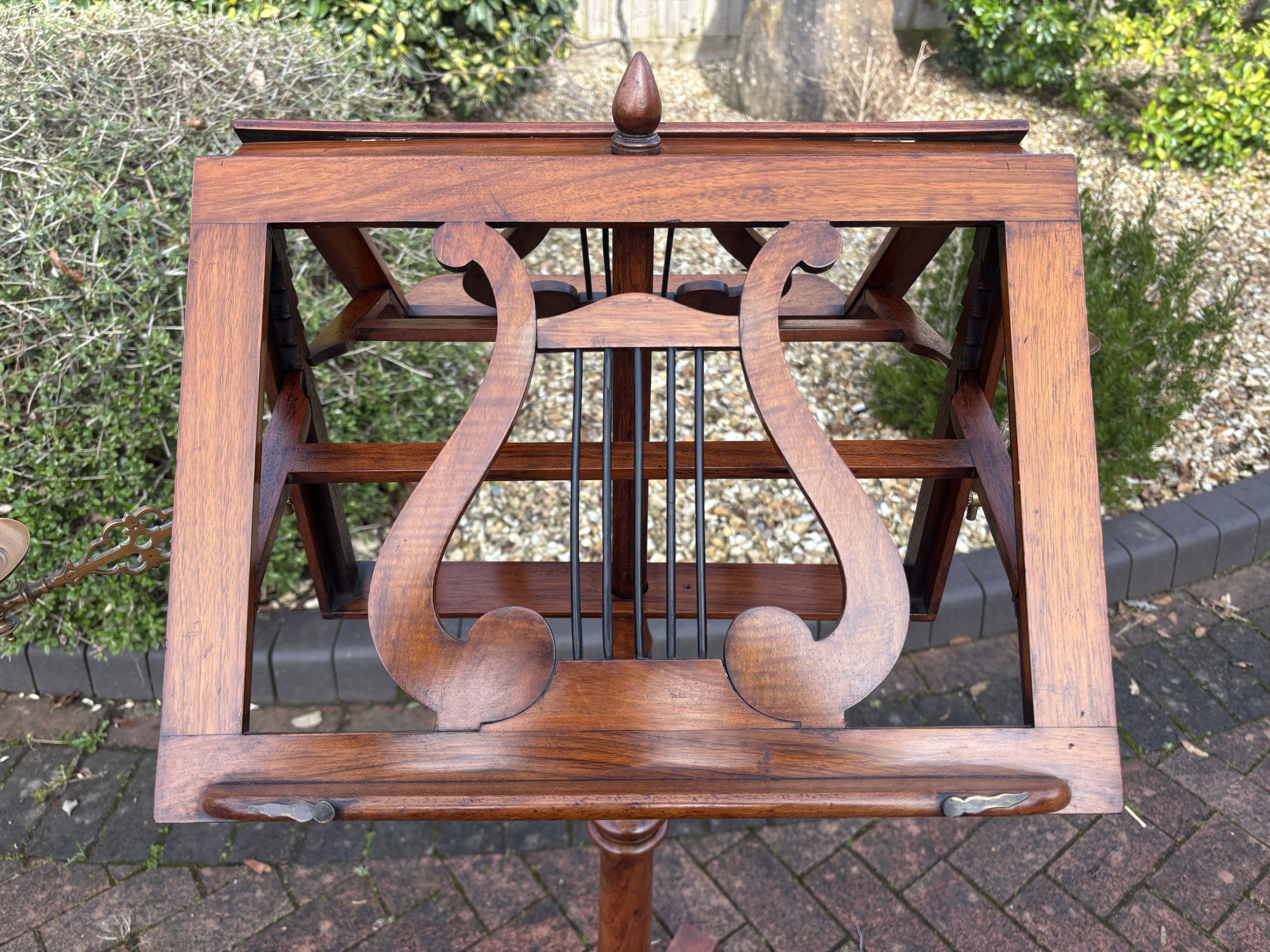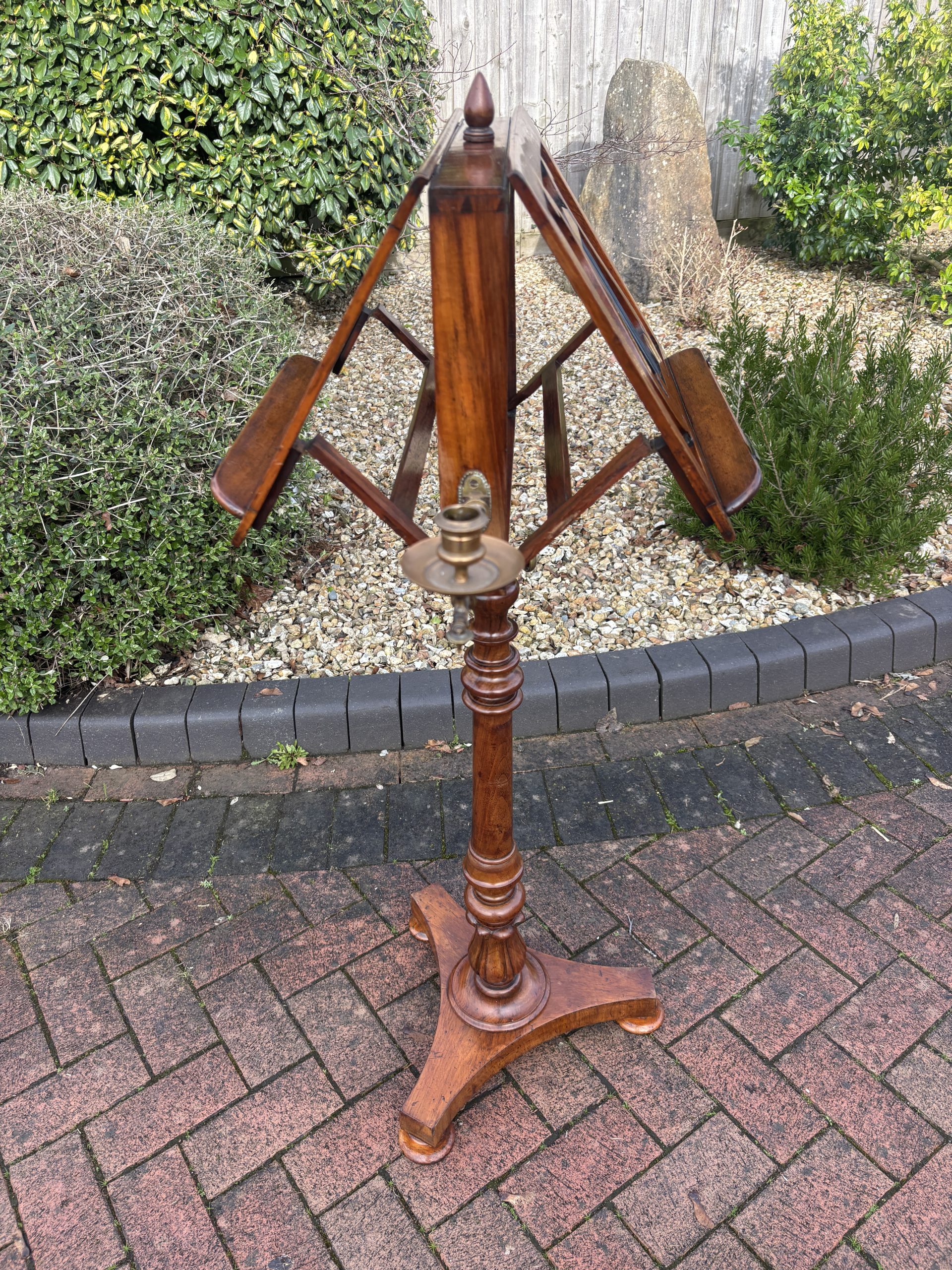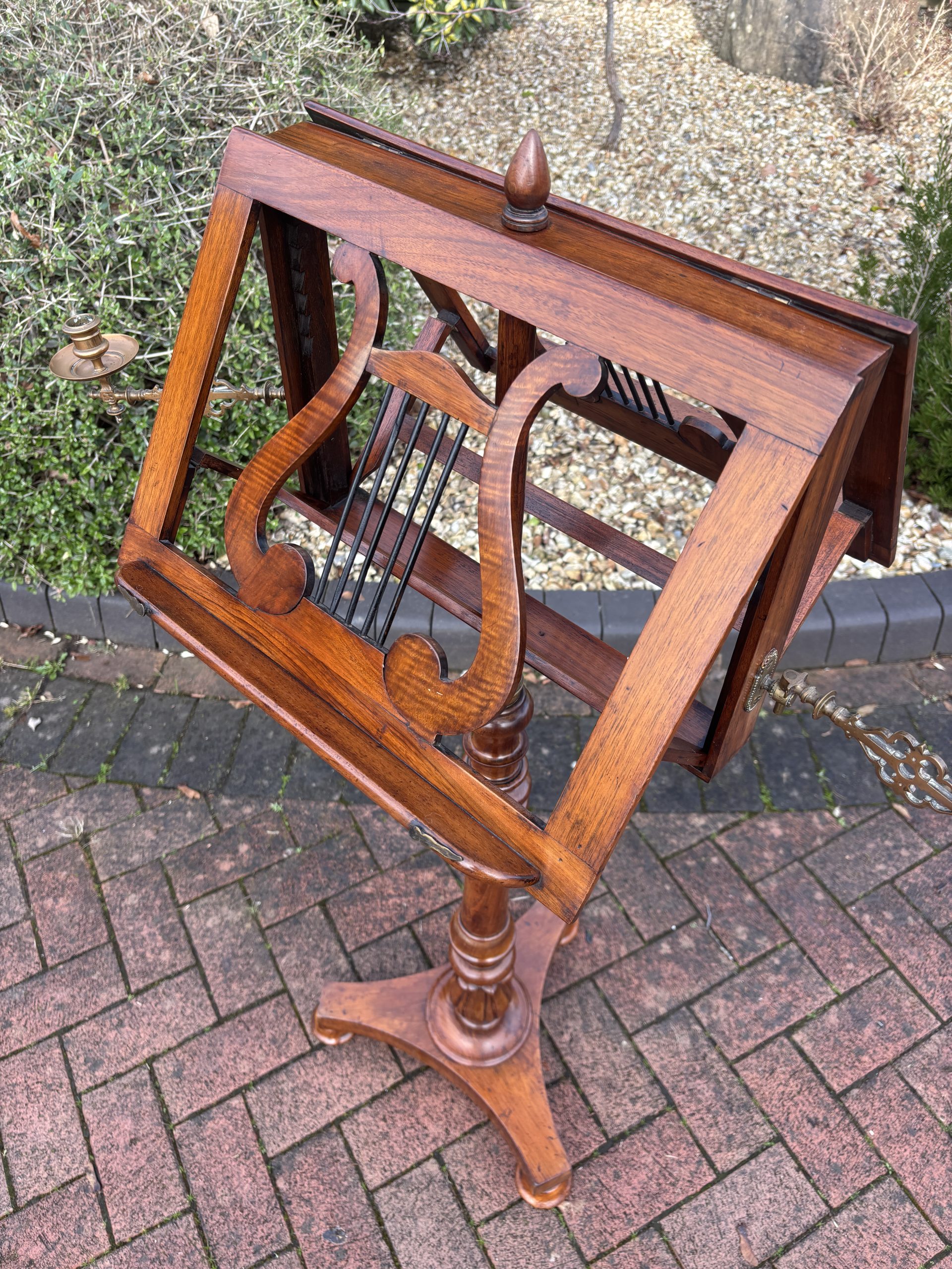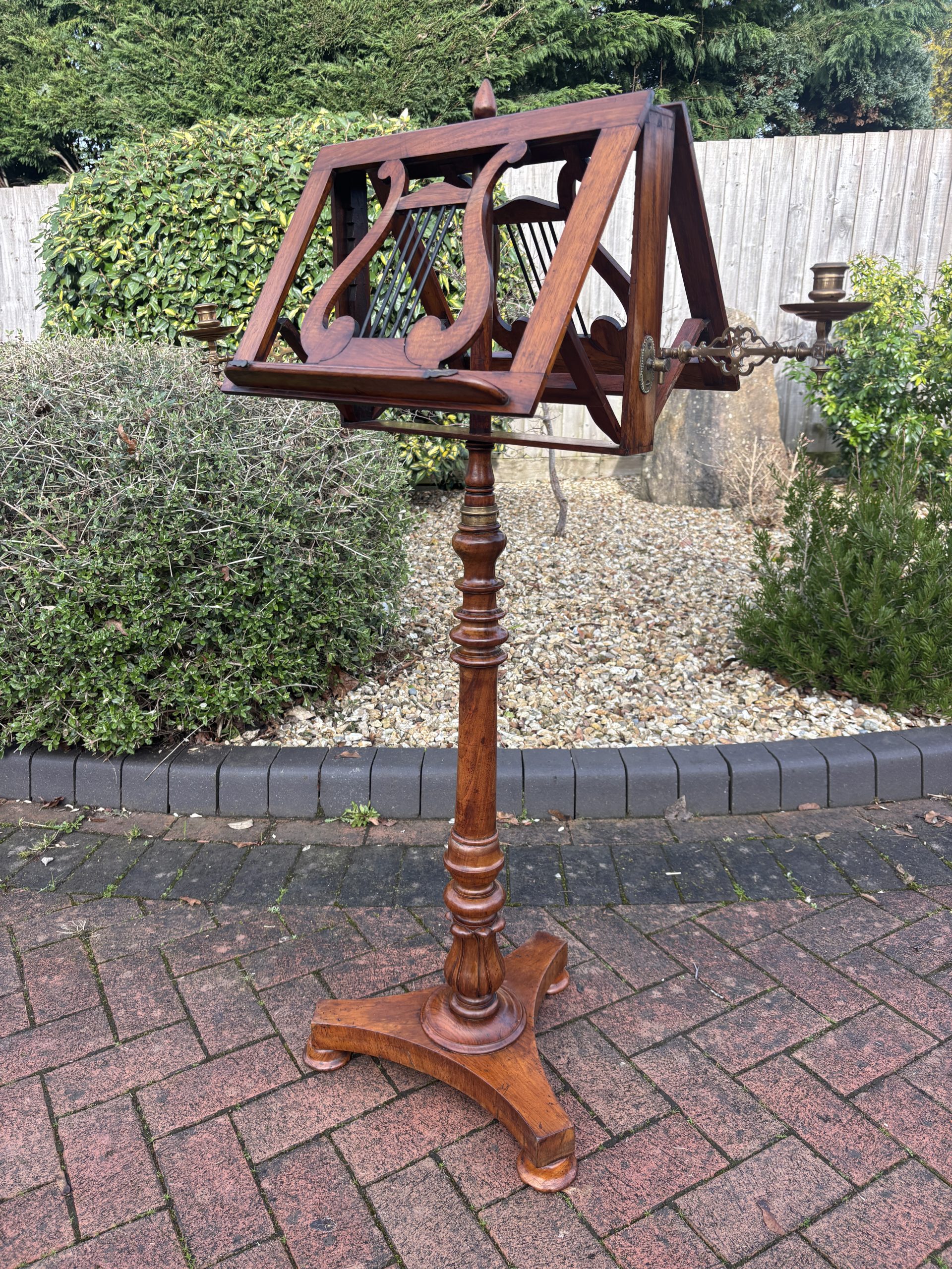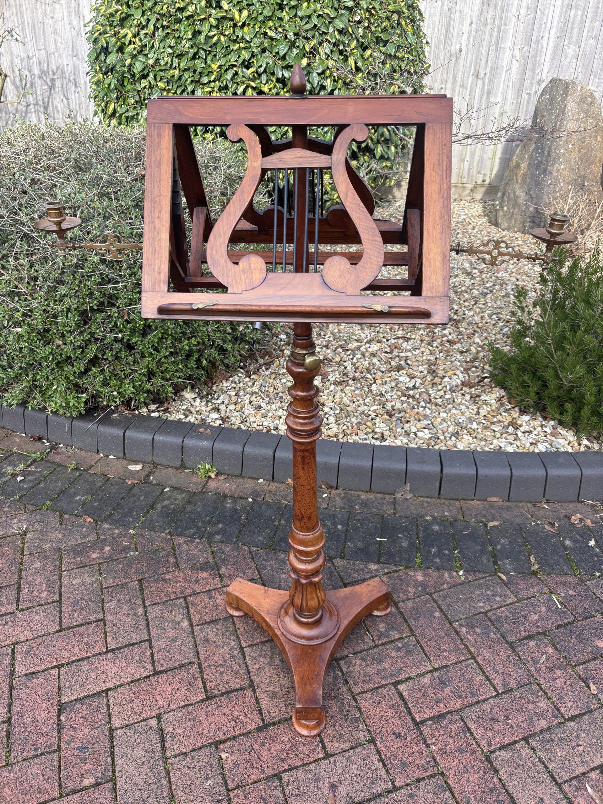 A very fine Victorian solid walnut duet music stand, surmounted by a turned finial, lyre shaped sheet music rests which are adjustable on both sides, flanked by its original brass candle holders. Supported on a turned central height adjustable column, tri-form base and bun feet.