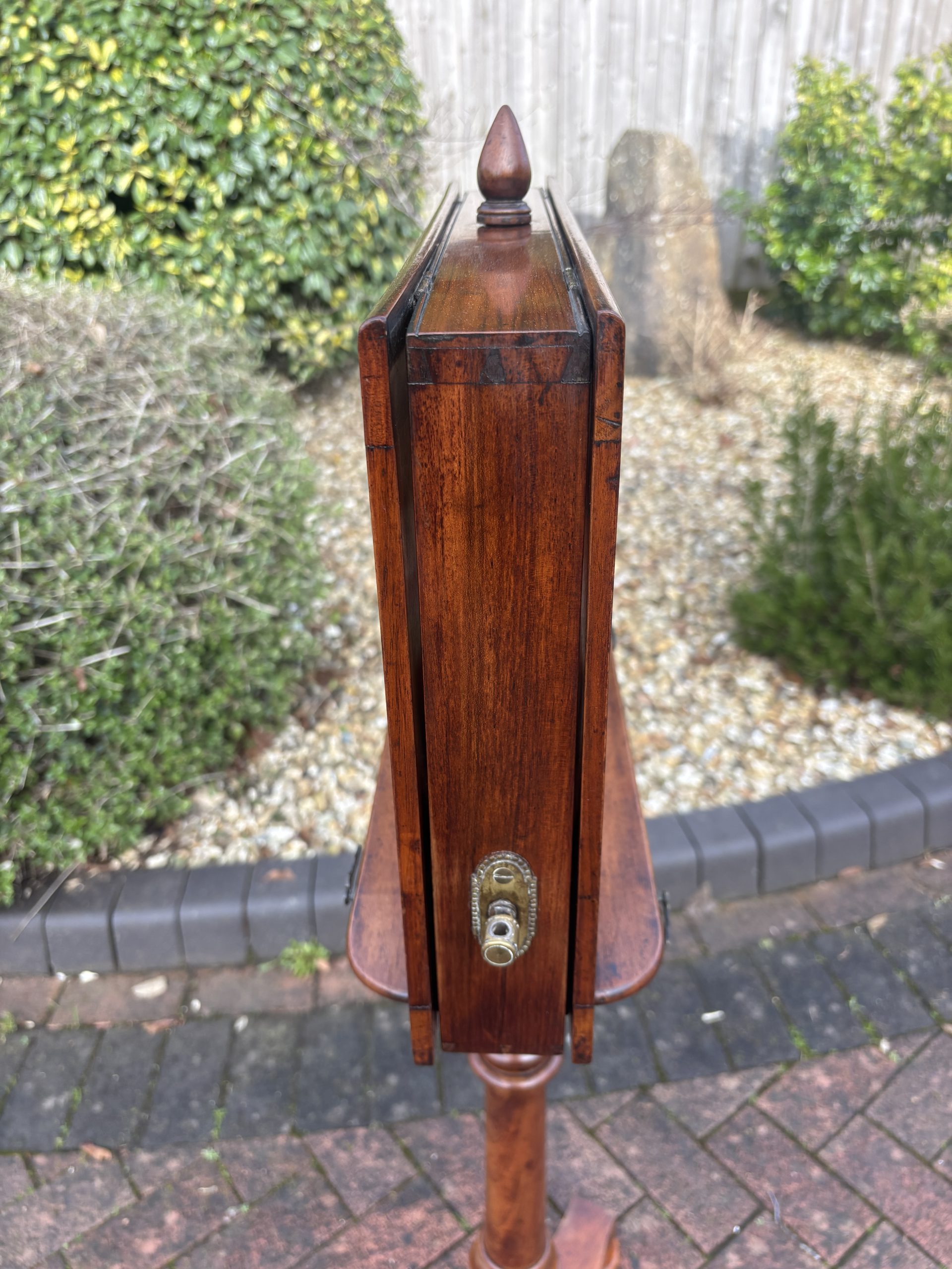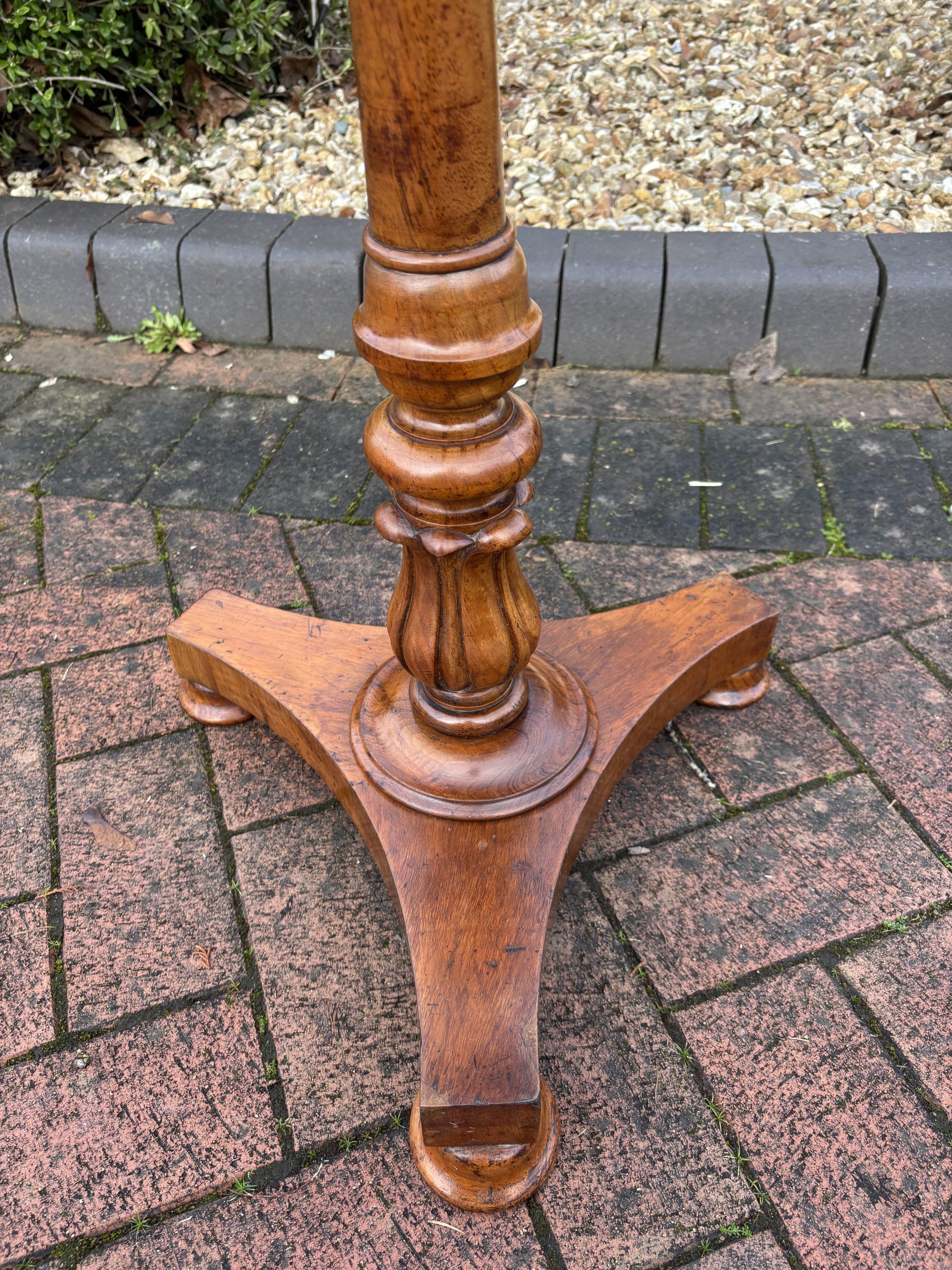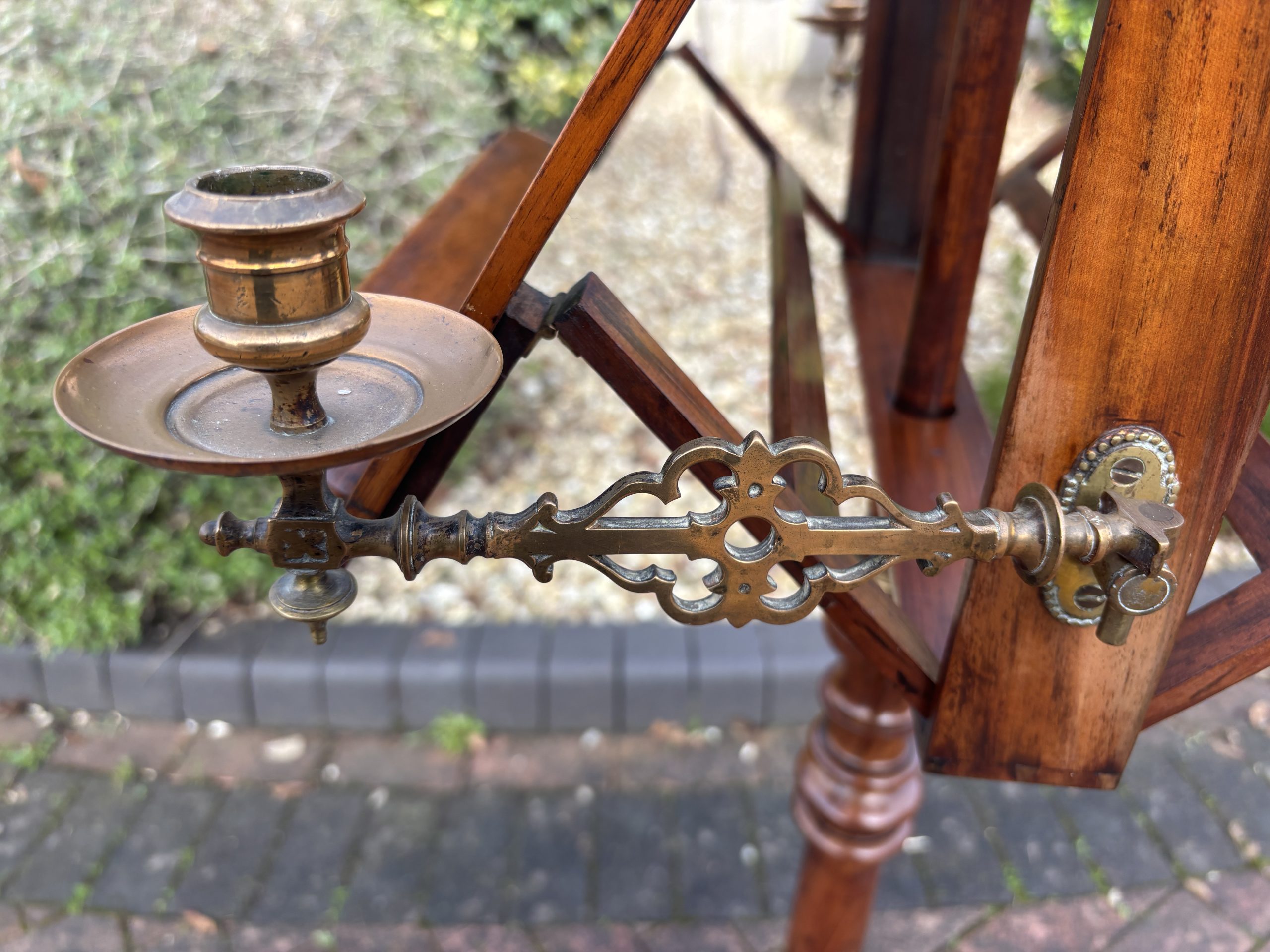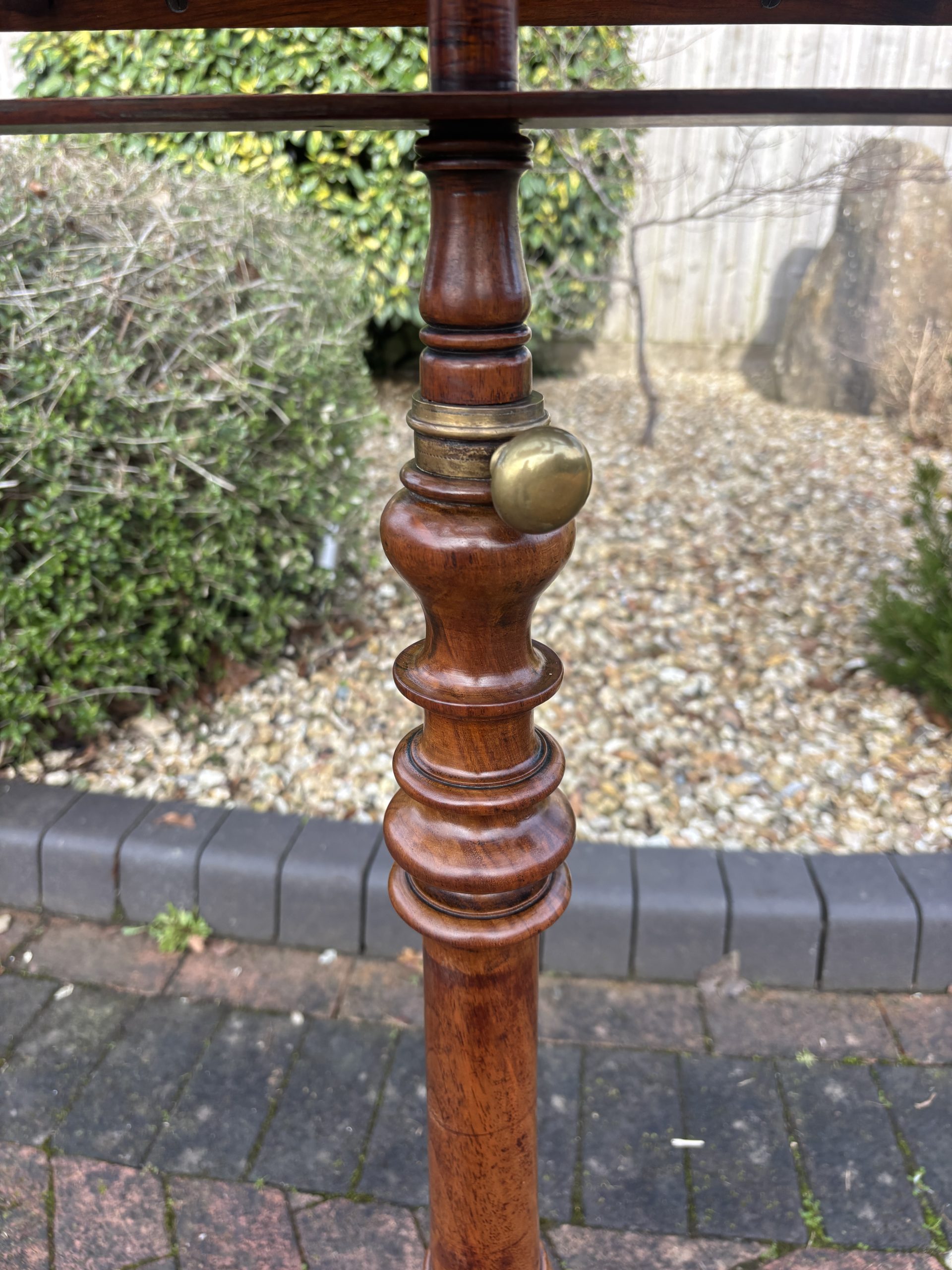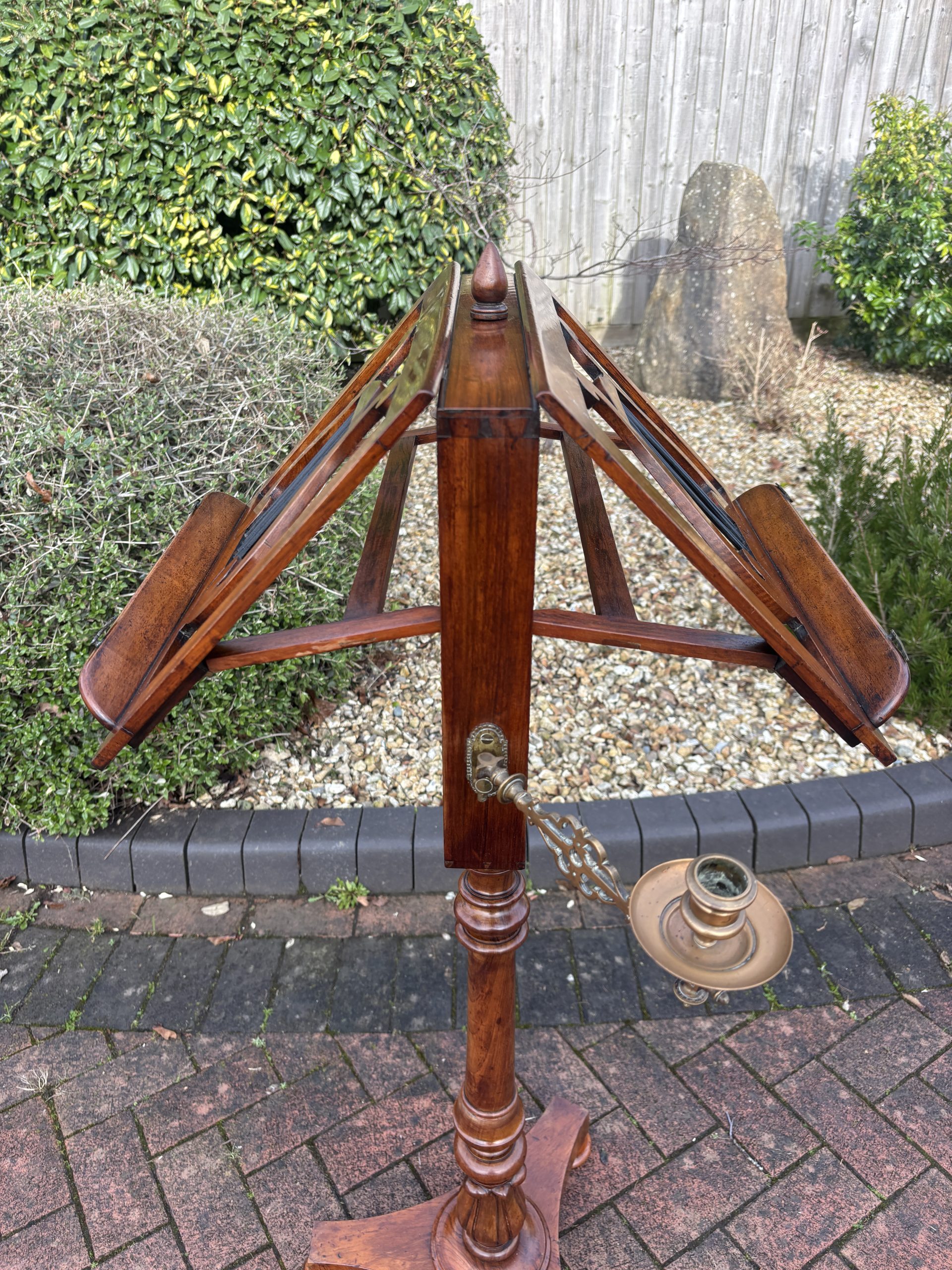 A very fine Victorian solid walnut duet music stand, surmounted by a turned finial, lyre shaped sheet music rests which are adjustable on both sides, flanked by its original brass candle holders. Supported on a turned central height adjustable column, tri-form base and bun feet.