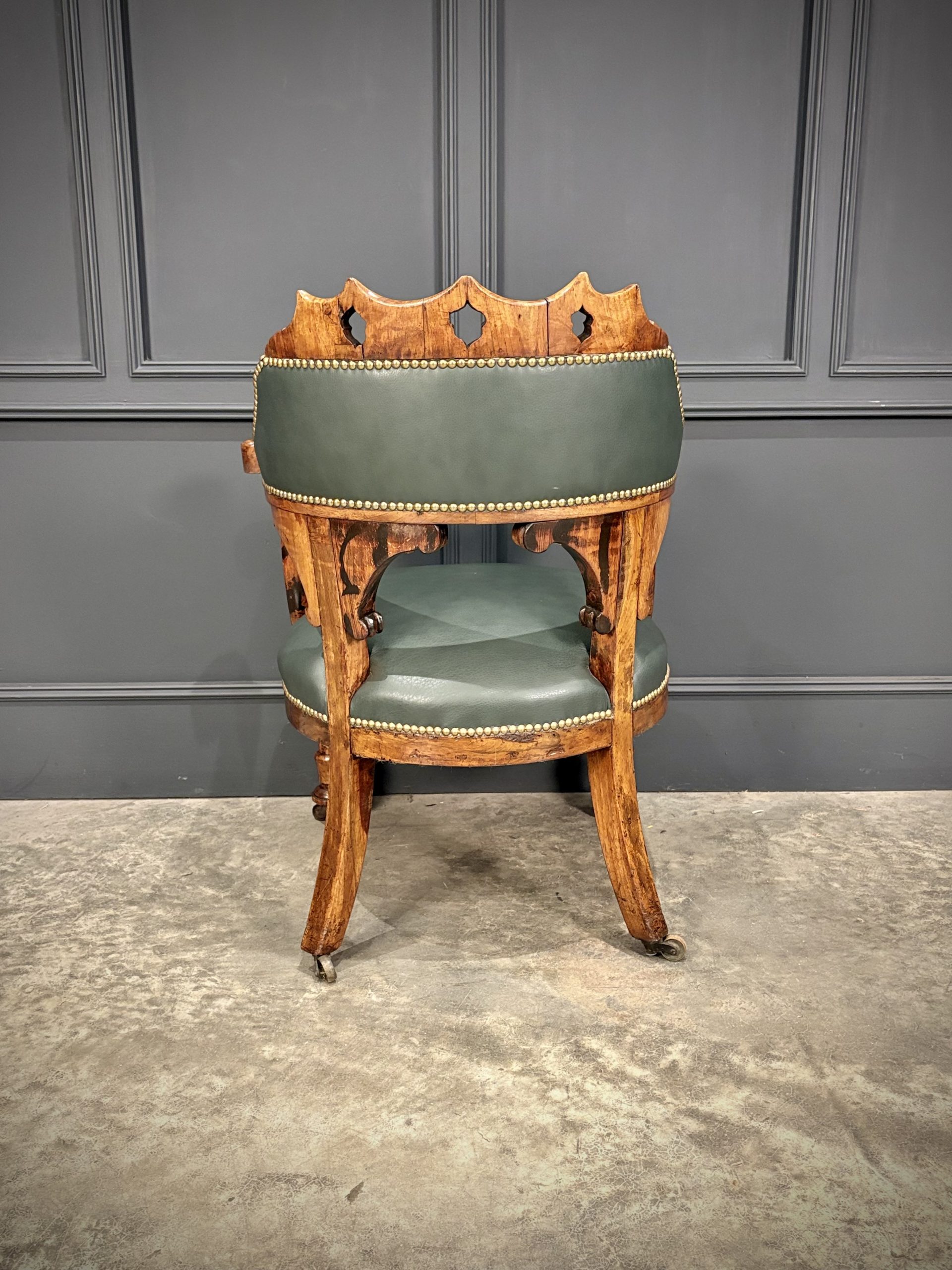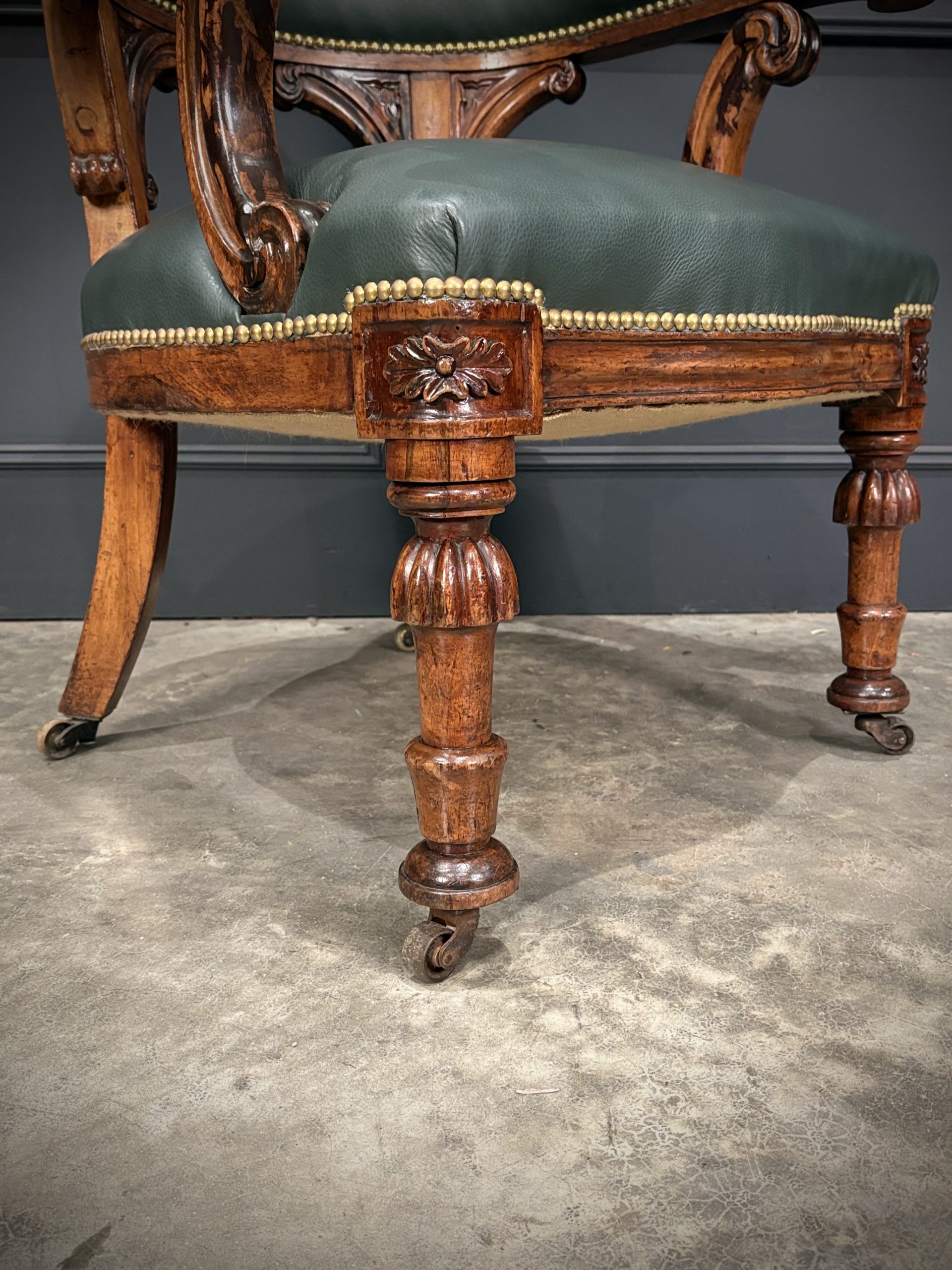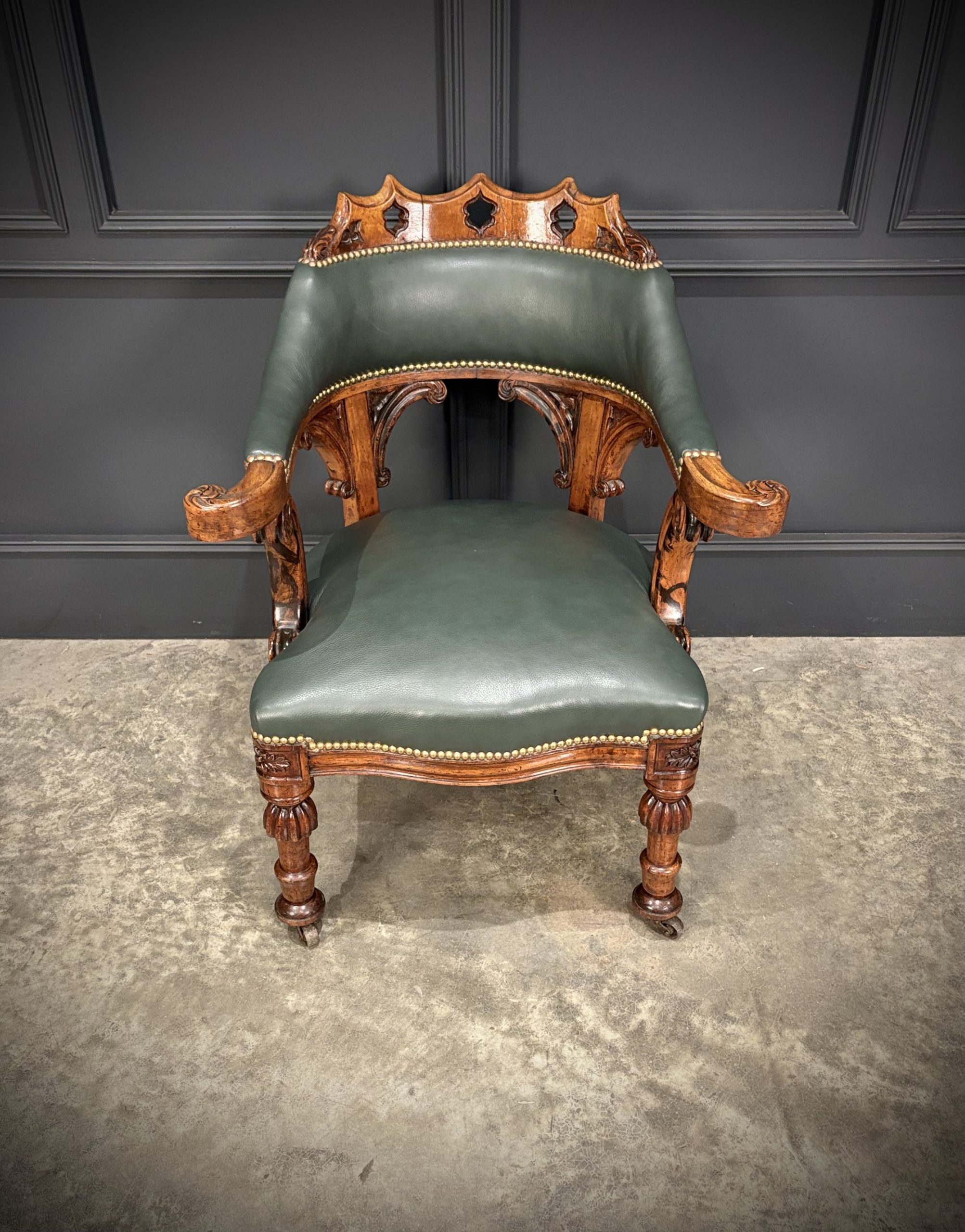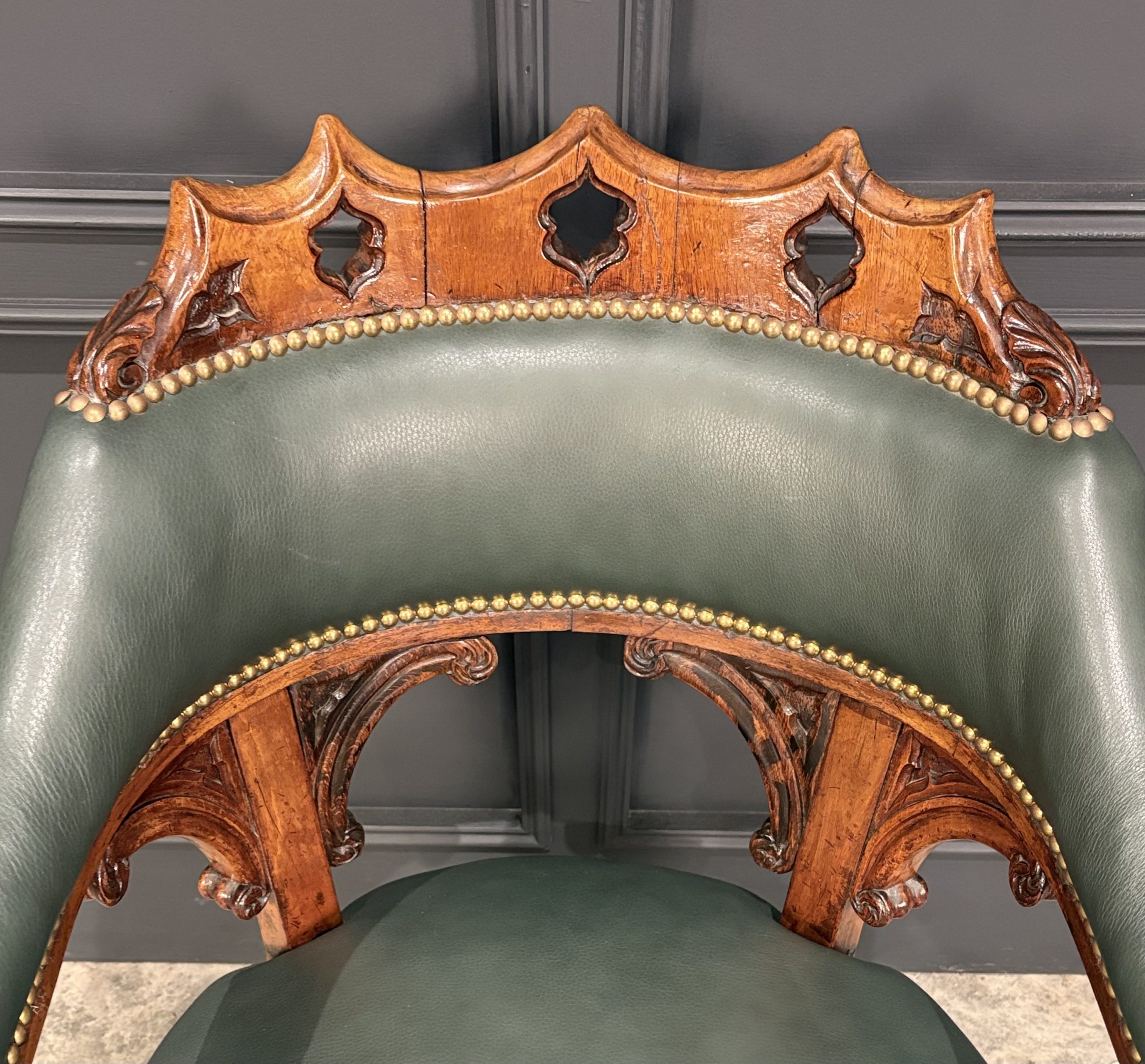 The chair features a beautifully pierced and carved walnut backrest above a deep green leather upholstered seat and back, finished with hand tacked brass studs.