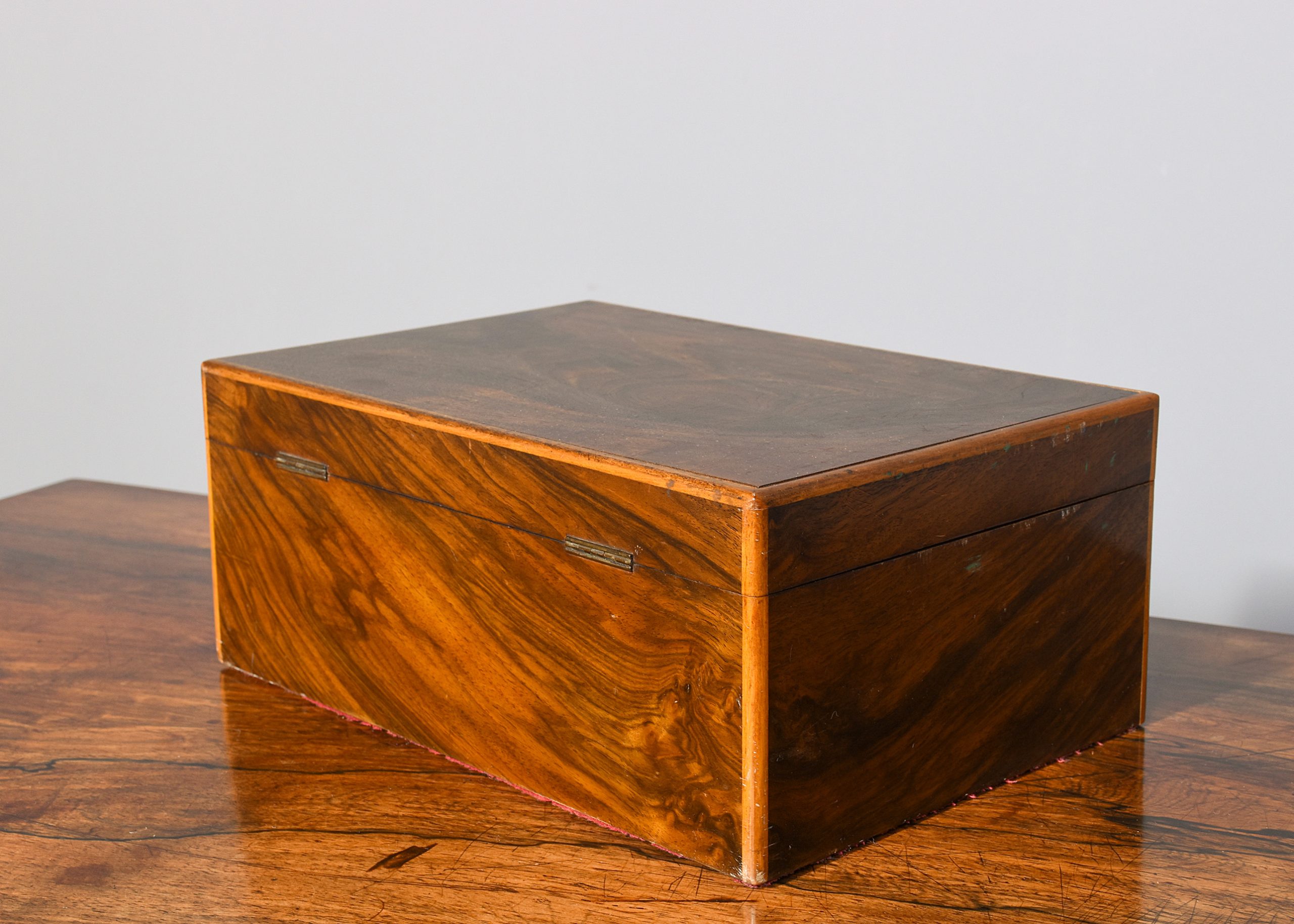 Circa 1880. A neat sized walnut sewing box, the rectangular box in lovely figured walnut with a half rounded mahogany fore-edge, the deep lid opens to reveal a polished interior with a lift out tray with multiple divisions, and beneath this uninterrupted space all filled with sewing items, the front with simple brass escutcheon, with working key, all of the fore edges framed in mahogany, with baize on the bottom. The box is in excellent colour and condition.